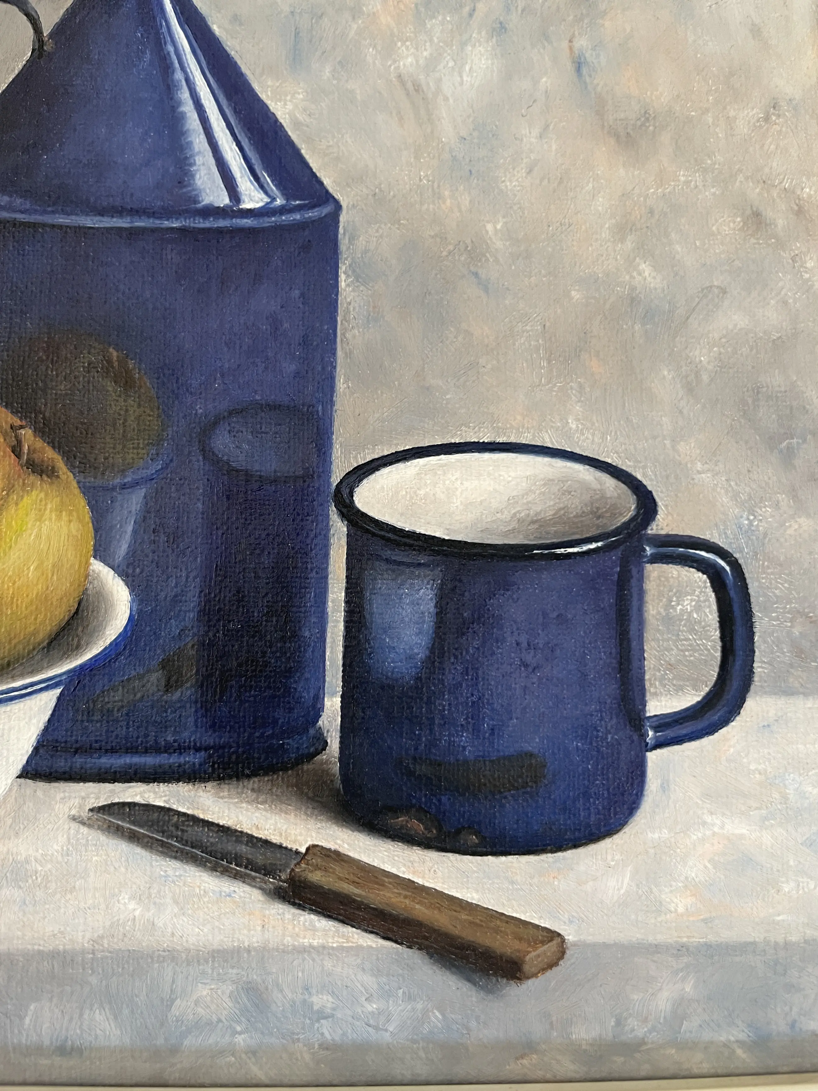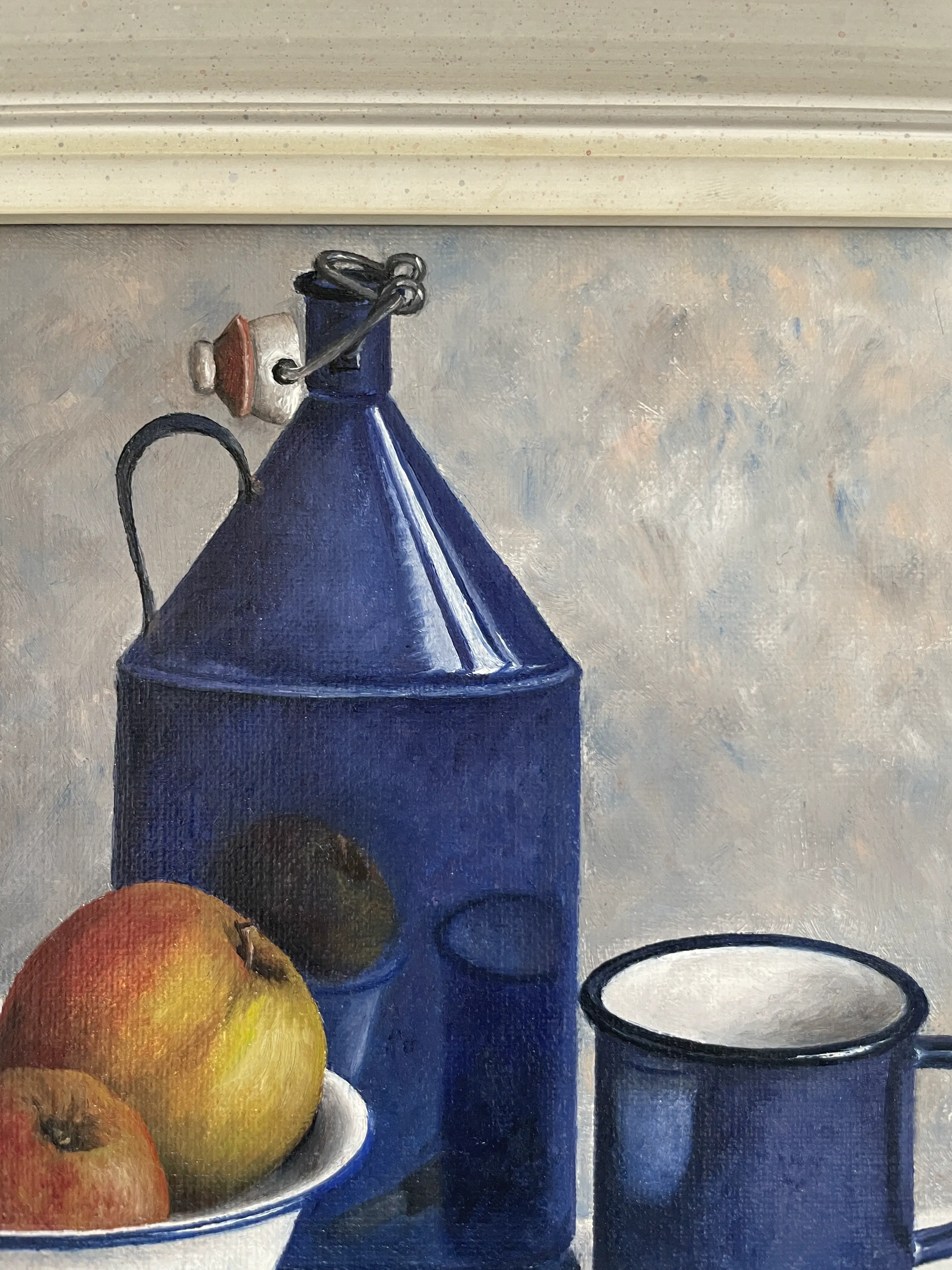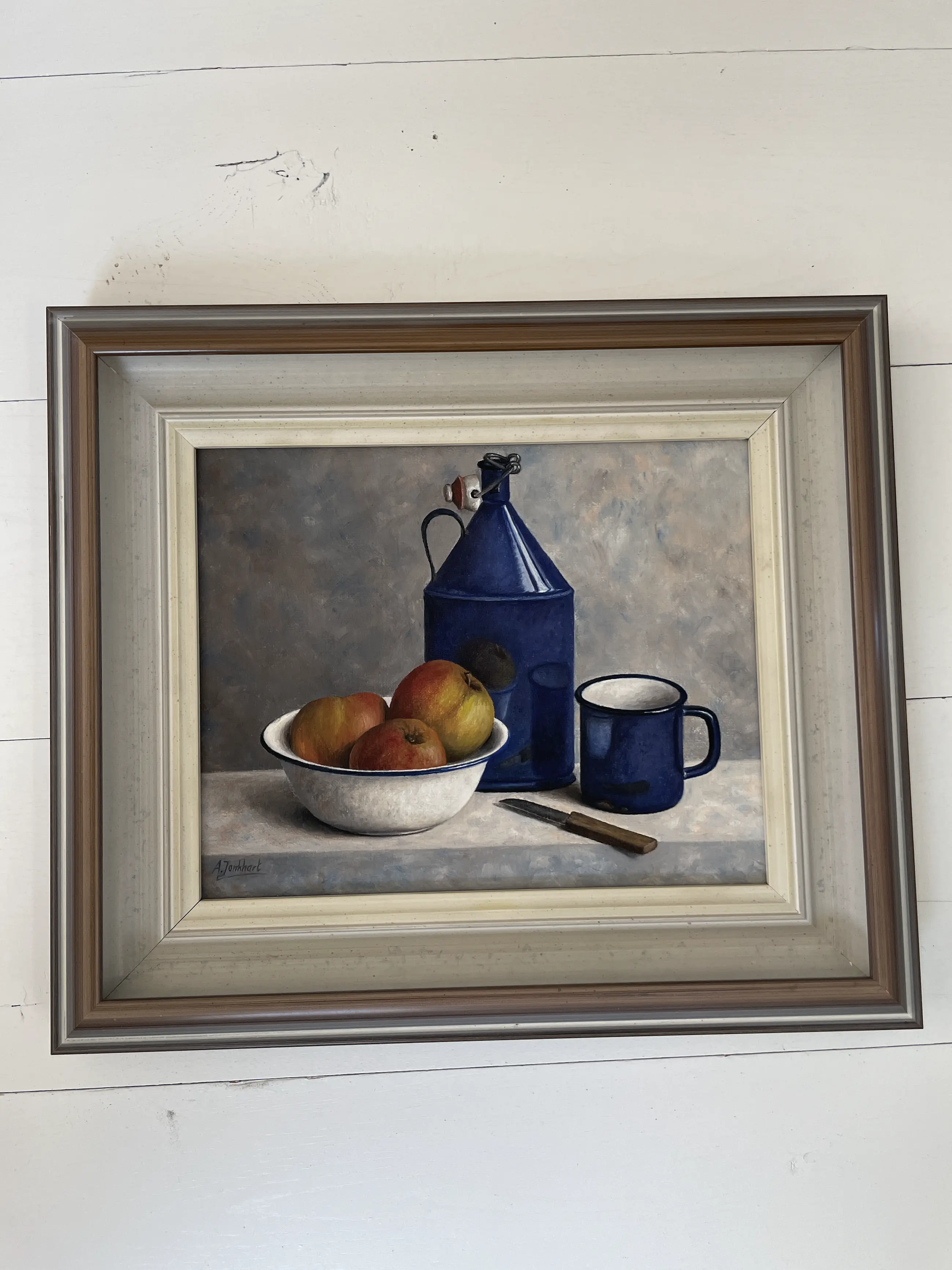 Stilleven van appels in een schaal, met blauwe mok, emaille fles en schilmesje met luxe en onbeschadigde lijst. Linksonder gesigneerd.