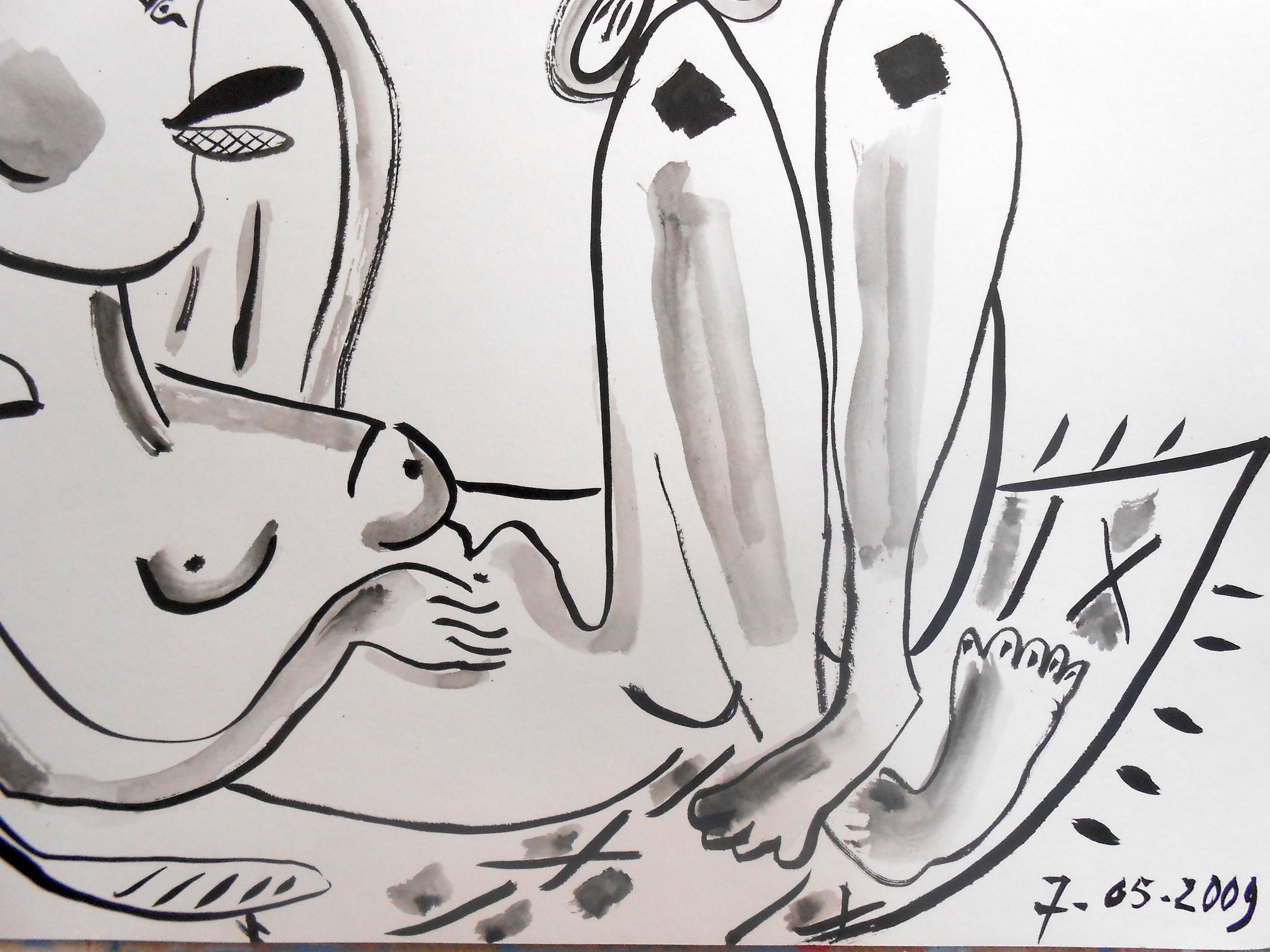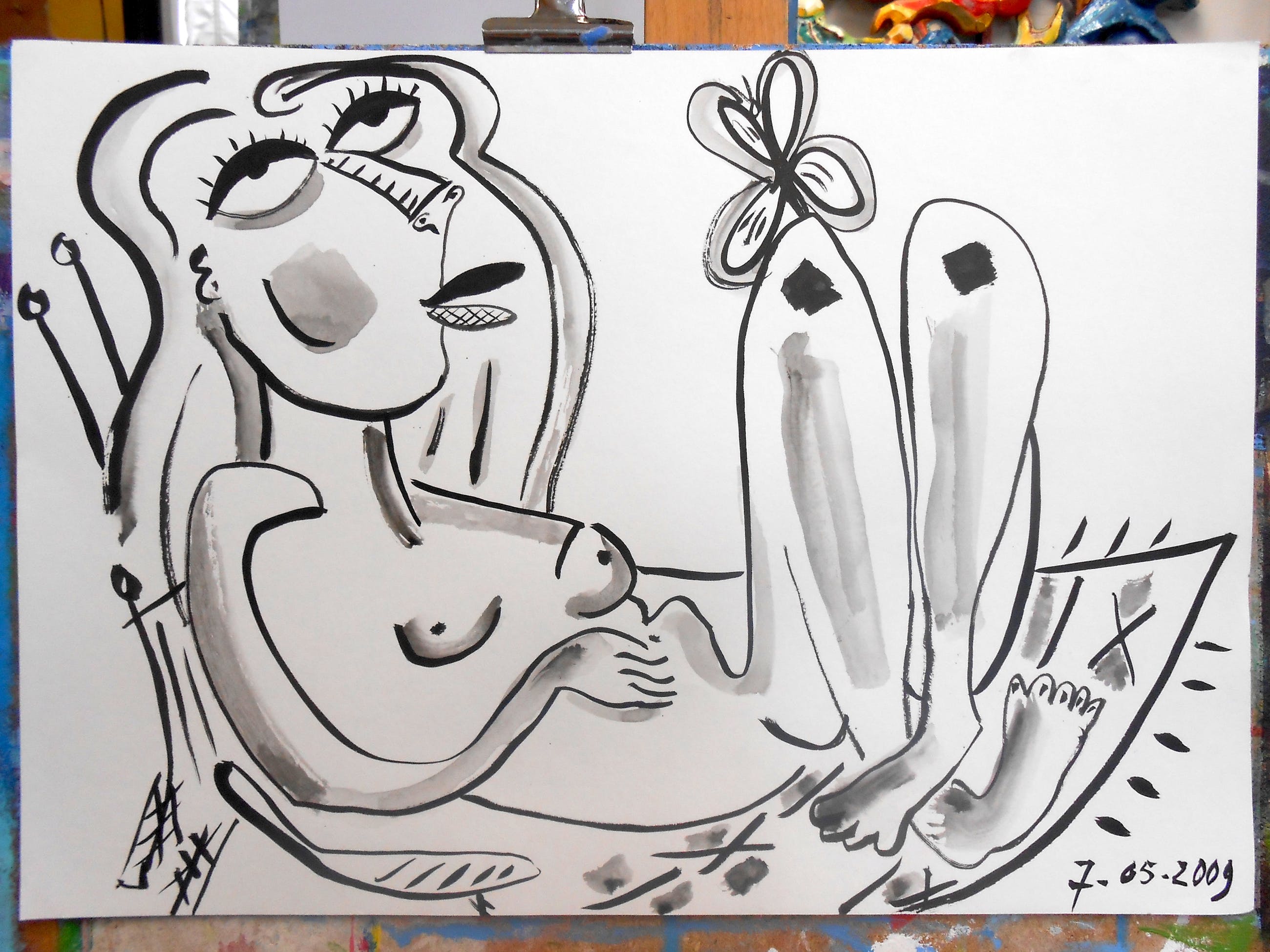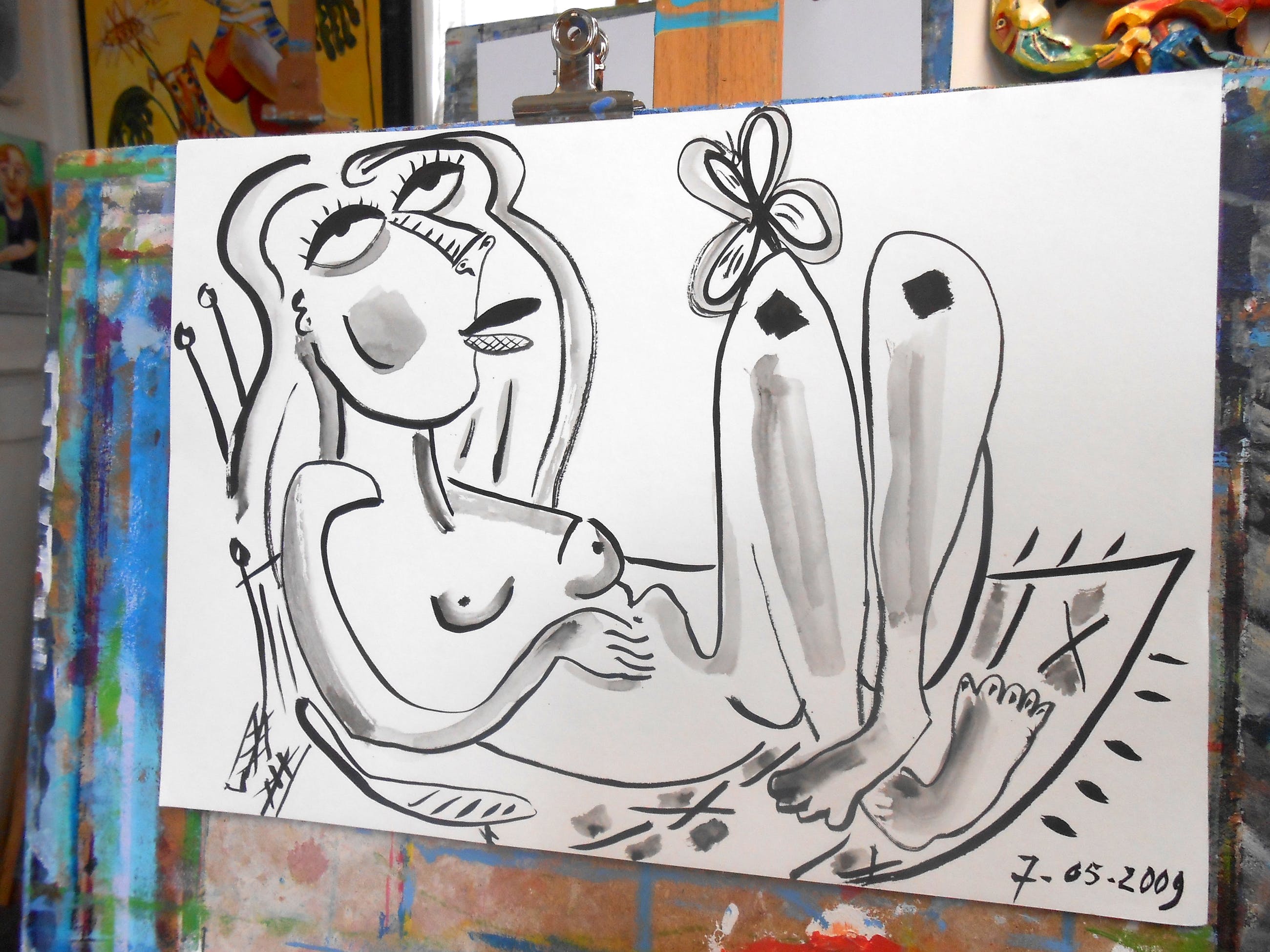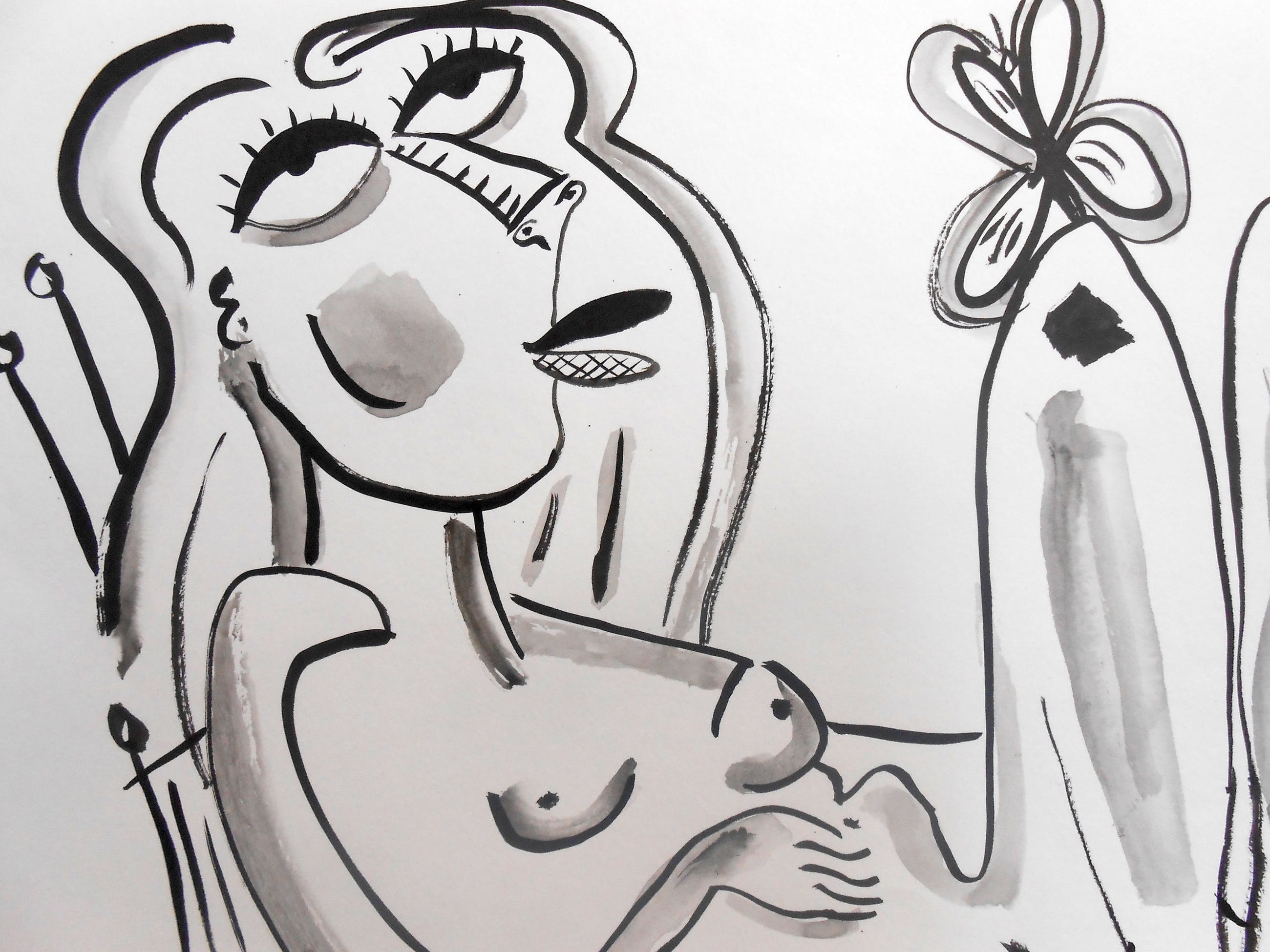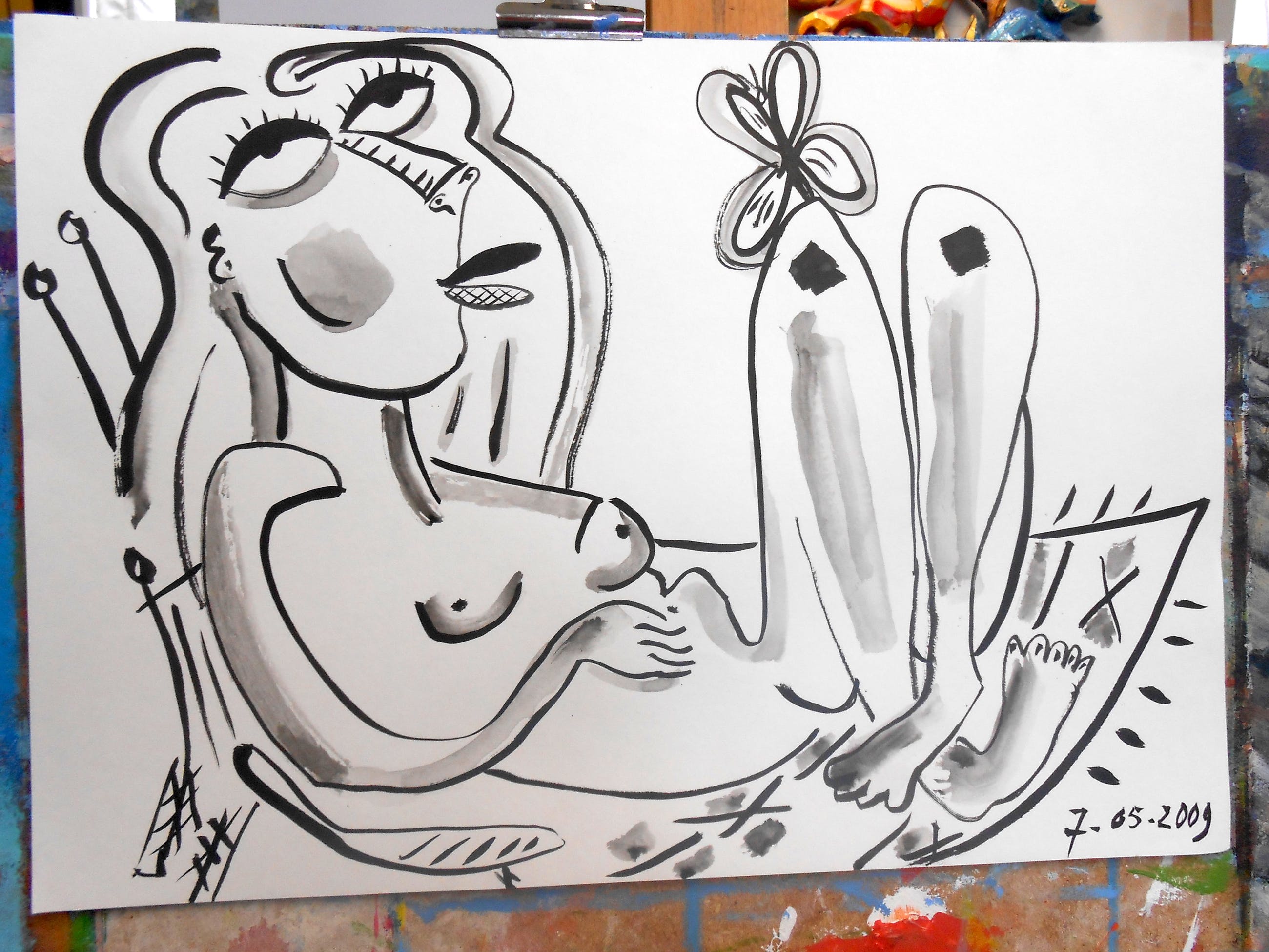 Tekening inkt op papier van ene jonge zonne badende vrouw die in verbazing naar een vlinder op haar knie kijkt