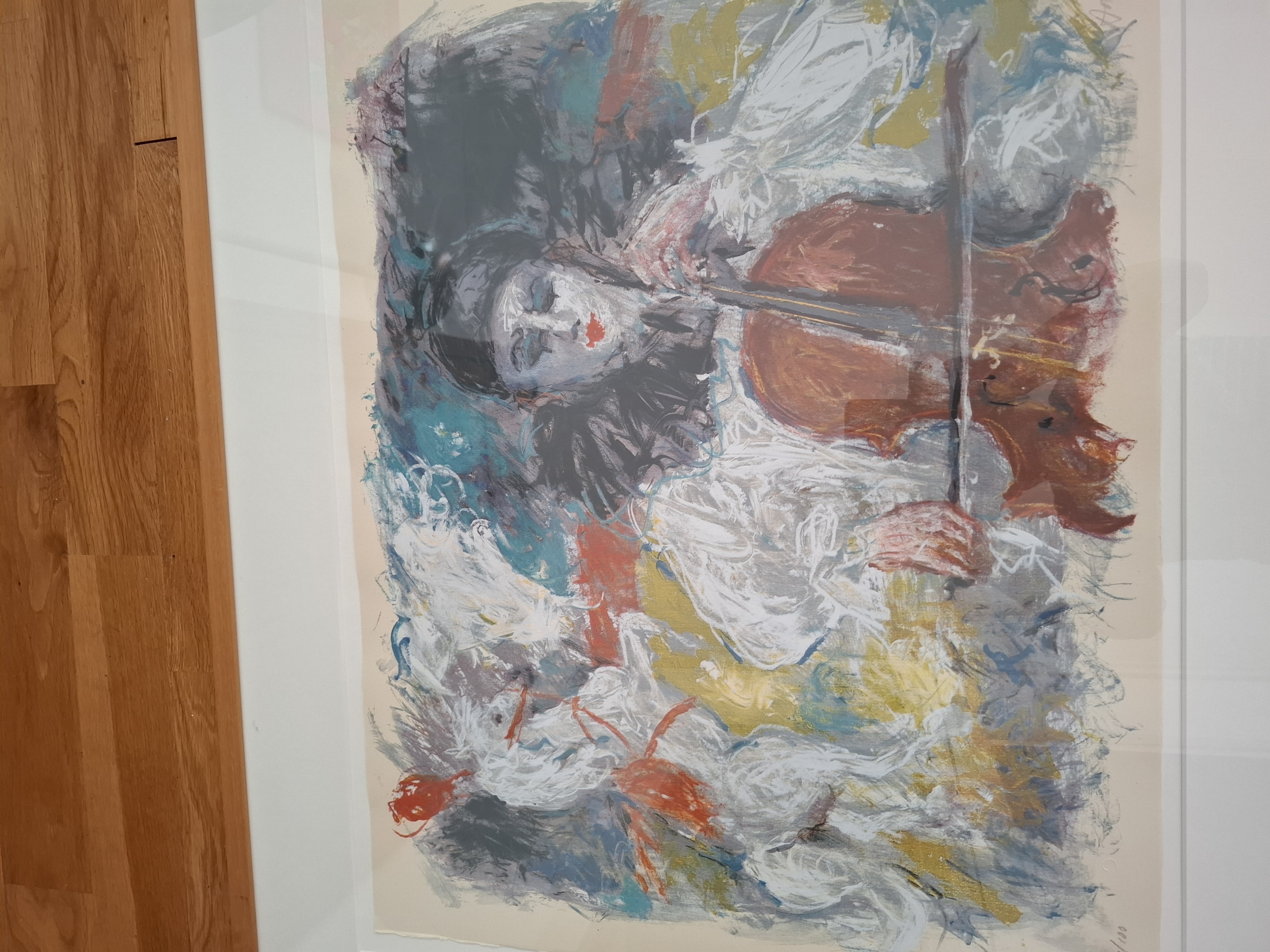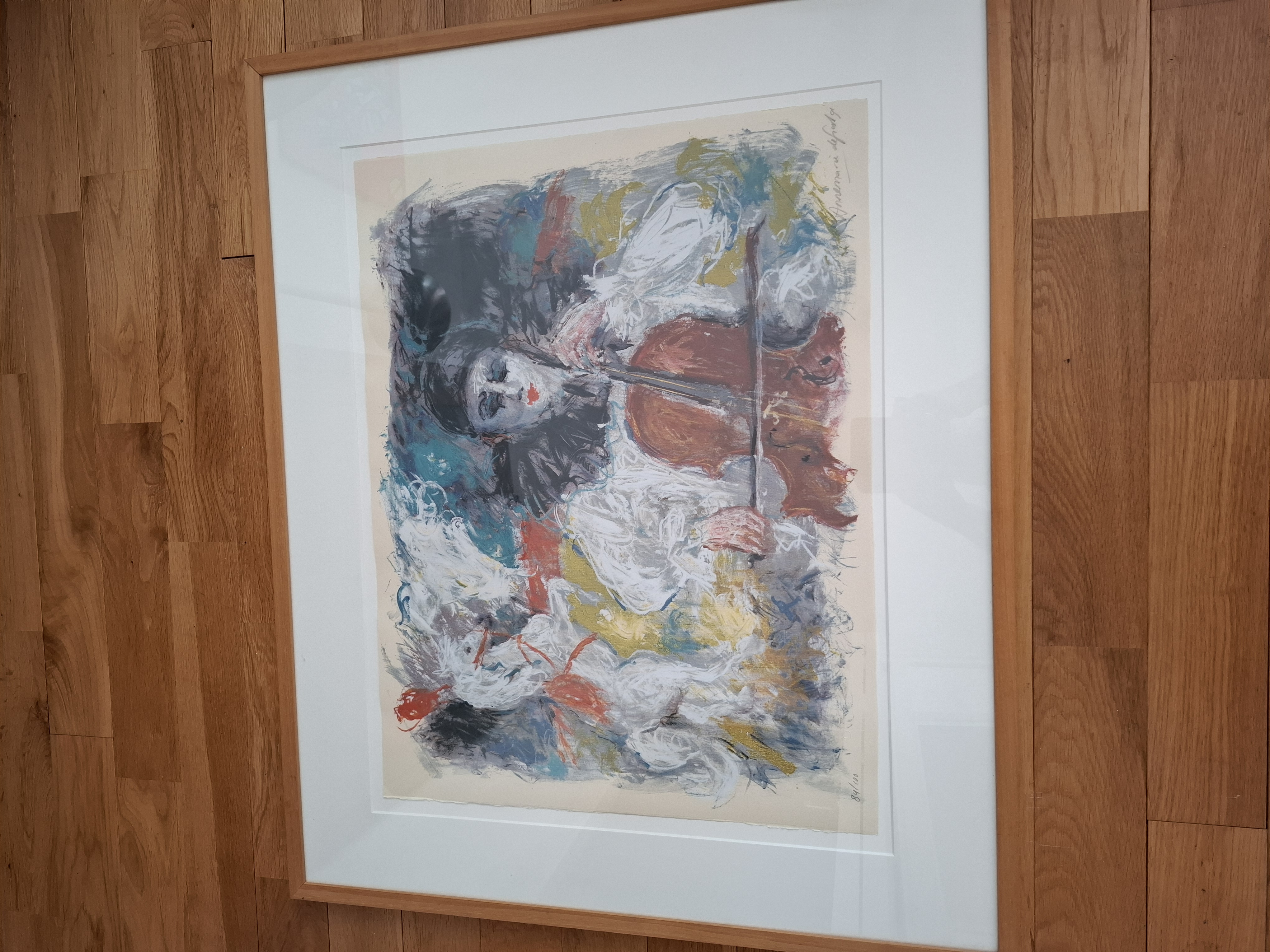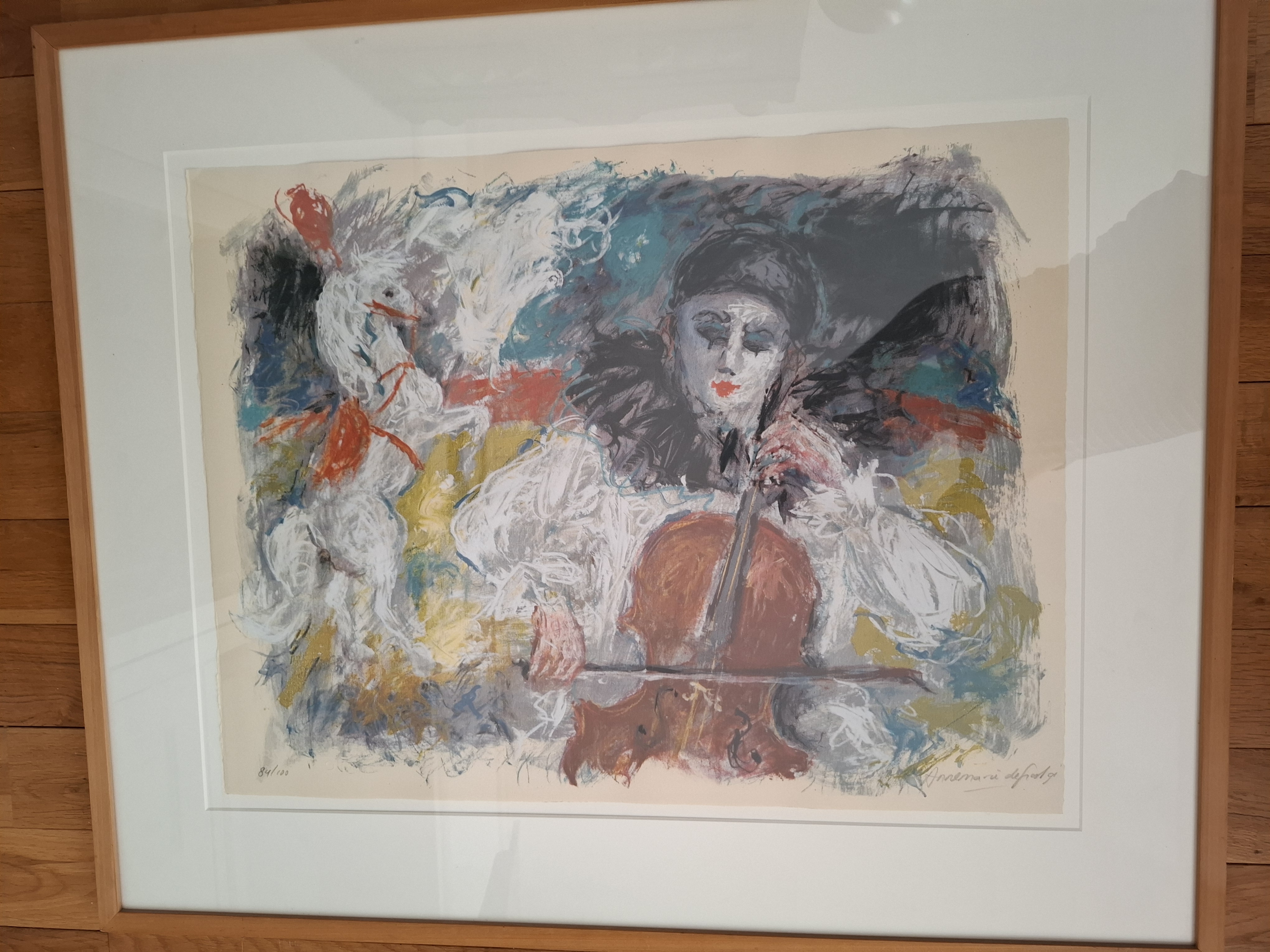 Prachtig kunstwerk. Circus. Kleurrijke impressie. Pierrot figuur met cello. Circuspaard op de achtergrond. Zeefdruk nr 84 van 100. Mooi ingelijst met passe partout.