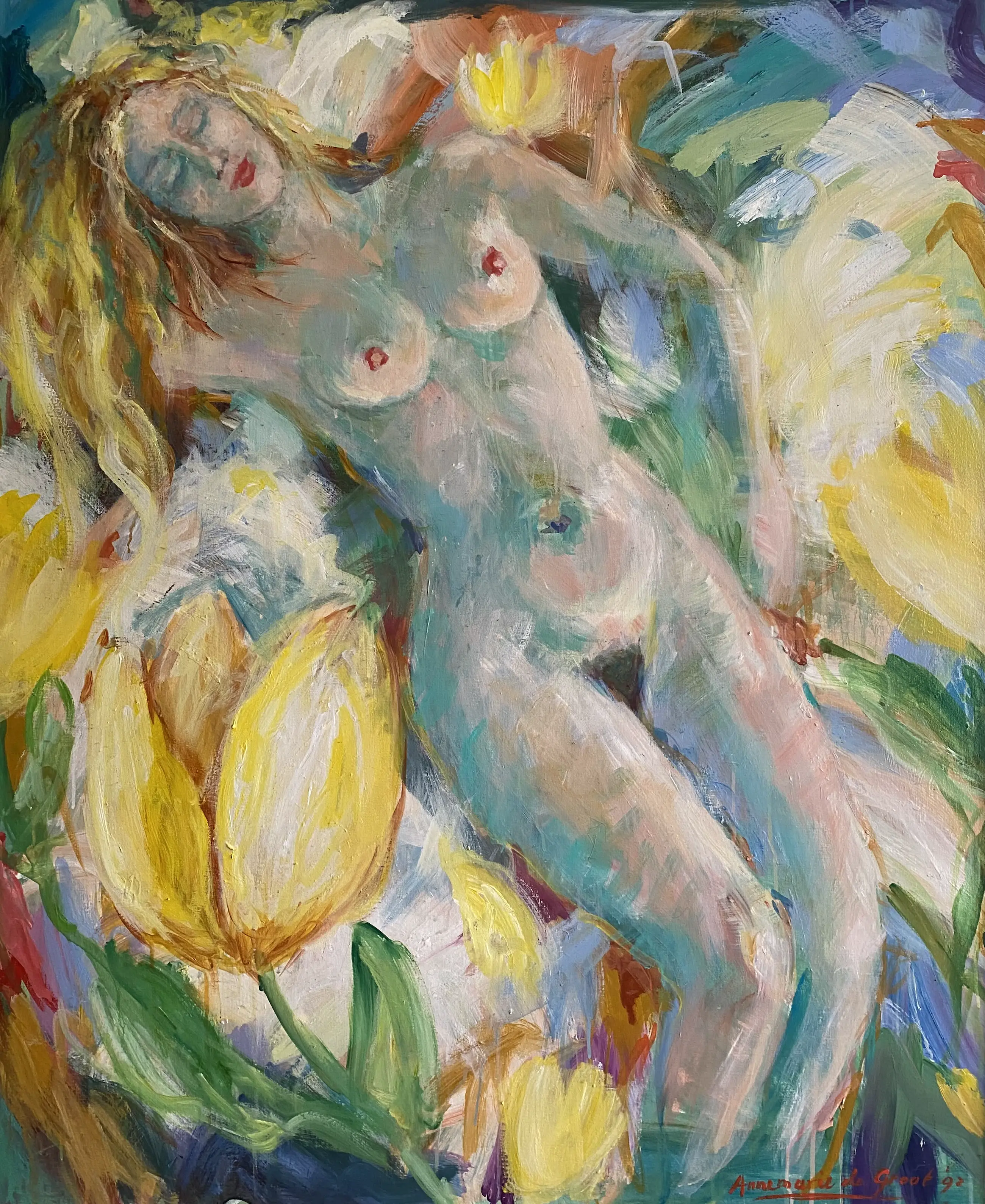 Een prachtig gesigneerd olieverf op canvas origineel schilderij, een vrouwelijk liggend naakt met tulp, van Annemarie de Groot uit 1992 te koop. Afmetingen ca. 120 x 100 cm en voorzien van originele, door kunstenaar geleverde, lijst. Destijds van Annemarie de Groot zelf gekocht.