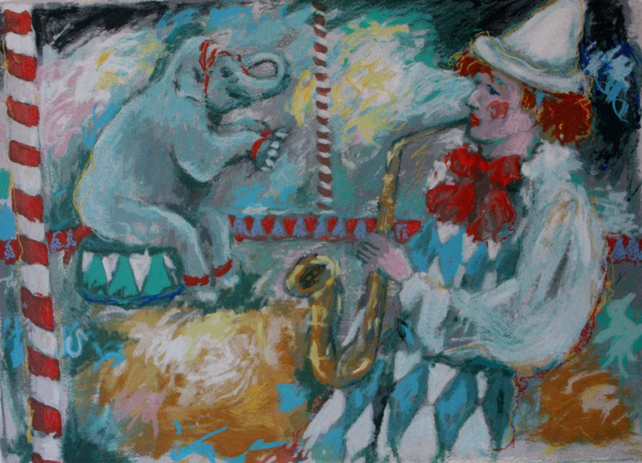 Sinds haar jeugd is ze gefascineerd door de wereld van het circus, theater, opera en cabaret. We vinden deze thema’s regelmatig in haar werk terug. Ballerina’s, muzikanten, cabaretske figuren, dieren; ze zijn in een bonte kleurenpracht op haar doeken te zien, geschildert in een wervelende toets laag over laag.