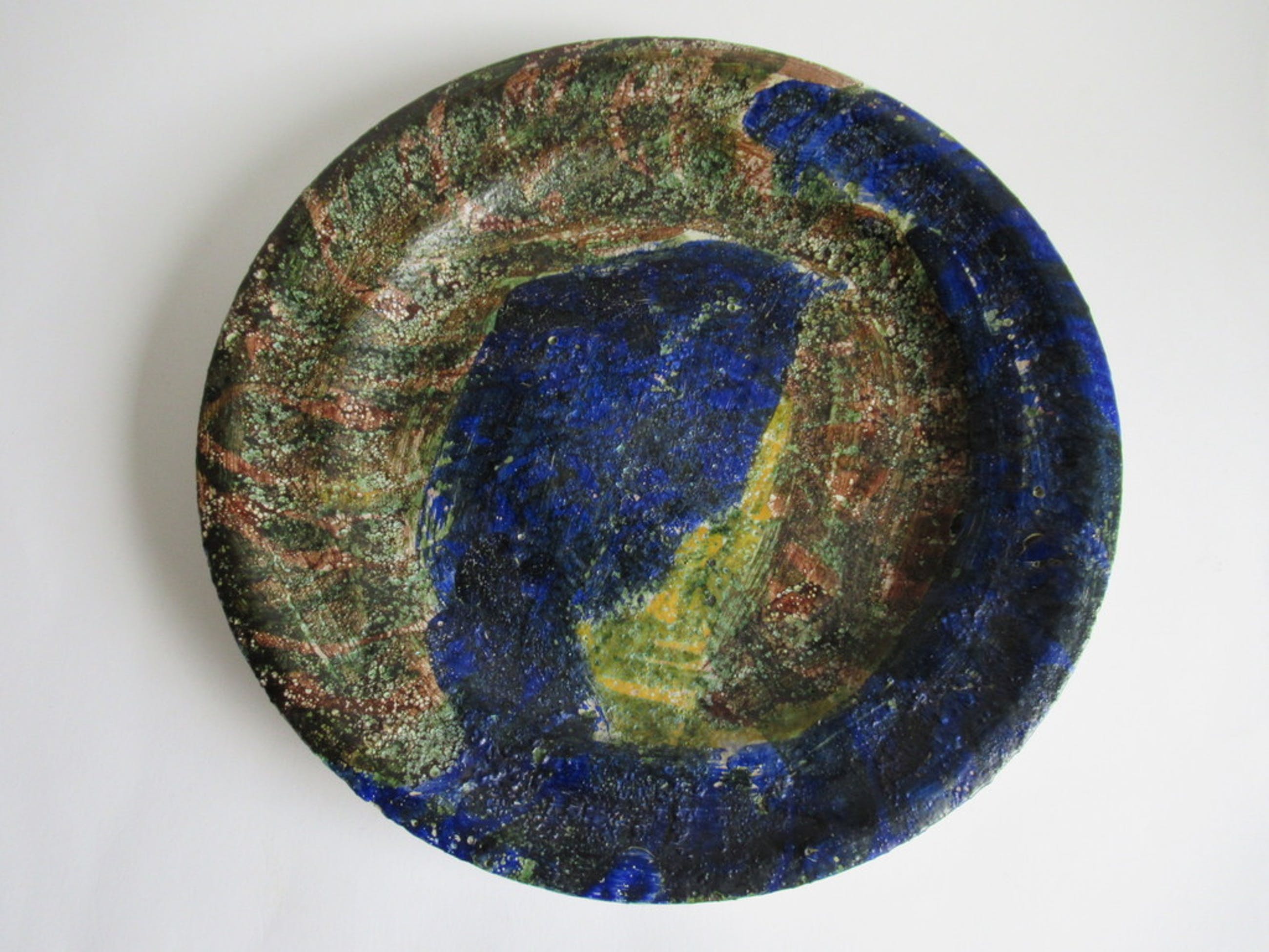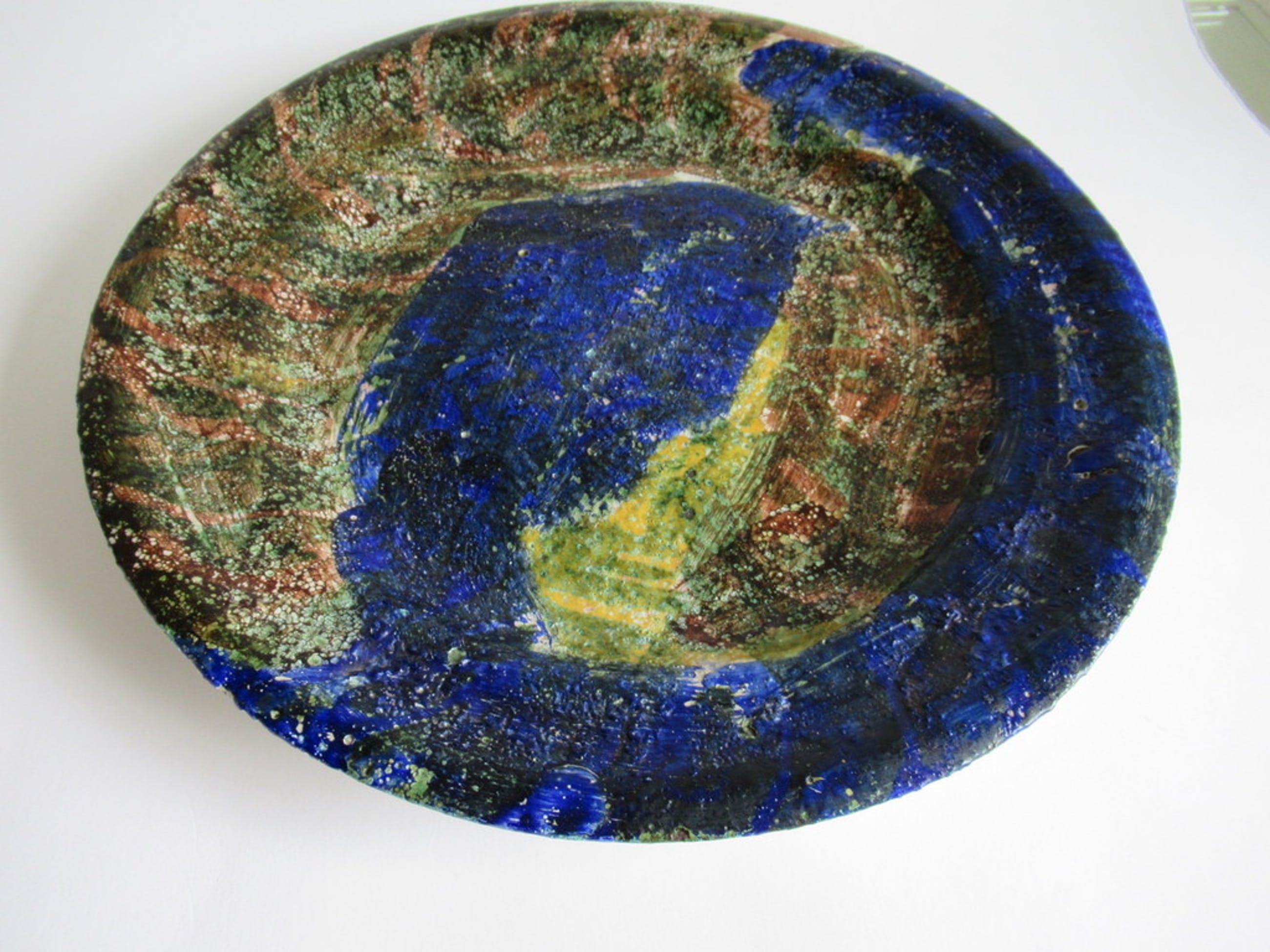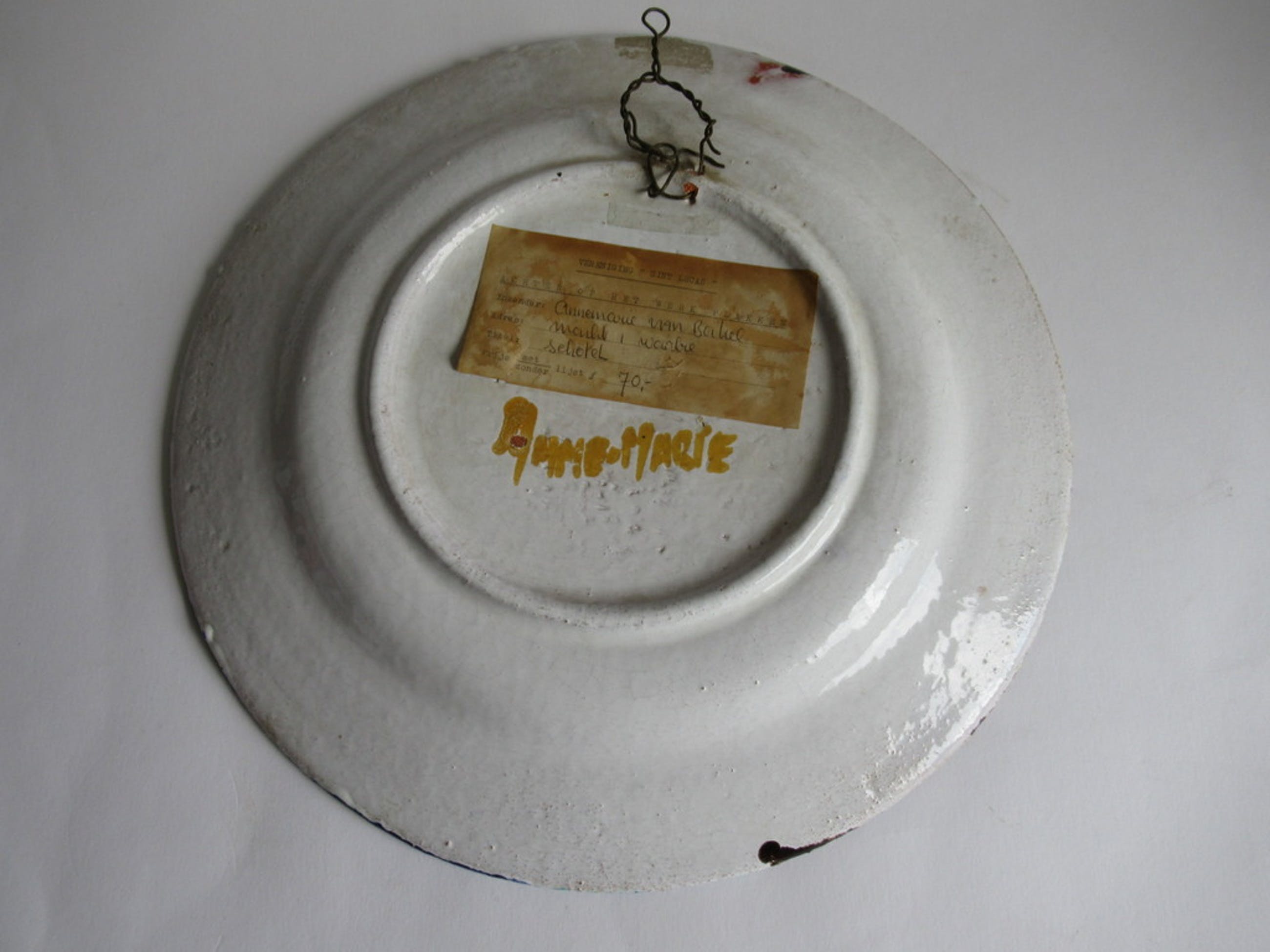 Bijzondere schotel gemaakt door Annemarie van Bakel, in de jaren zeventig. De schotel is indertijd verkocht via de bekende Amsterdamse kunstenaarsvereniging "Sint Lucas" waar de kunstenares lid van was.