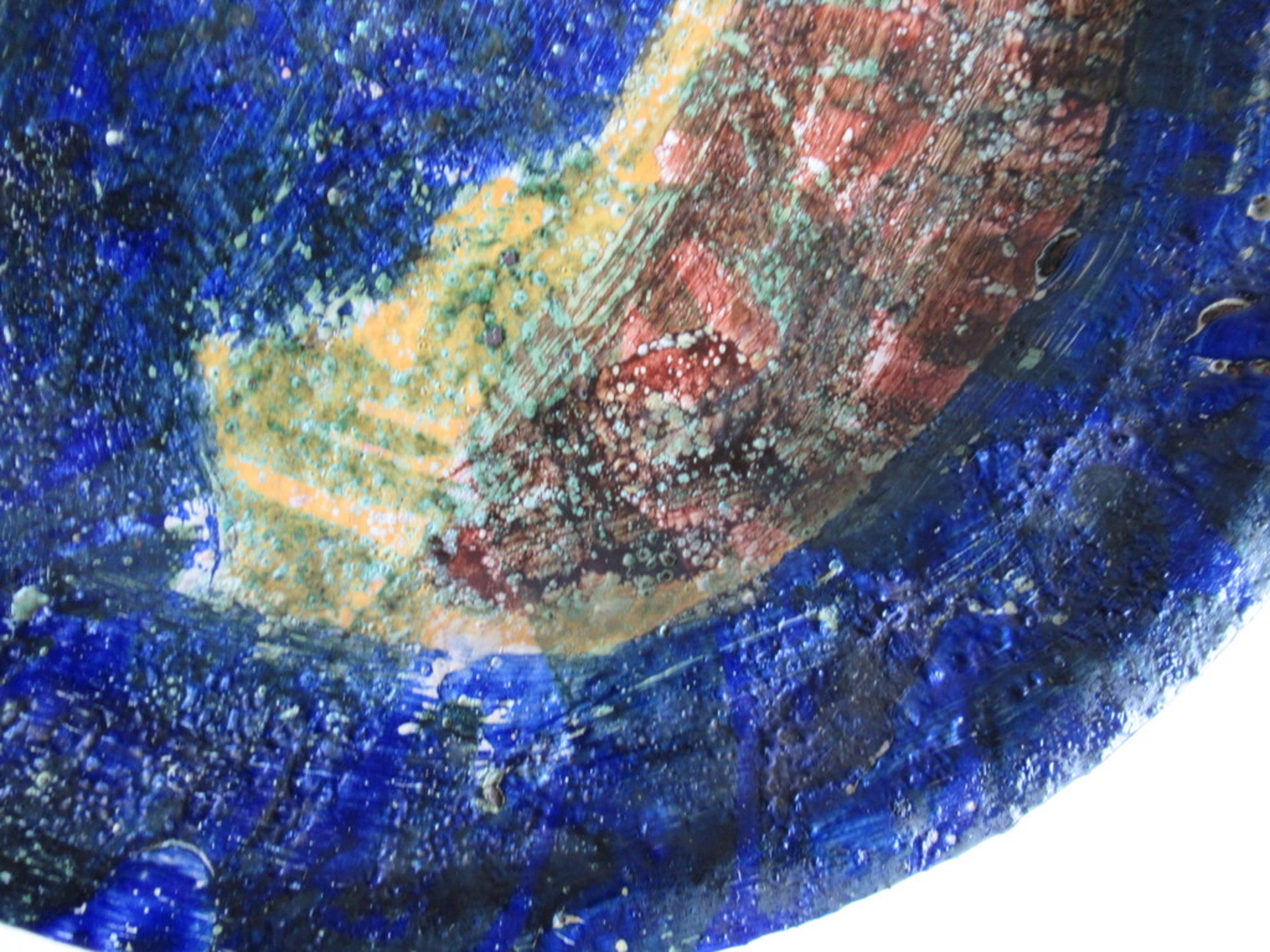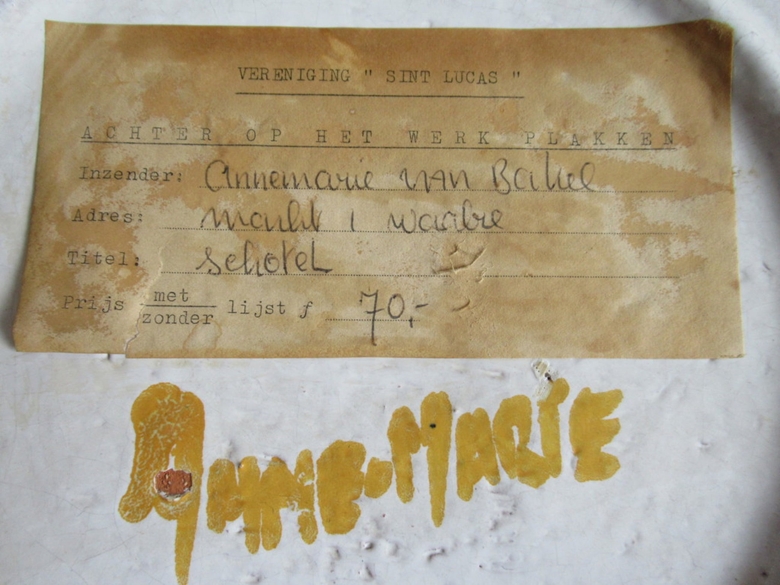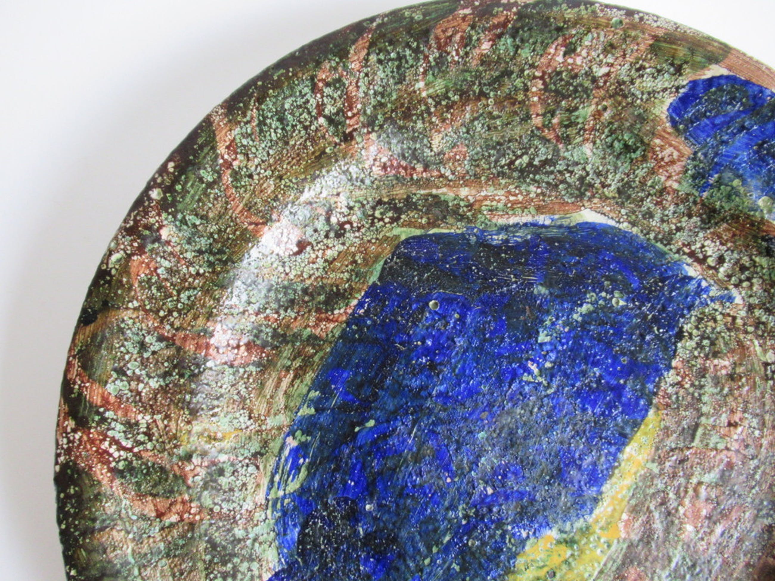 Bijzondere schotel gemaakt door Annemarie van Bakel, in de jaren zeventig. De schotel is indertijd verkocht via de bekende Amsterdamse kunstenaarsvereniging "Sint Lucas" waar de kunstenares lid van was.