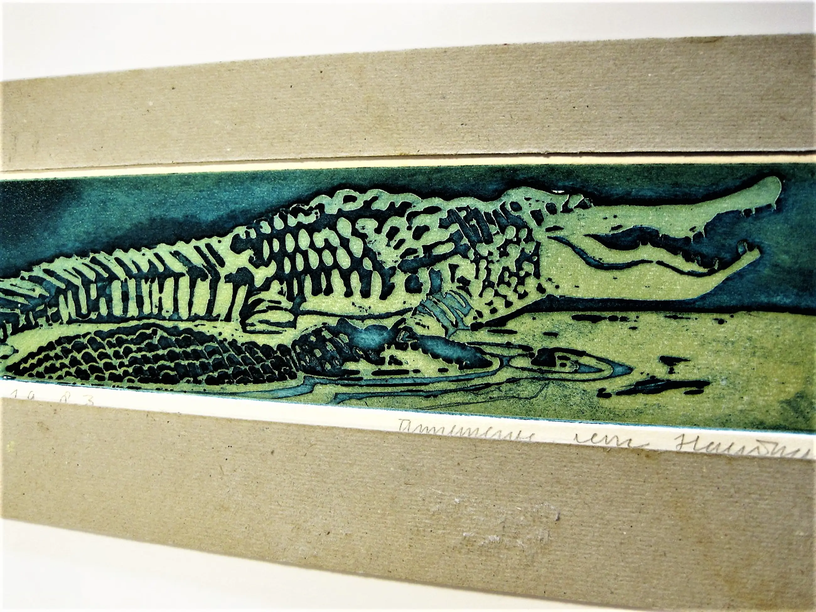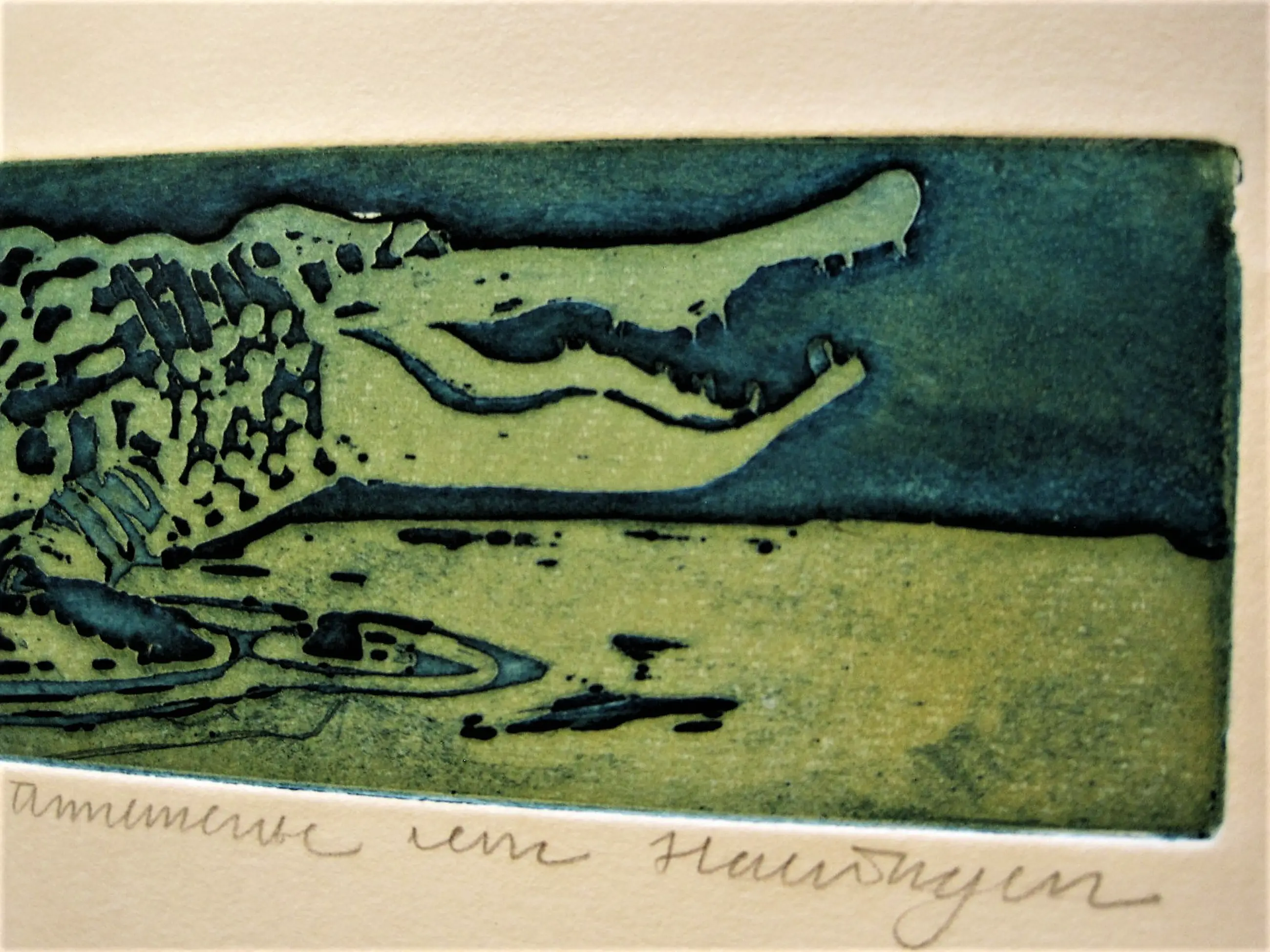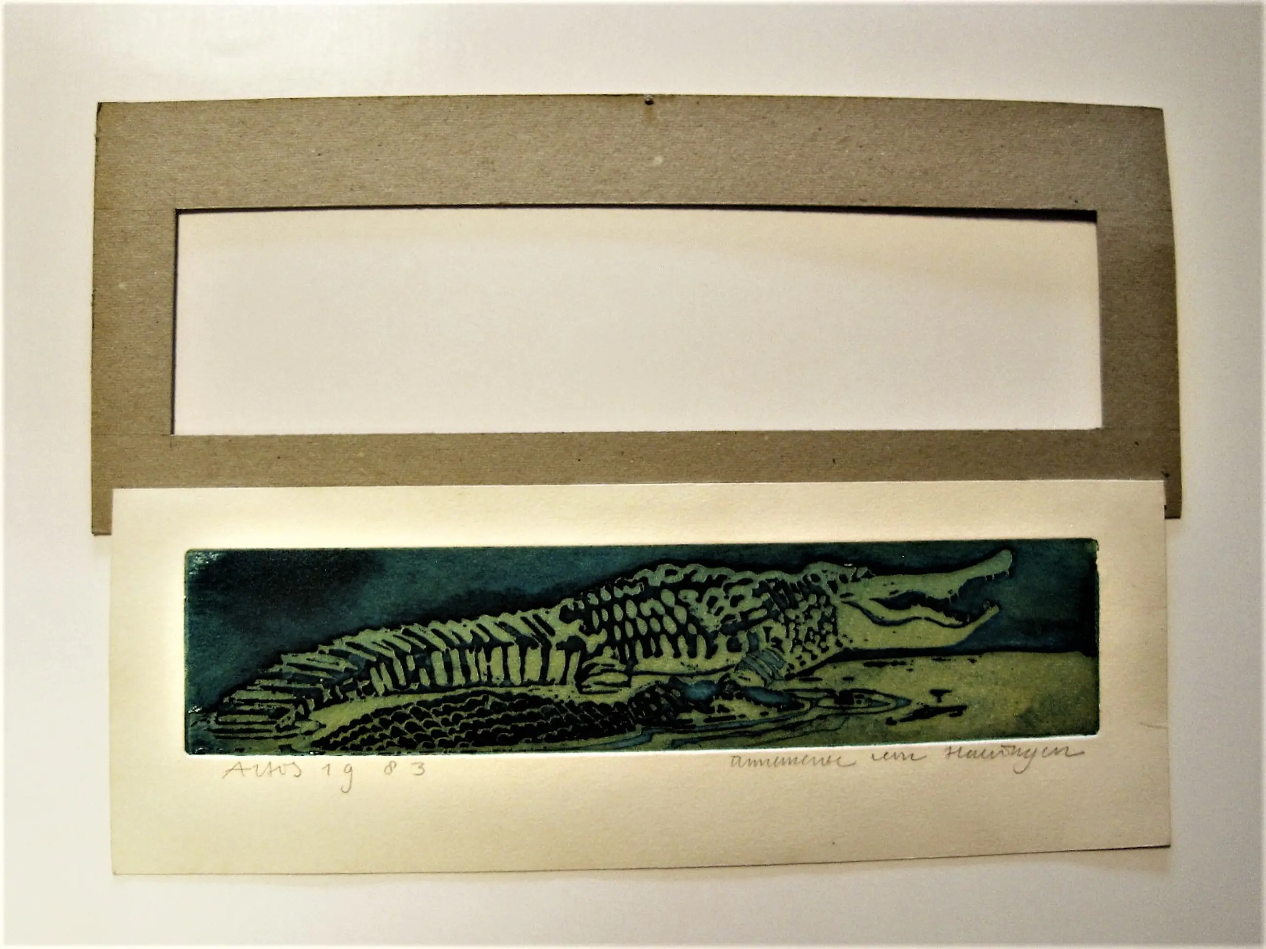 Unieke handgekleurde E.A. Ets "Krokodil - Artis 1983" gemaakt in de periode waarin Annemarie in de Amsterdamse dierentuin bekwaamde in het tekenen van verschillende dieren, die ze later dan weer voor haar bekende (kinder)boek illustraties gebruikte.