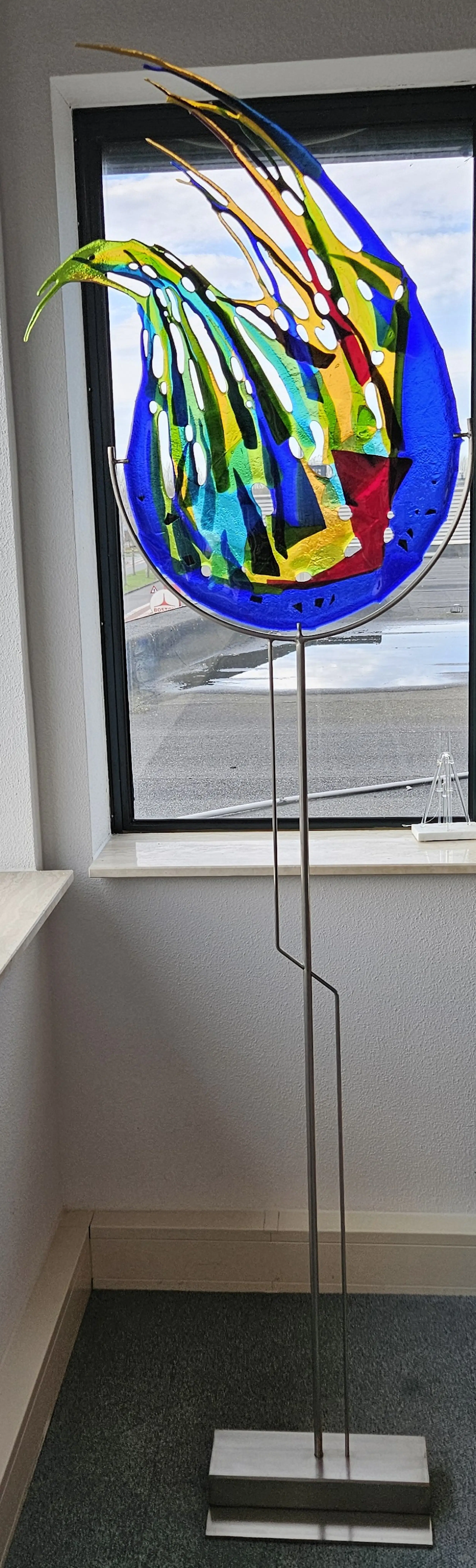 Glazen kunstwerk op roestvrij stalen voet. Het kunstwerk dient persoonlijk opgehaald te worden daar wij het niet verpakken.