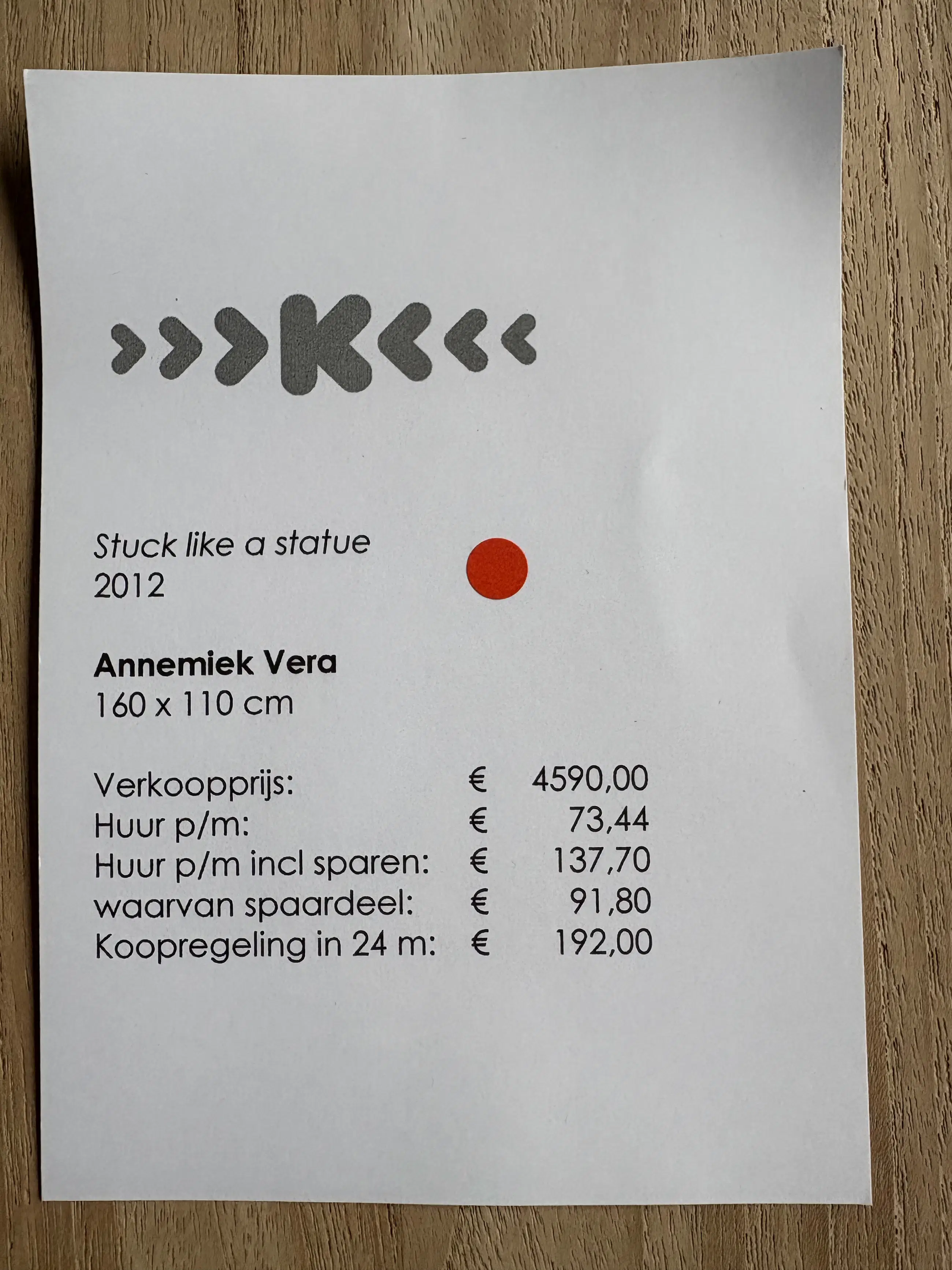 Het schilderij is sinds 2019 in mijn bezit via de Kunstuitleen Utrecht en is in goede staat. Vanwege een nieuwe inrichting van het huis heb ik besloten dit schilderij te verkopen.