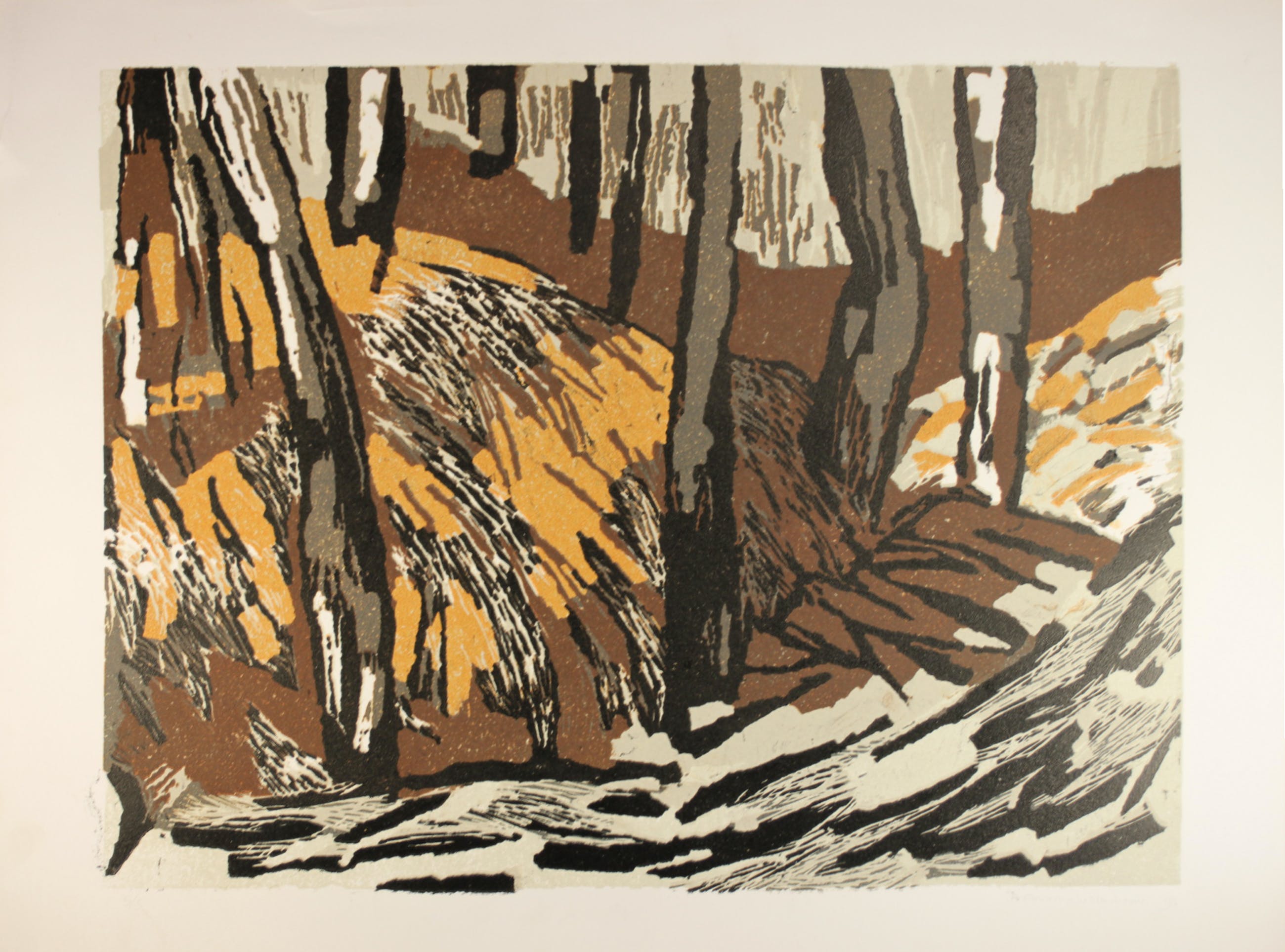 Zicht op een bosrand waarschijnlijk in de herfst. Neergezet met sterke lijnen eigen aan het expressionisme toegepast op houtsnede.