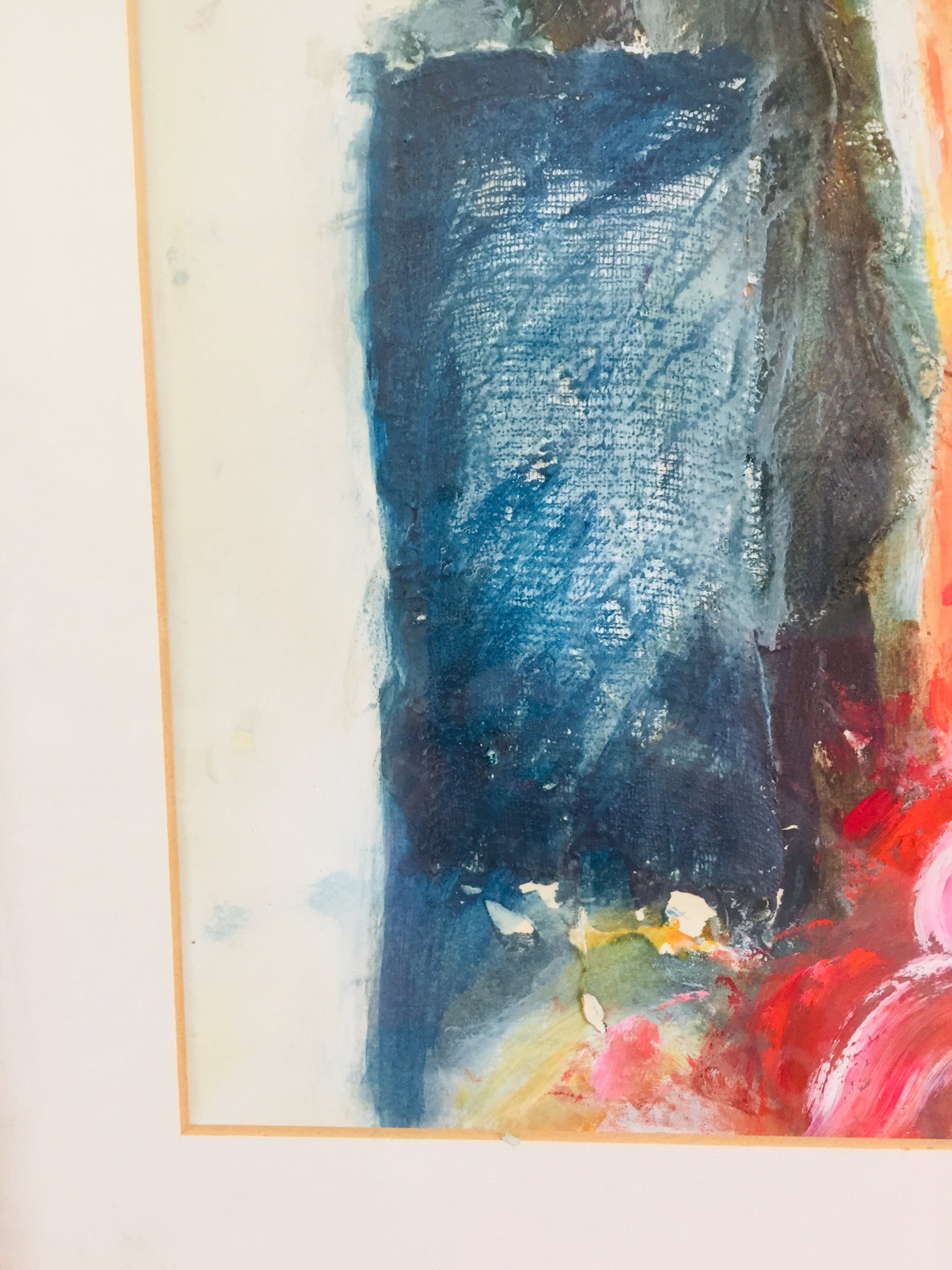 De lijst is prachtig op enkele gebruikssporen na. Het werk zelf is in zijn geheel ook zeer mooi, maar omdat het een collage betreft zijn enkele plekjes op het werk afgebladerd (zie foto’s).