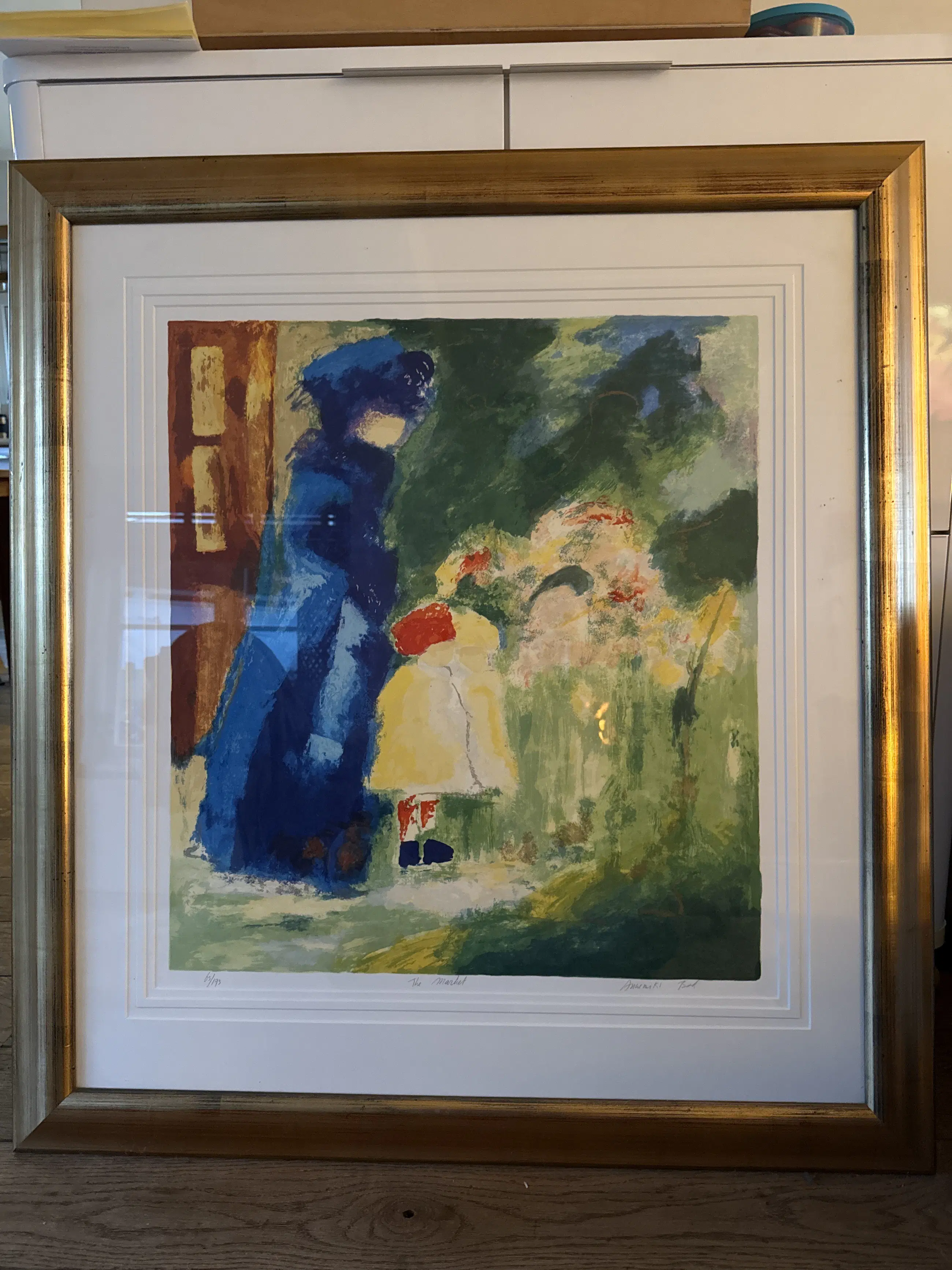 De zeefdruk is professioneel ingelijst in een elegante, goudkleurige lijst met een dubbele passe-partout, wat het werk extra diepte en uitstraling geeft. De lijst verkeert in uitstekende staat en is direct klaar om opgehangen te worden.