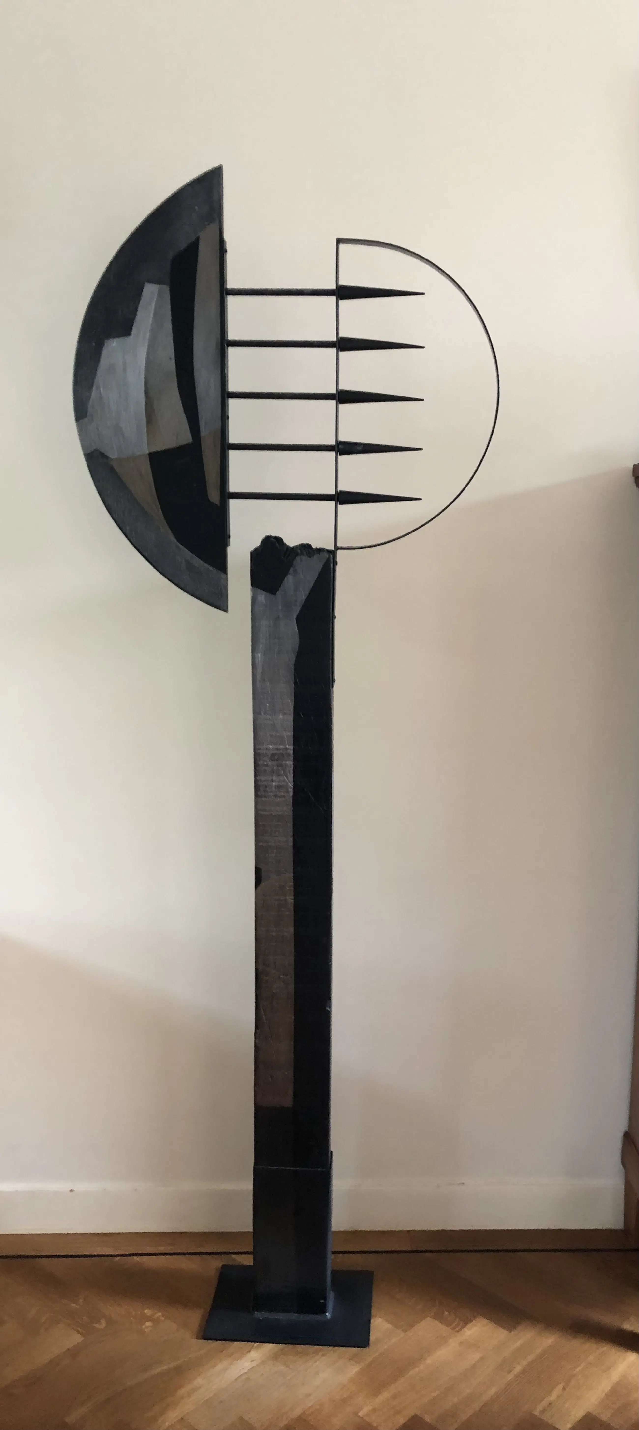 Grenspaal van Annet gekocht in 1998 via Galerie de pook in Hengelo. Aankoopnota is er. Het kustwerk heet: anderzijds hout rubber en ijzer. Het thema is grenzen.
