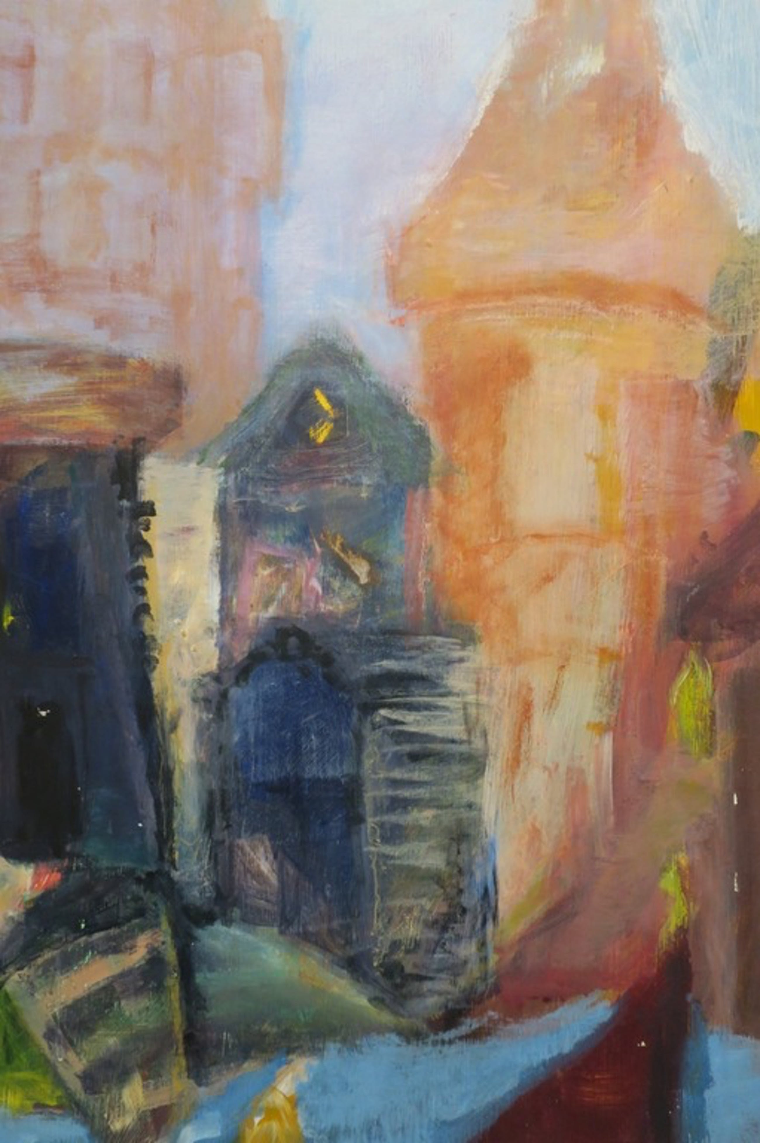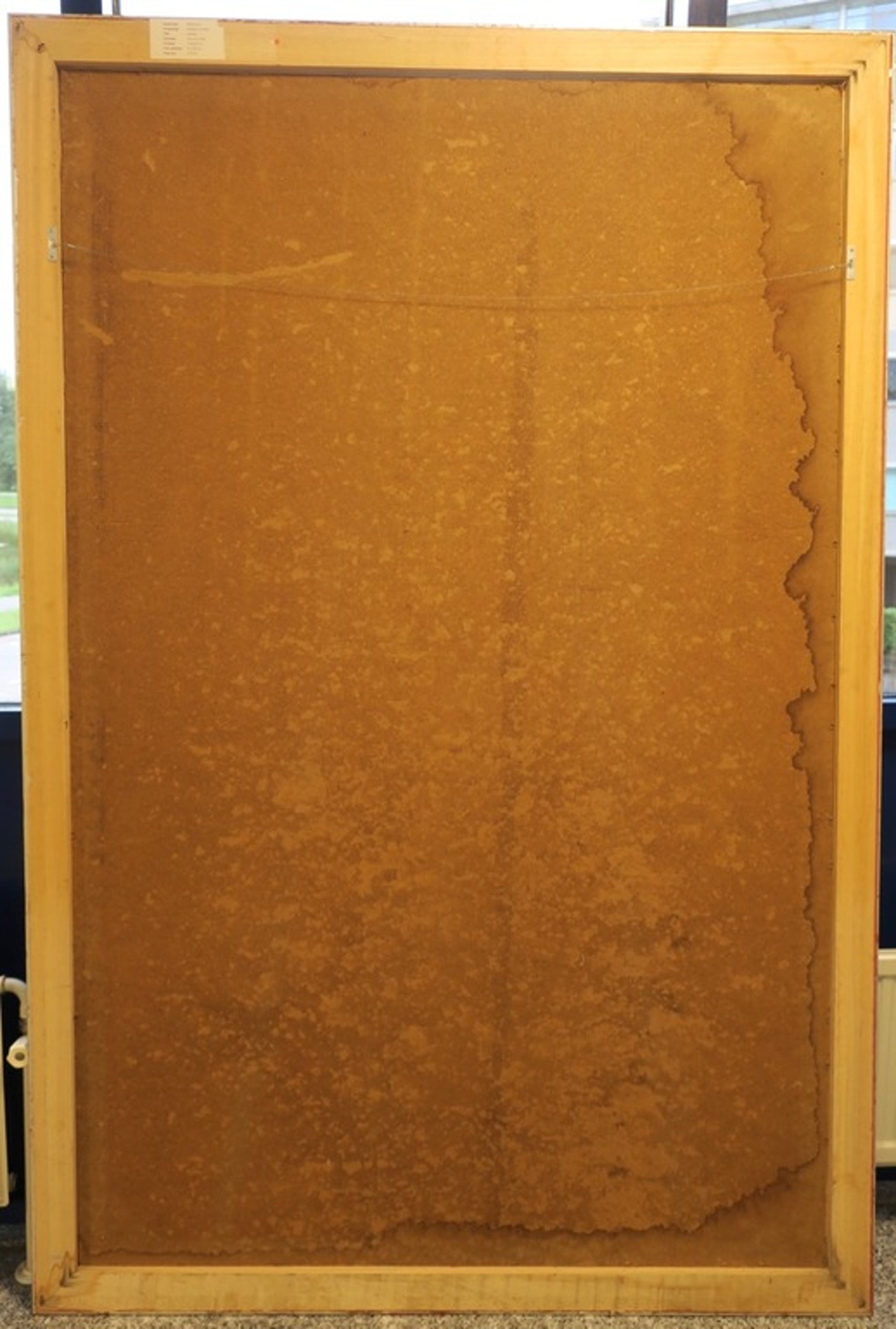 Conditie kunstwerk: In goede staat, maar met wat beschadigingen/verfverlies langs de randen en in de hoeken van het werk, verder nog een aantal stukjes verfverlies in het werk (zichtbaar op de detailfoto's) en het werk sluit niet naadloos aan het werk in de bovenrand.