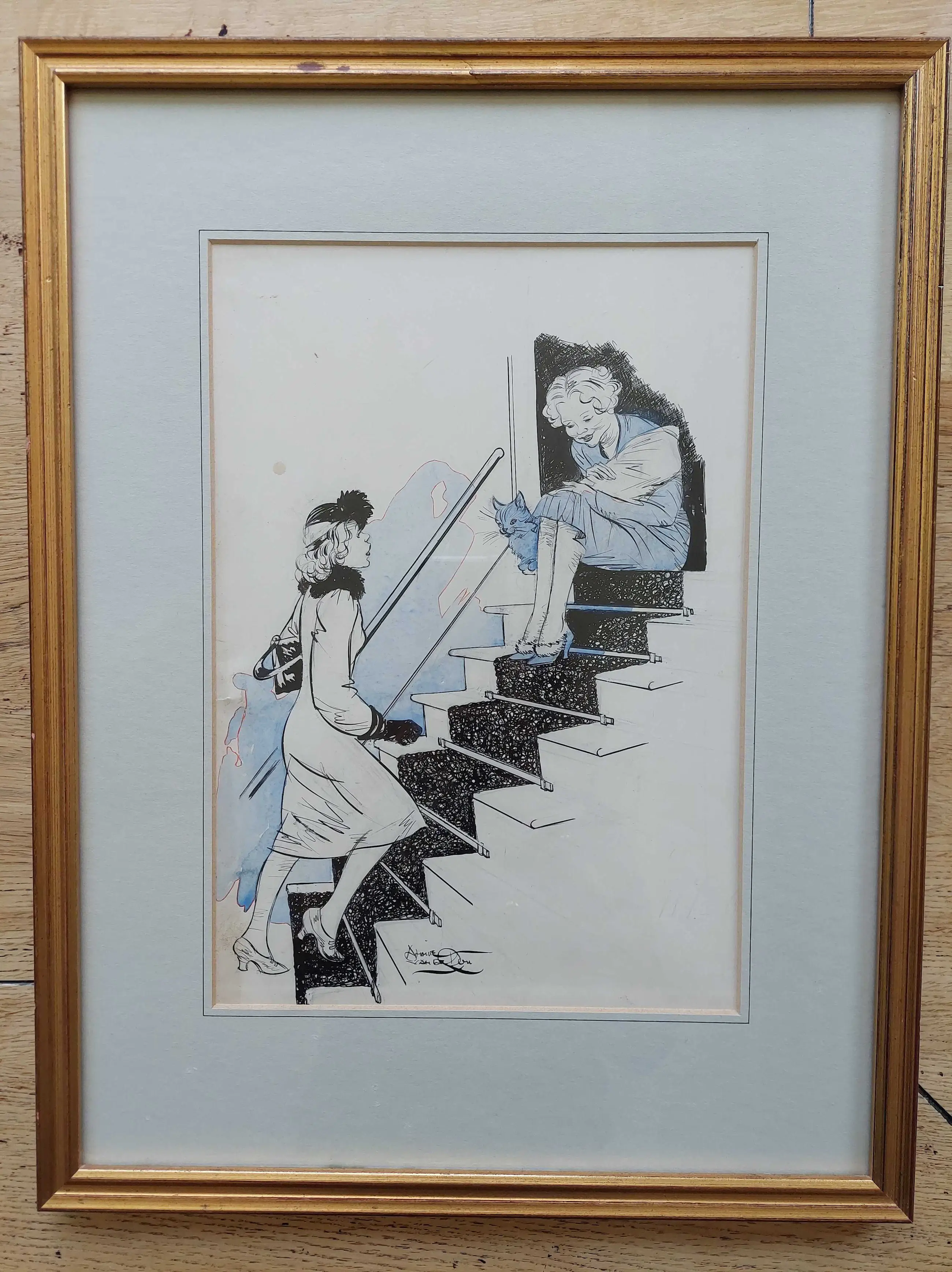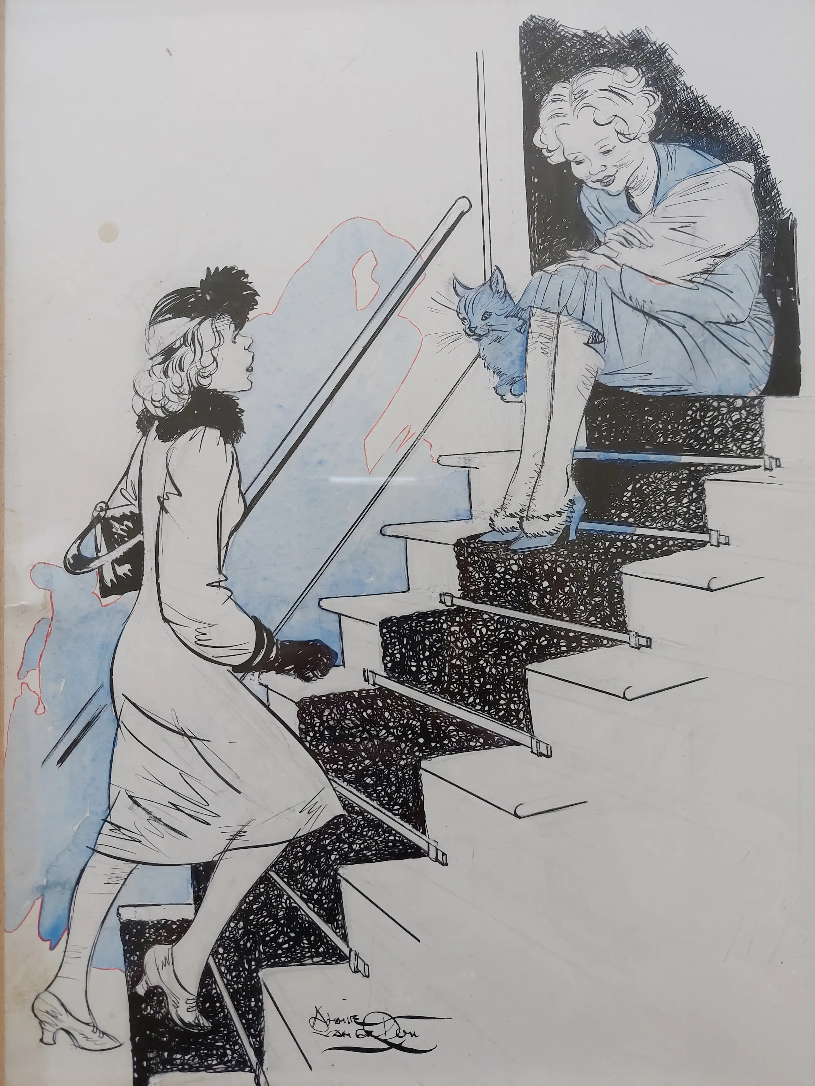 Sierlijke pentekening met Oostindische inkt op papier. Vlak op achtergrond is aangezet met aquarel-blauw.