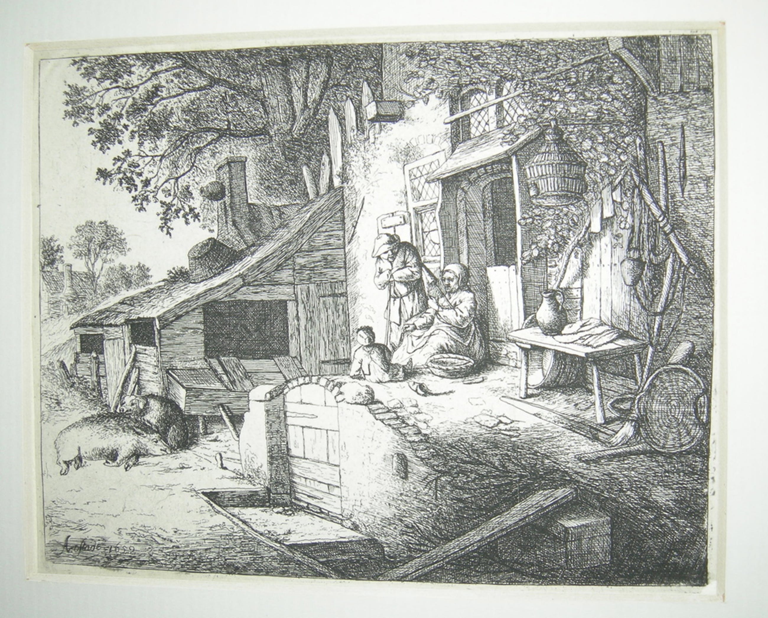 mooie uitgewerkte ets naar Adriaan van Ostade, De Spinster