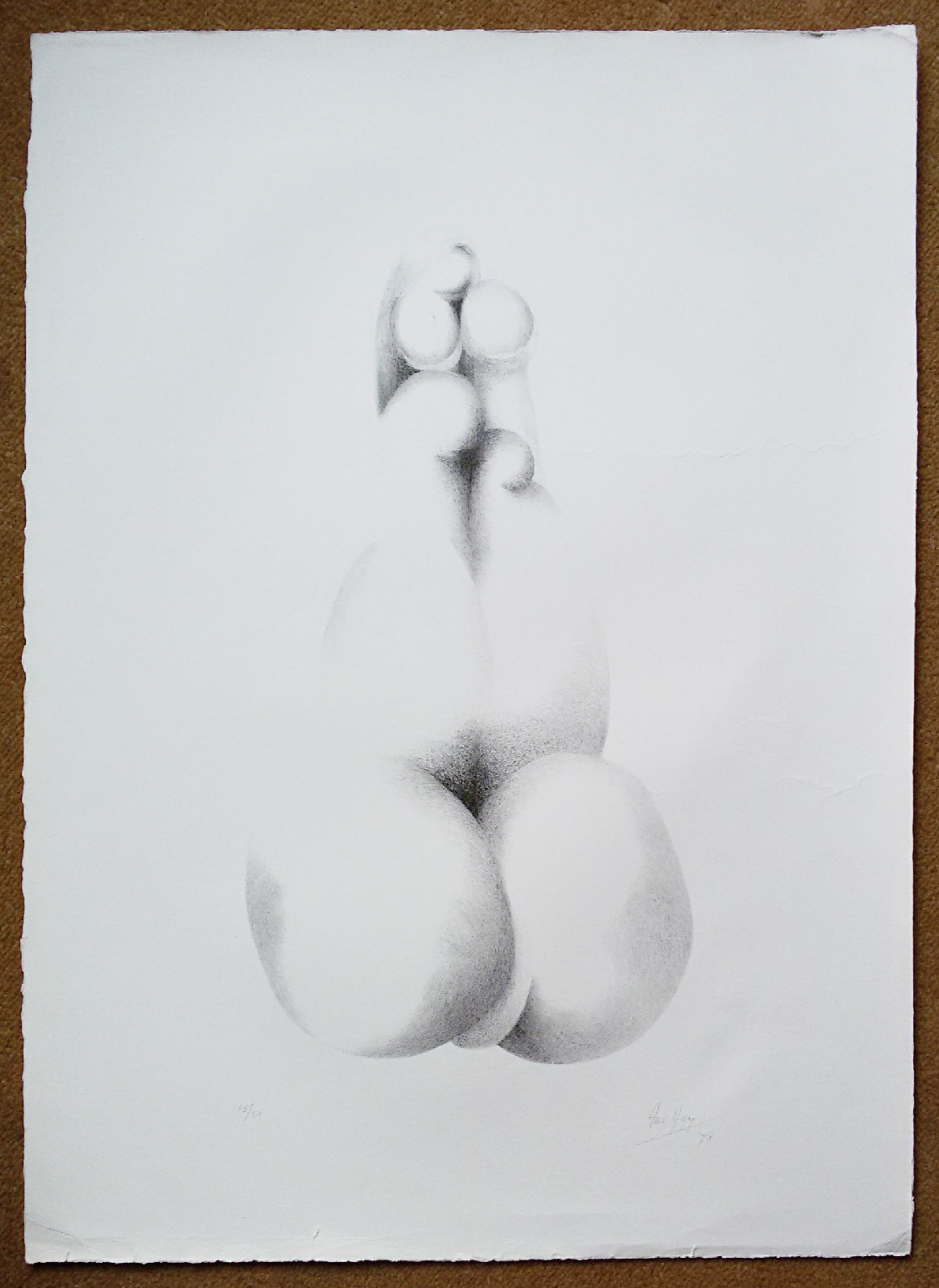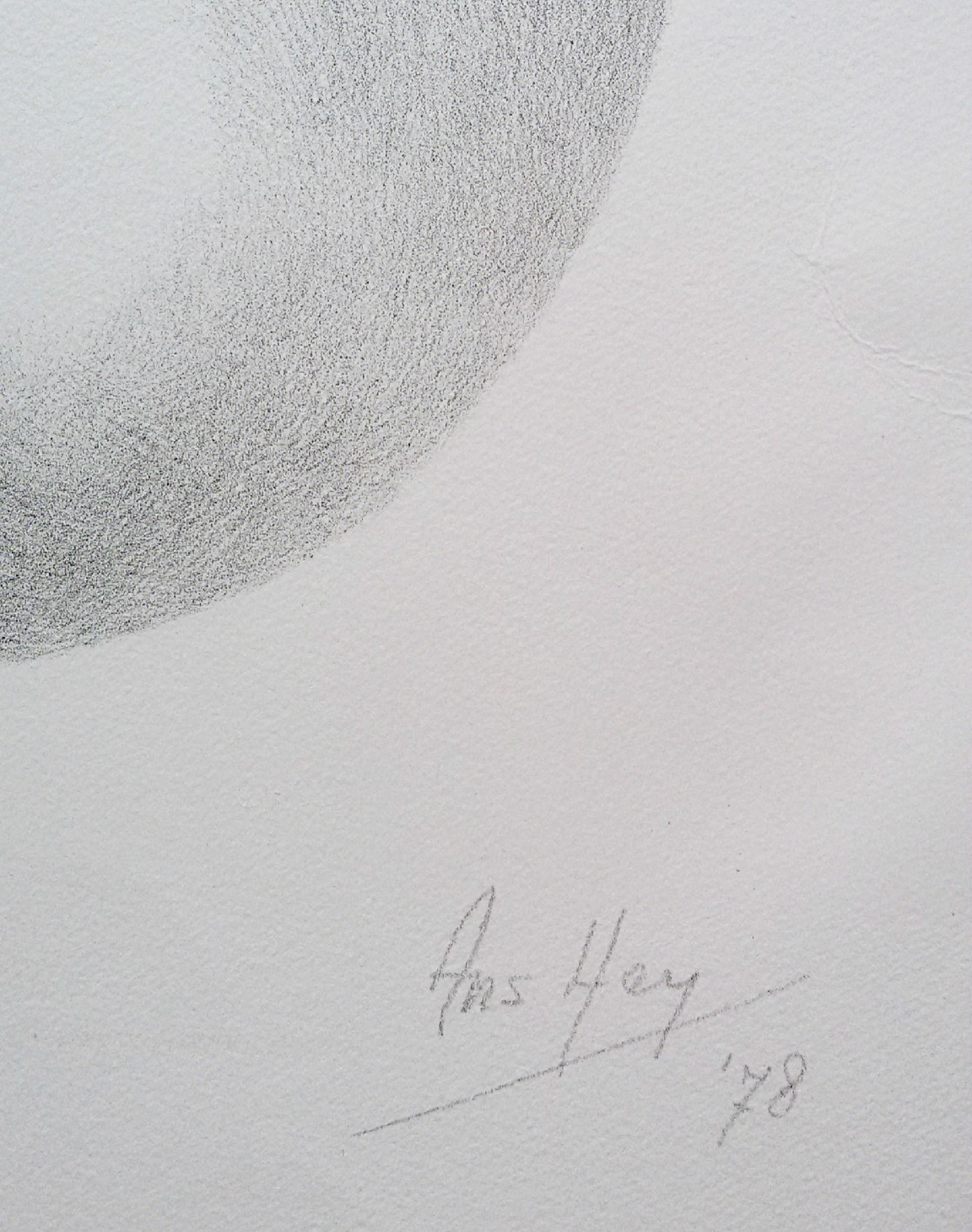 Uiterst herkenbaar werk van Ans Hey. Litho op geschept papier, met potlood gesigneerd, gedateerd (‘78) en genummerd (15/50). In redelijke conditie; in de randen van het blad zitten scheurtjes en kreukjes (vooral aan de onderkant), sommige van de kreukjes lopen in het beeld. Ingelijst met passe-partout is het werk vrij goed waarschijnlijk.