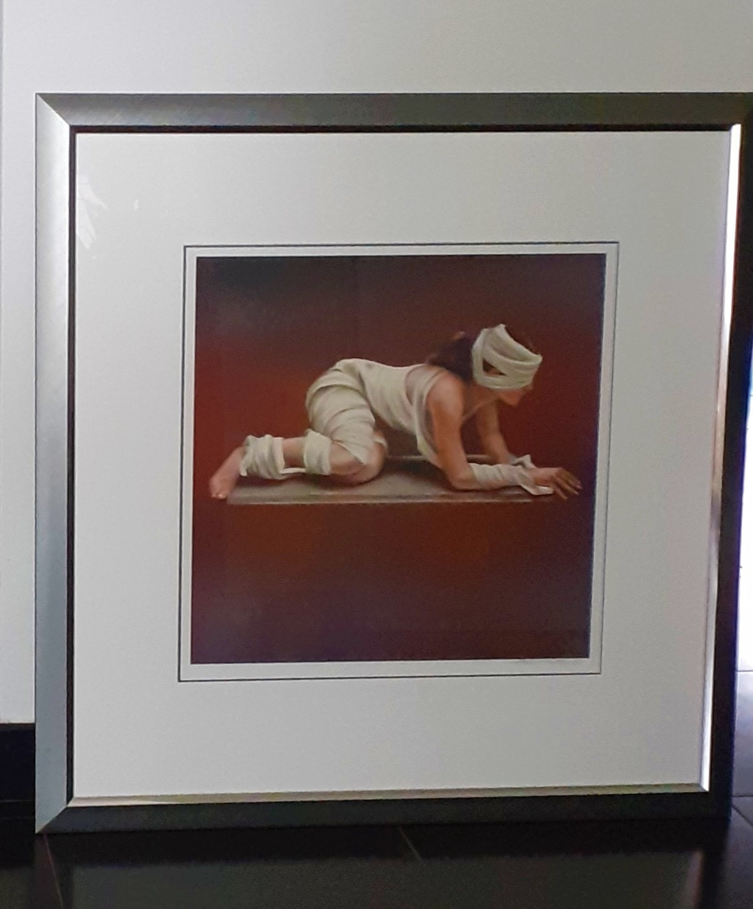 Het werk is ingelijst met een brede, zeer luxe geborstelde aluminium lijst met passepartout
