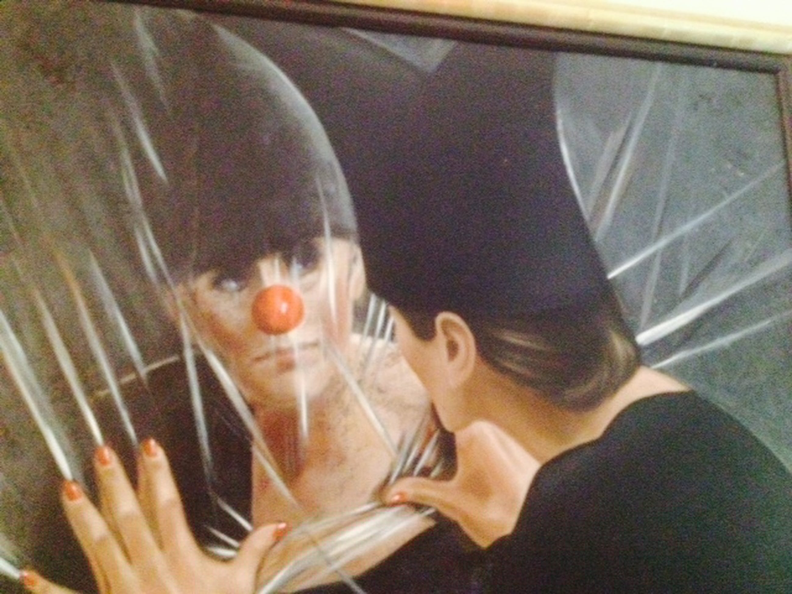 Zelfportret met harlekijnsmuts en clownsneus voor spiegel, handgesigneerd (linksonder).