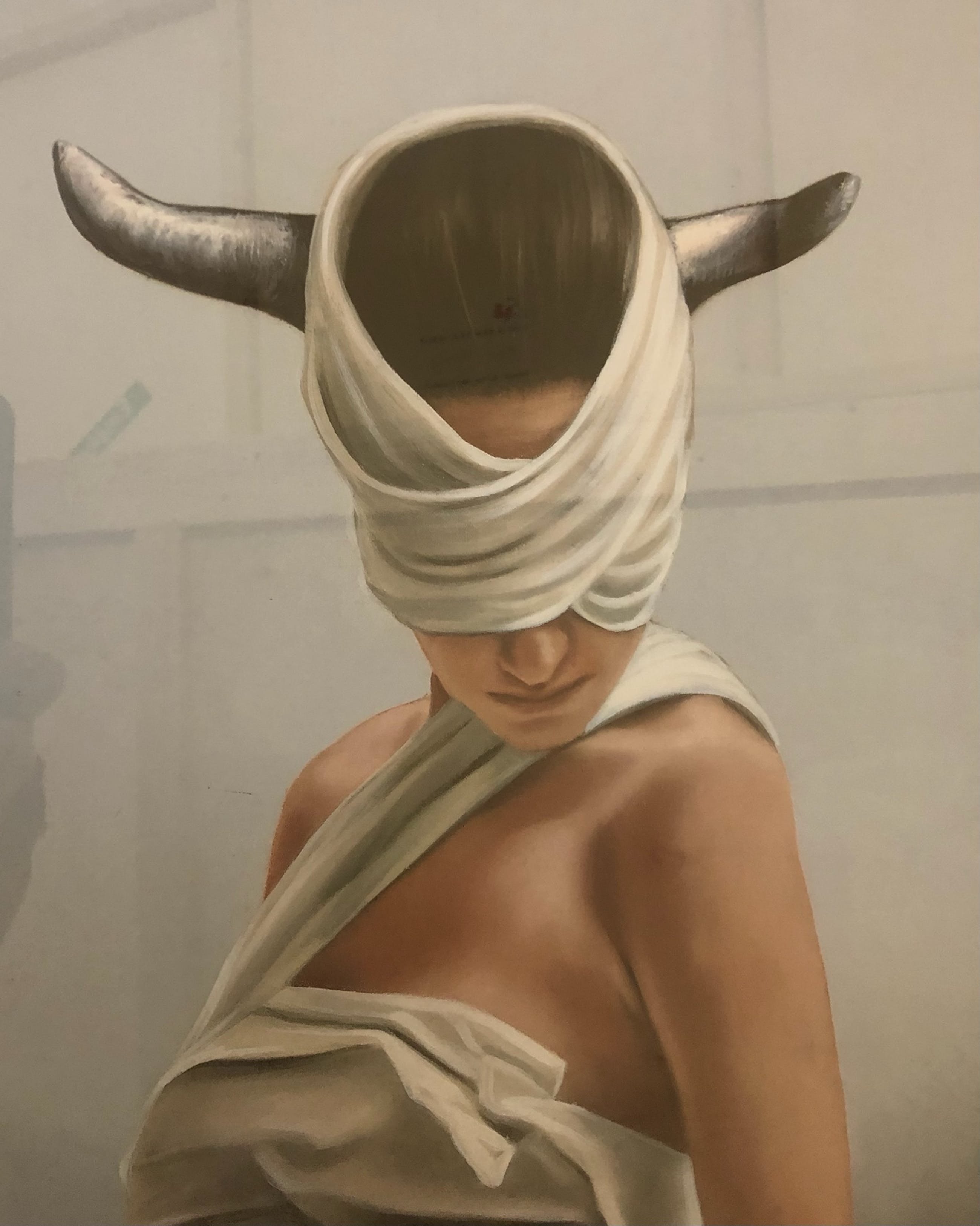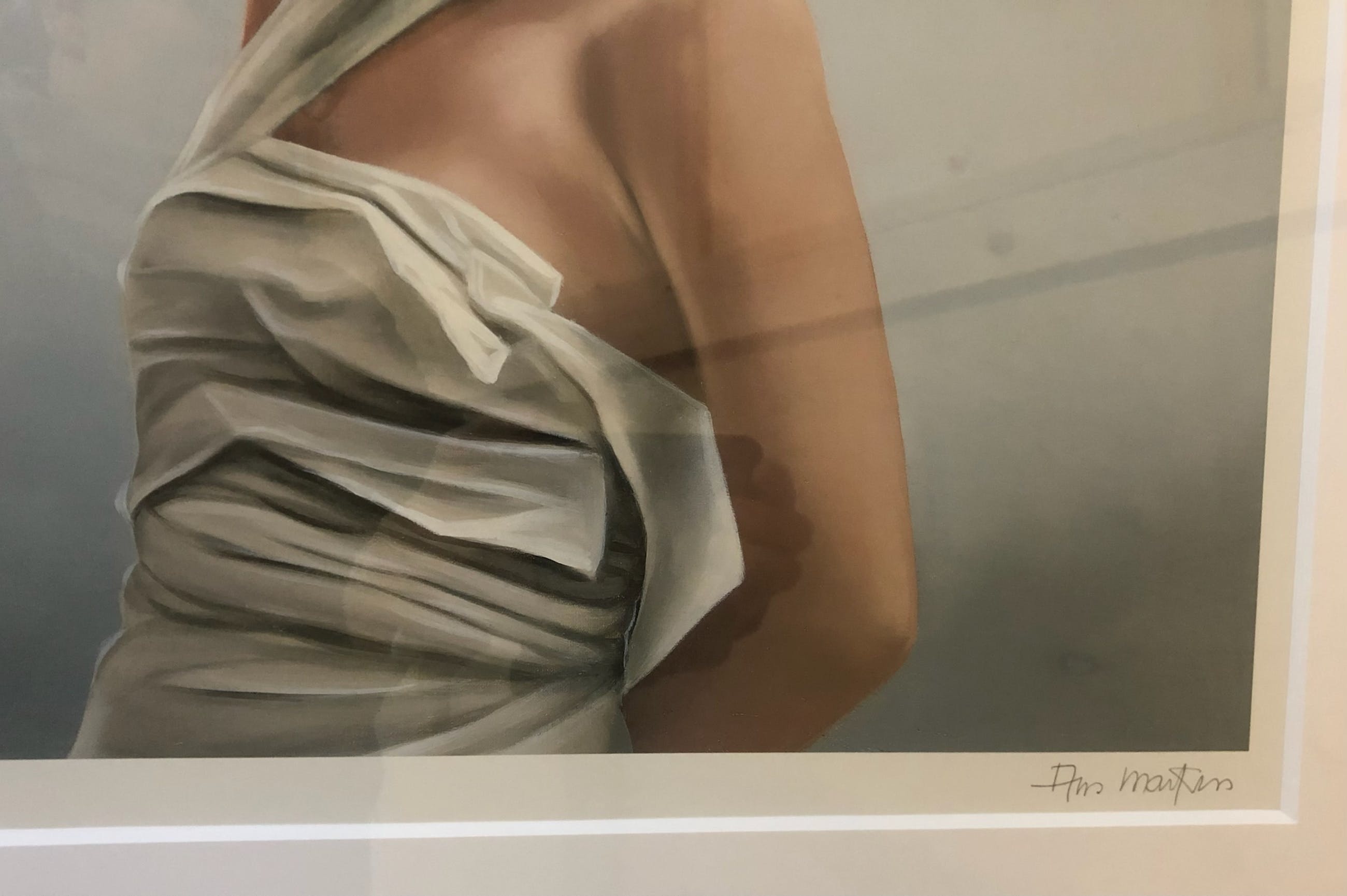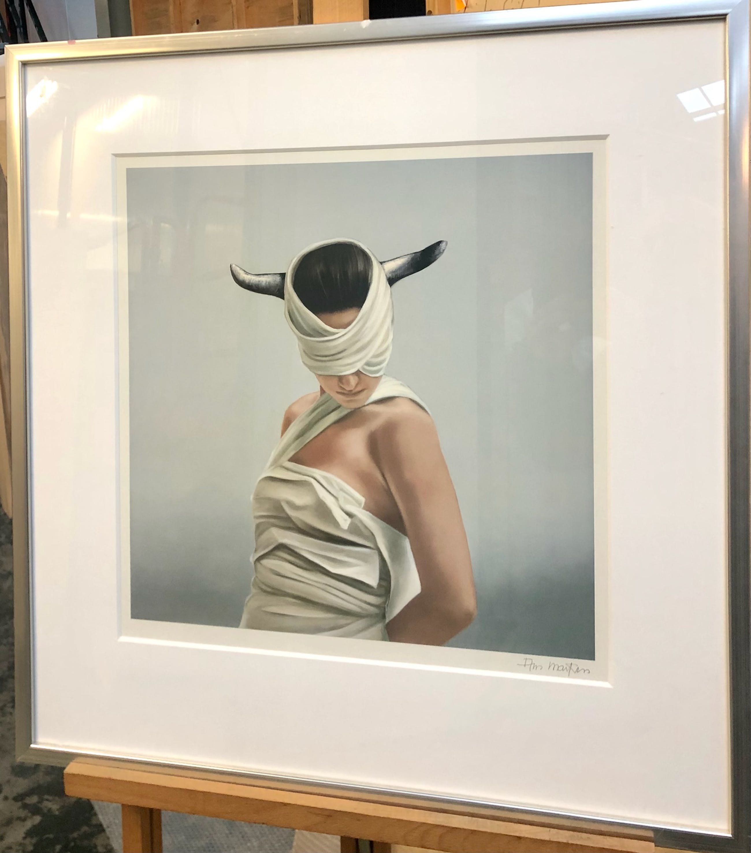 Het werk is ingelijst in een verzilverde lijst. Deze heeft een kleine beschadiging aan de bovenzijde. Vanwege de spiegeling in het glas is het werk van de zijkanten gefotografeerd.