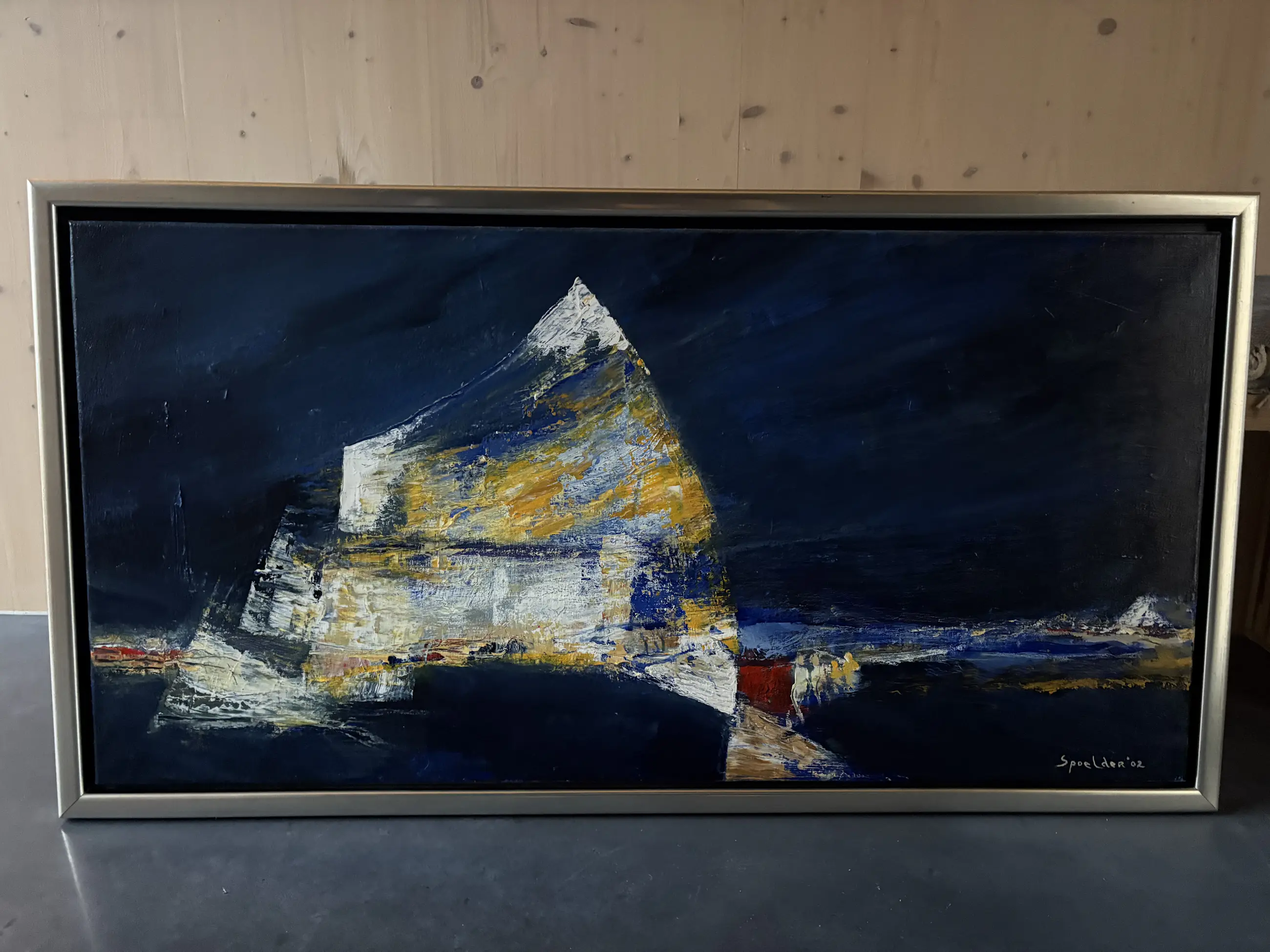 Zeilboot en waterpartij abstract geschilderd door Ans Rotteveel/spoelder