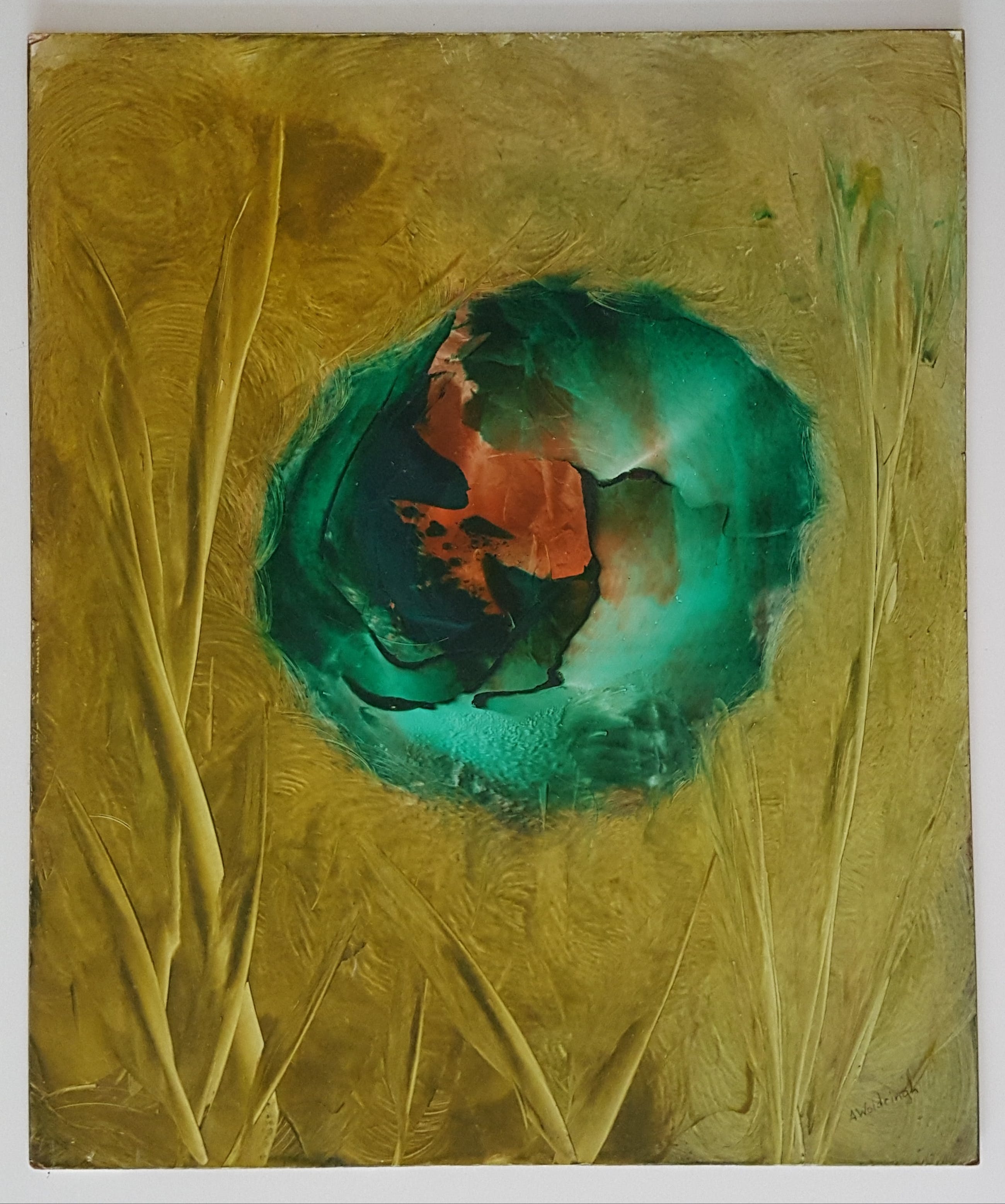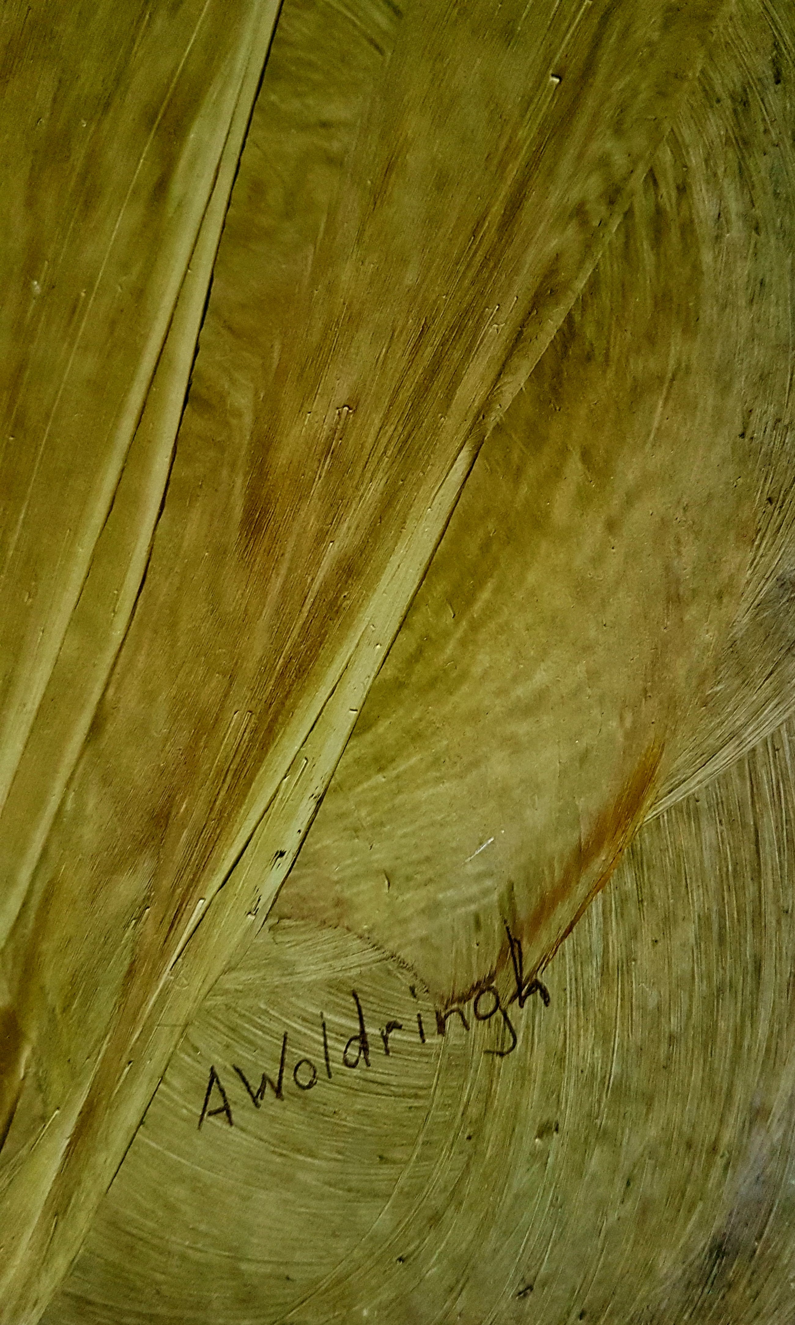 Woldringh maakte zich een nieuwe techniek eigen: op de gladde geprepareerde ondergrond wreef zij een breed spoor in transparante, met veel bindmiddel aangemaakte, verf. Door de donkere contouren en de brede lichtende vegen ontstonden ruimtelijke bijna surreële landschappen.