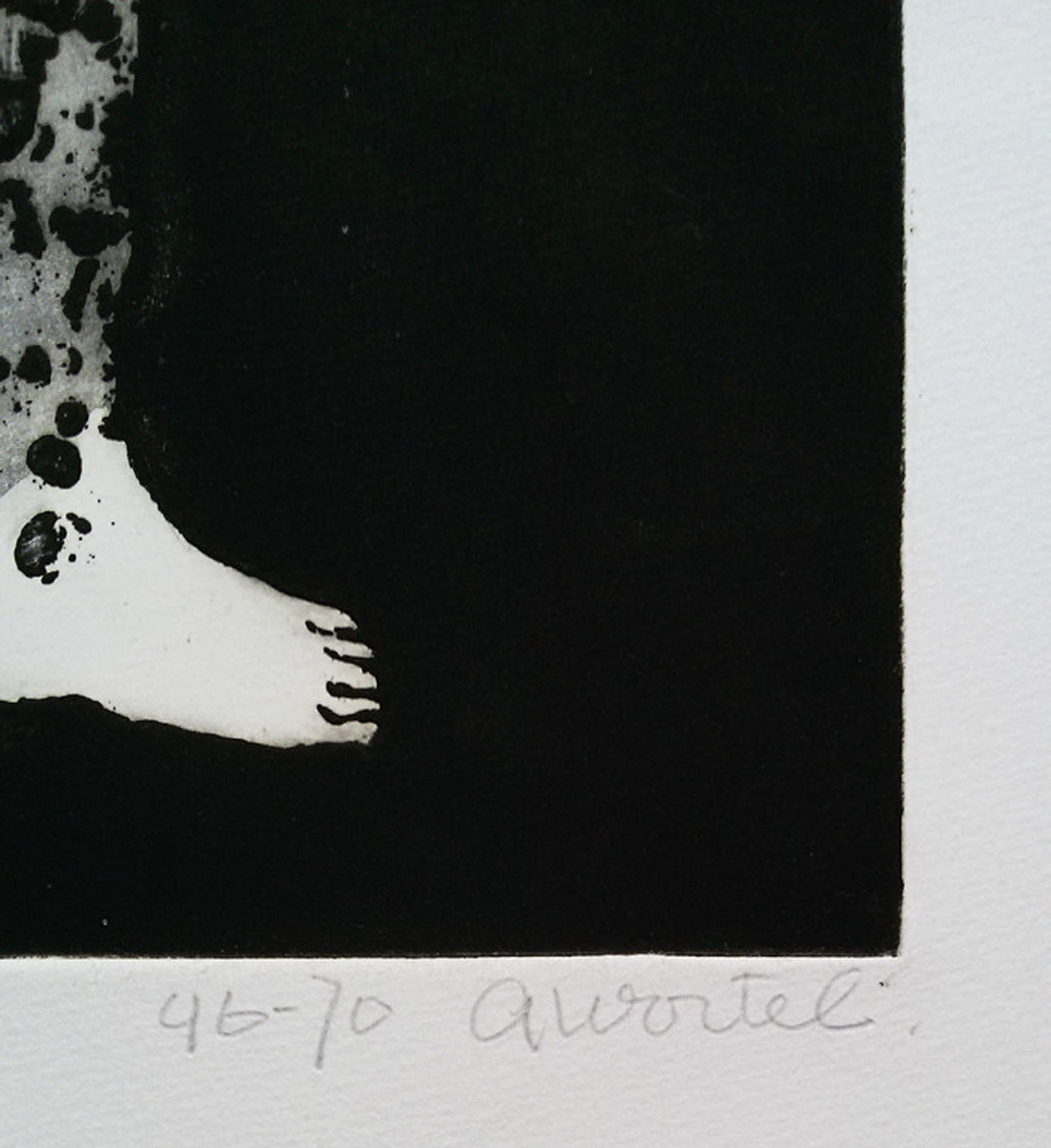Karakteristieke ets van Ans Wortel. Met potlood gesigneerd en genummerd (46-70). In goede staat; wat kreukjes boven in de witte marge en lichte verkleuring van een vorige lijst (rand van ongeveer 1 cm rondom het blad). Niet echt storend, ingelijst met nieuw passe-partout een prima werk.