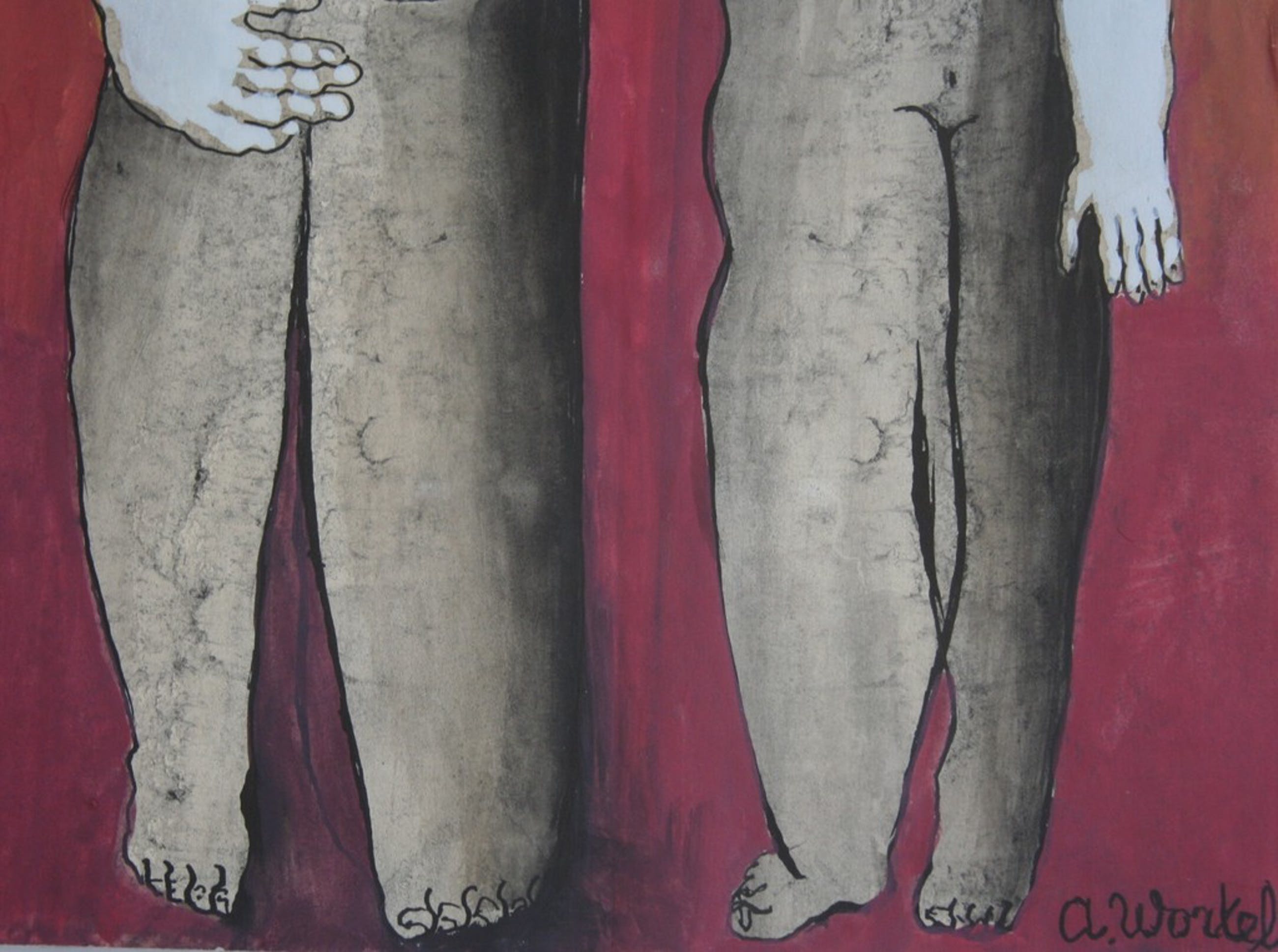 Gouache van Ans Wortel, vrij hangend ingelijst onder glas in houten lijst. Onbewerkte houten lijst met gebruikssporen. Originele lijst, herkomst: Stichting beeldende kunst Amsterdam. Circa 1966. Titel: "De verschrikkelijke lijven van vrouwen alleen". Gesigneerd.