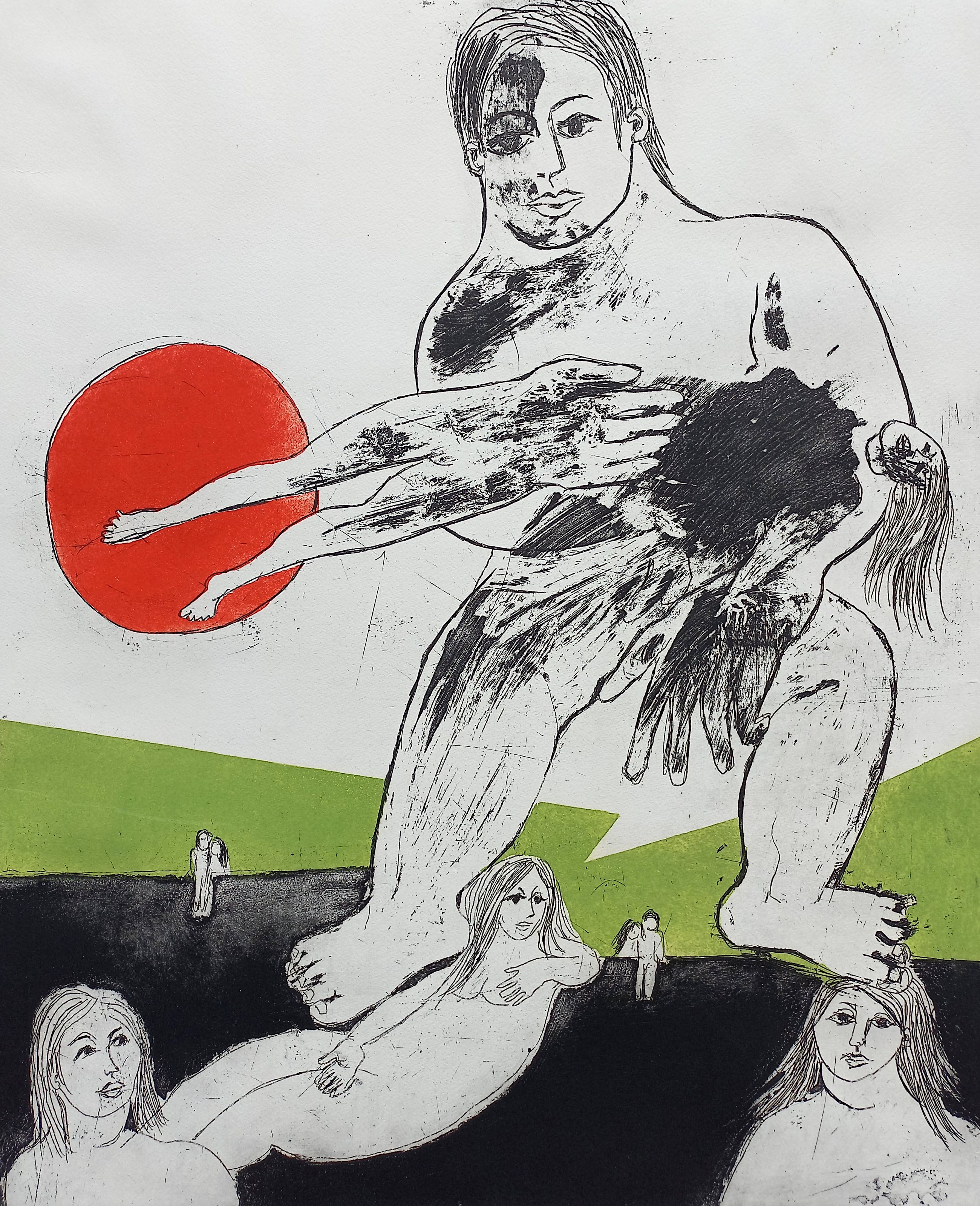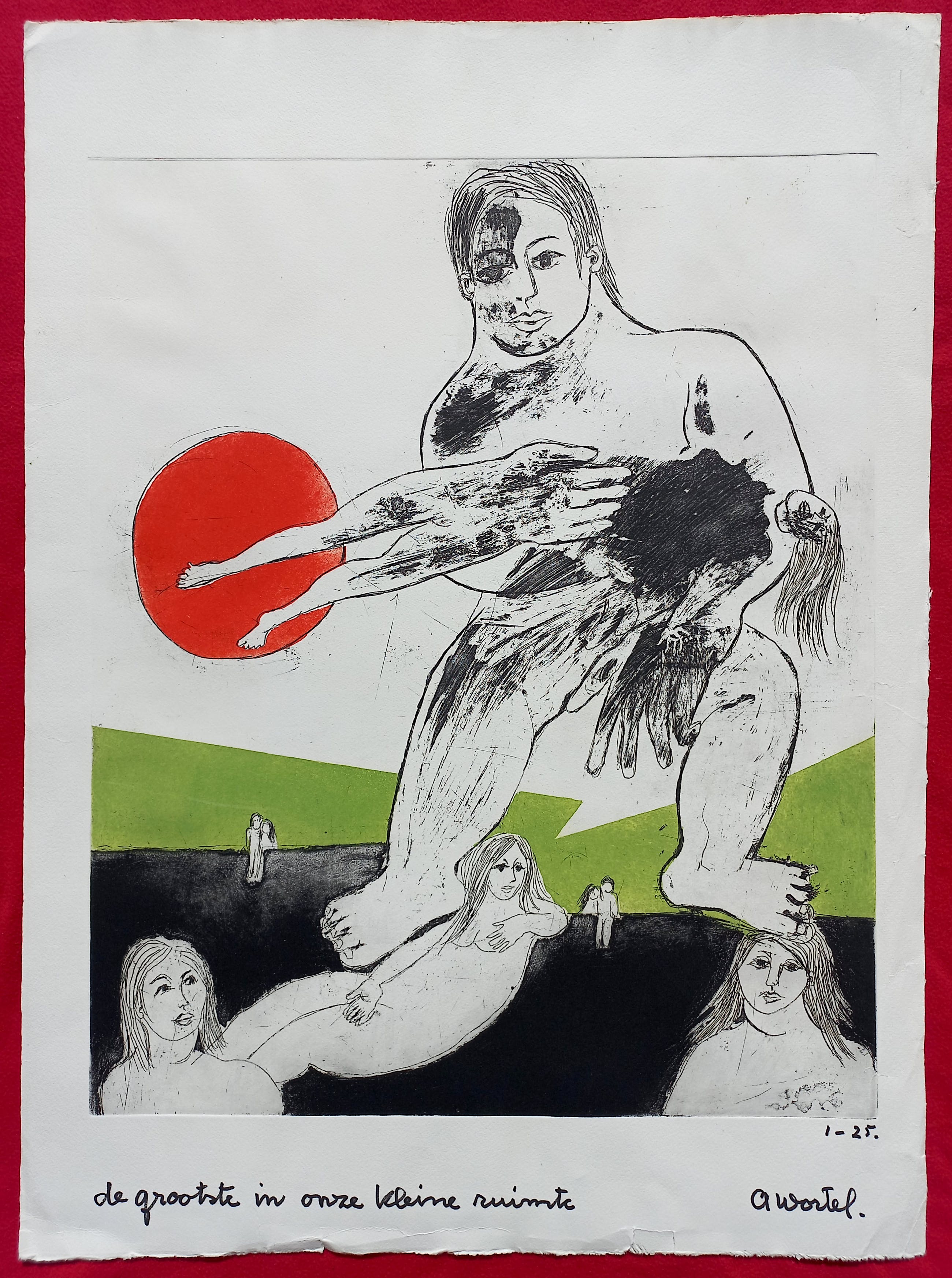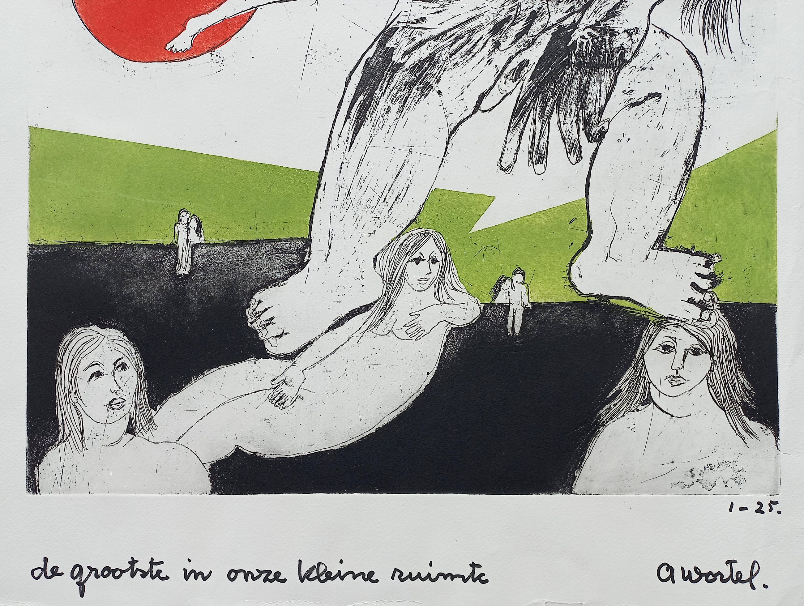 Groot, karakteristiek werk van Ans Wortel uit de jaren 70. Aquatint ets op geschept papier, met zwarte marker gesigneerd, getiteld en genummerd (1-25). In goede conditie.