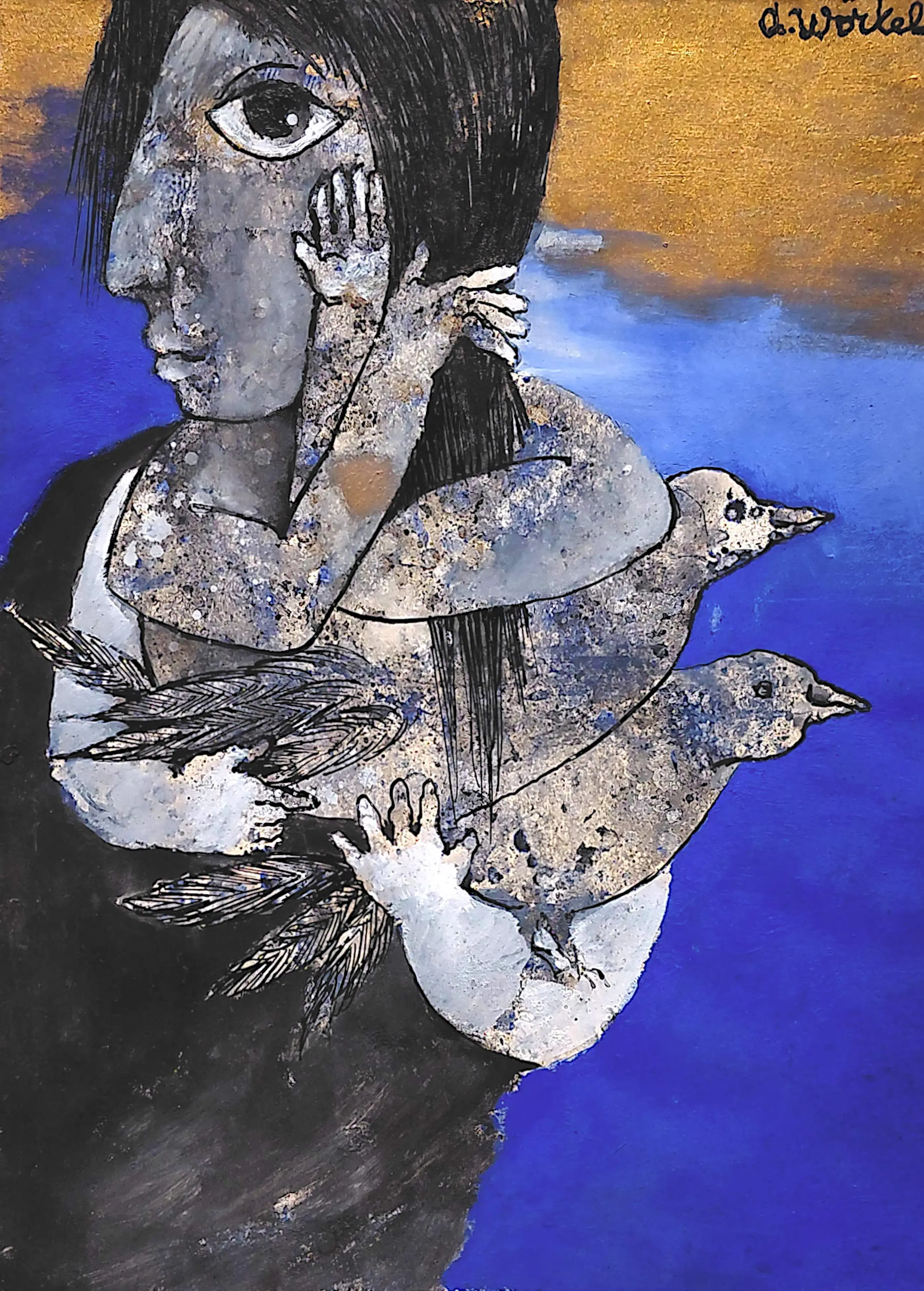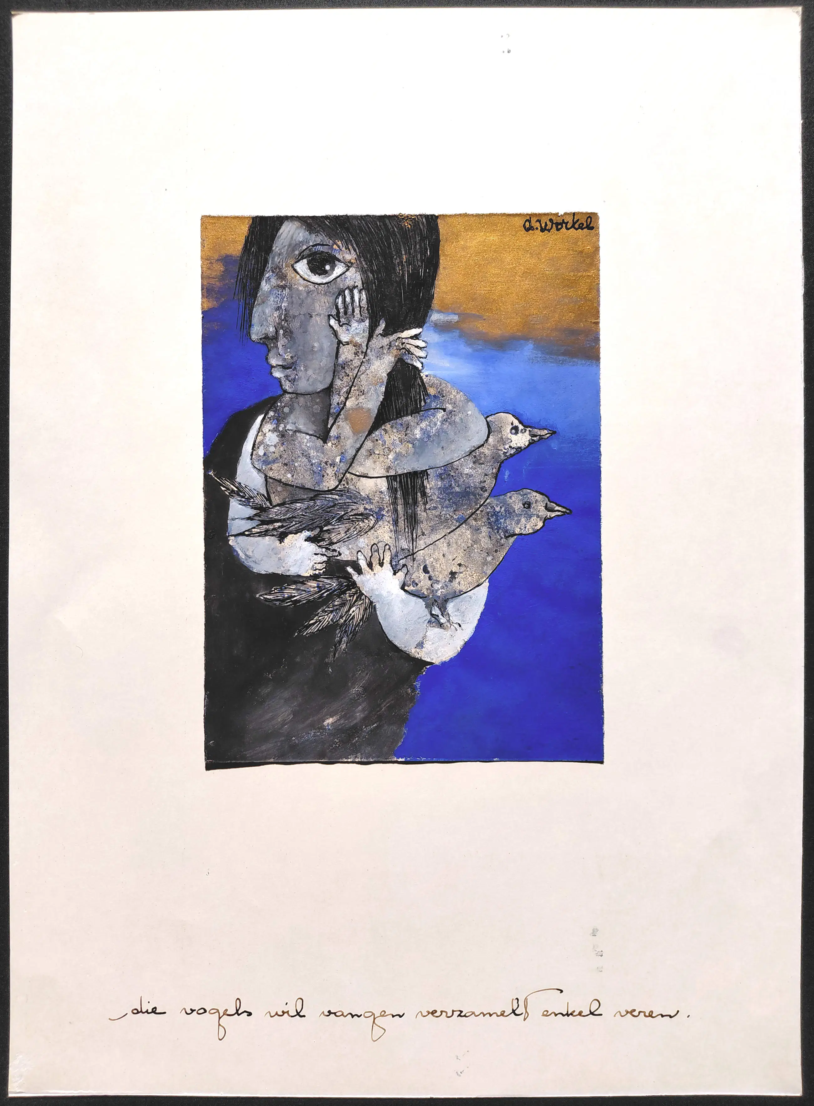 Ans Wortel - Die vogels wil vangen verzamelt enkel veren, gouache