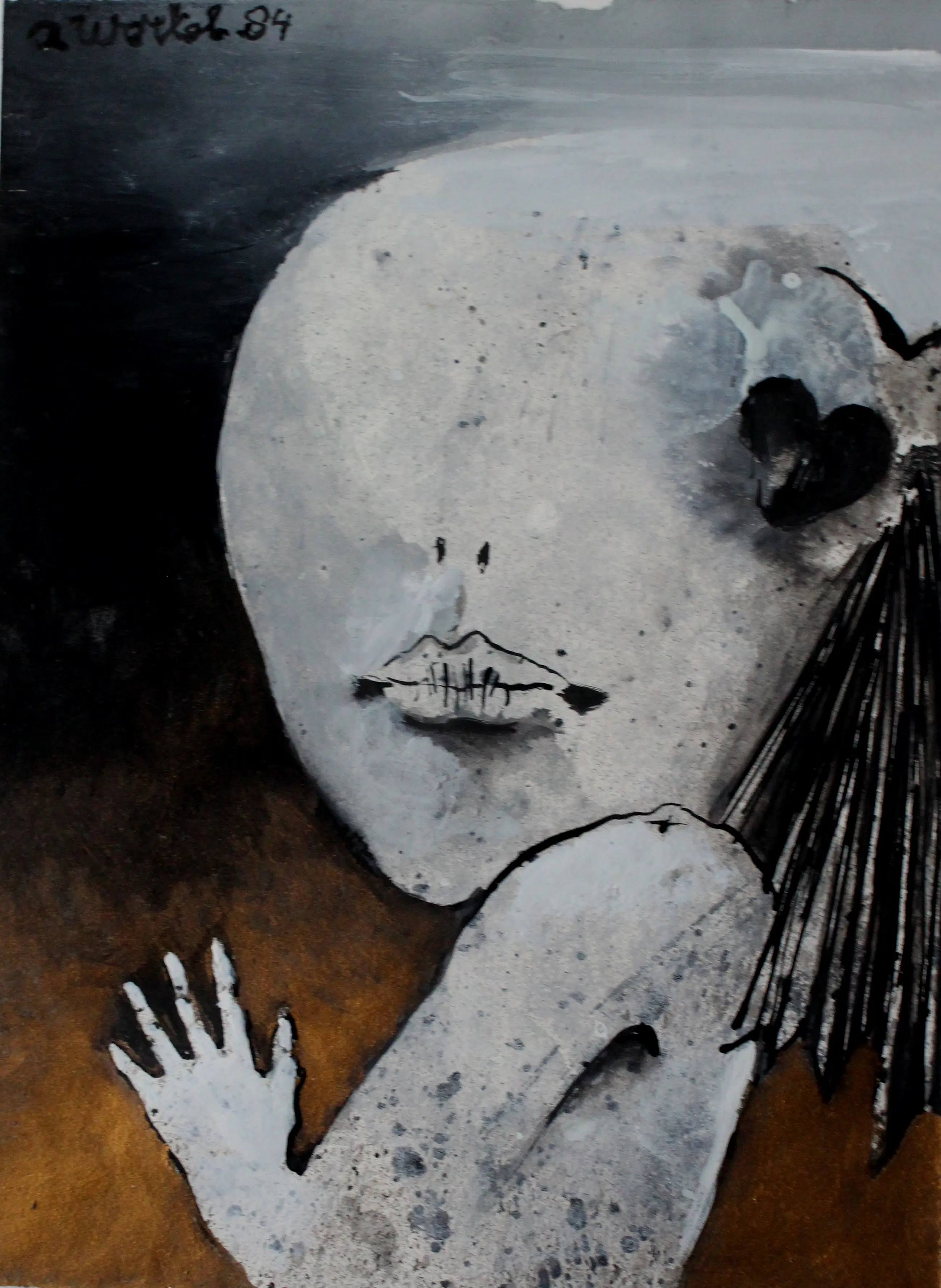 Gemengde techniek(tekening/, gouache/pen/inkt), van Ans Wortel. Titel: "de vogel en ik die 't niet meer zie zitten''... Jaar: 1984. Afmetingen blad: H40 x b30cm. Afmetingen voorstelling: H18 x B13.5cm.