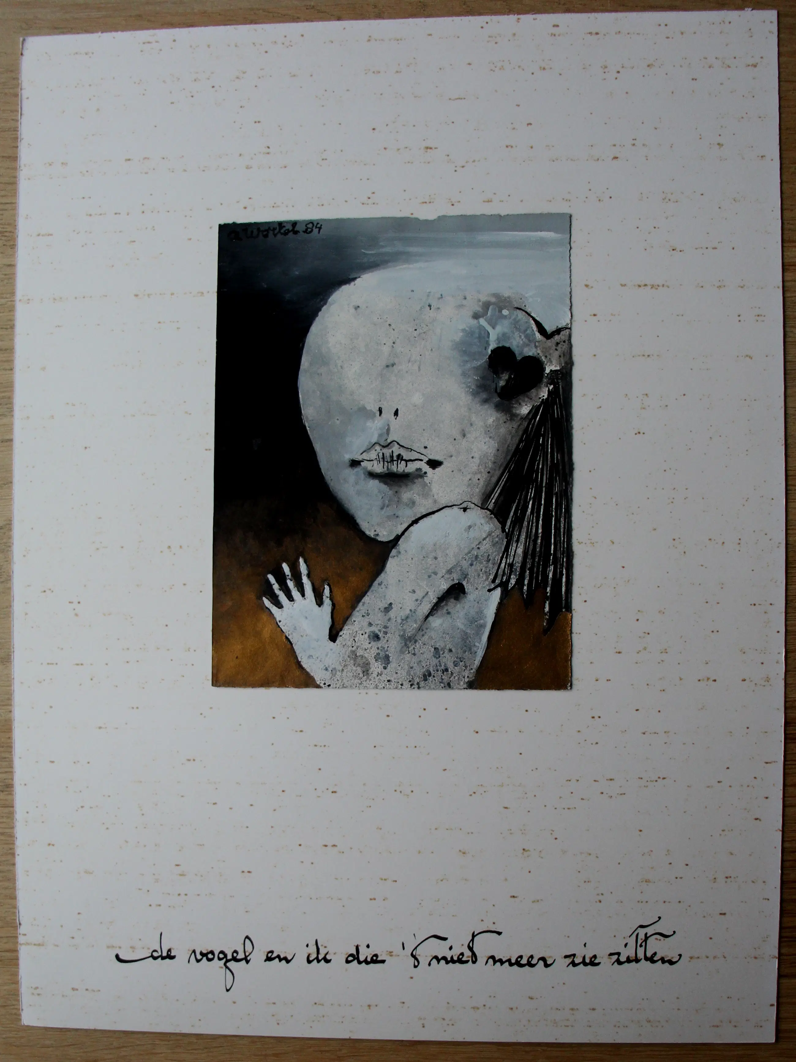 Ans Wortel - Gemengde techniek: "de vogel en ik die 't niet meer zie zitten''... - 1984