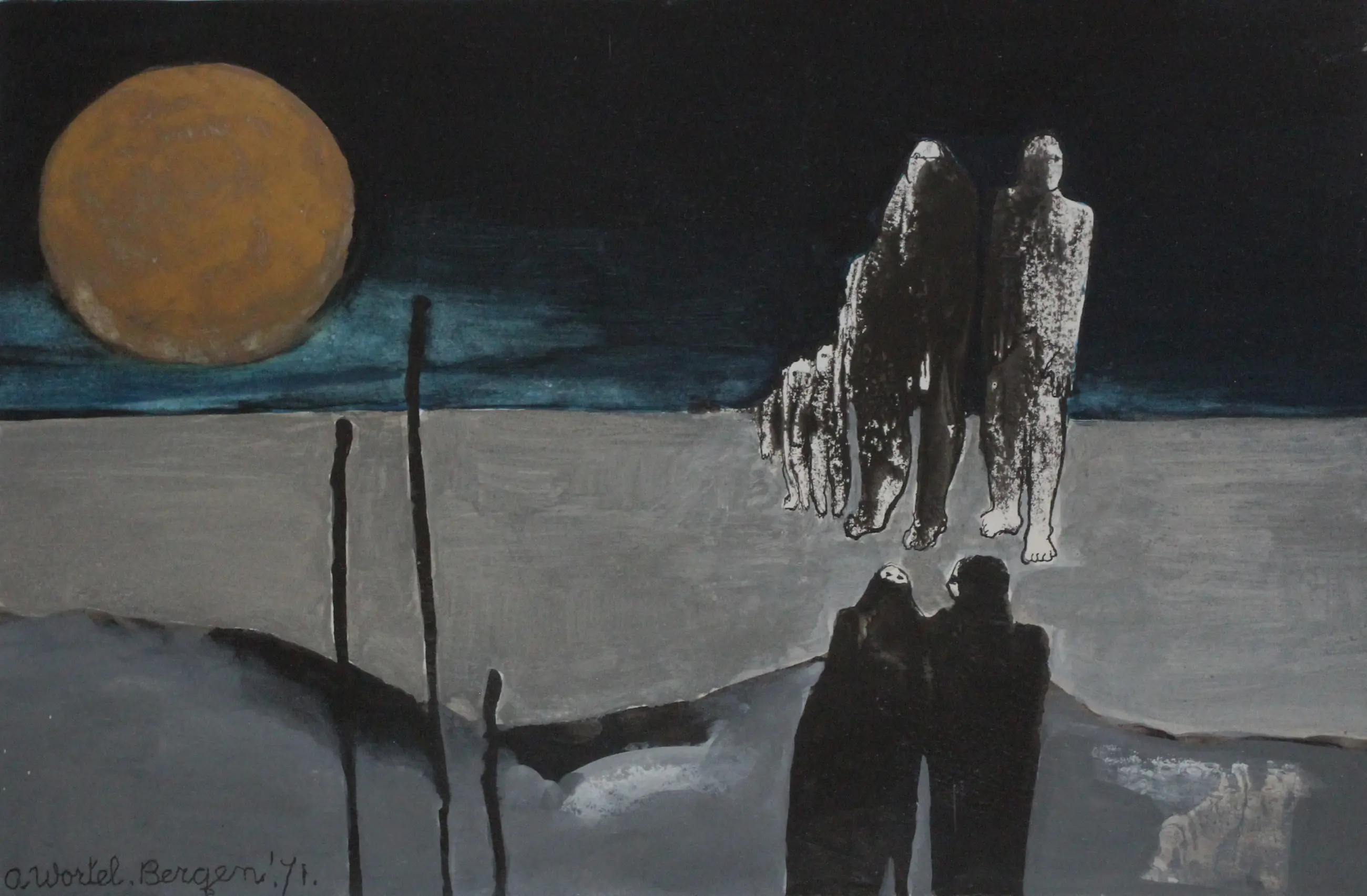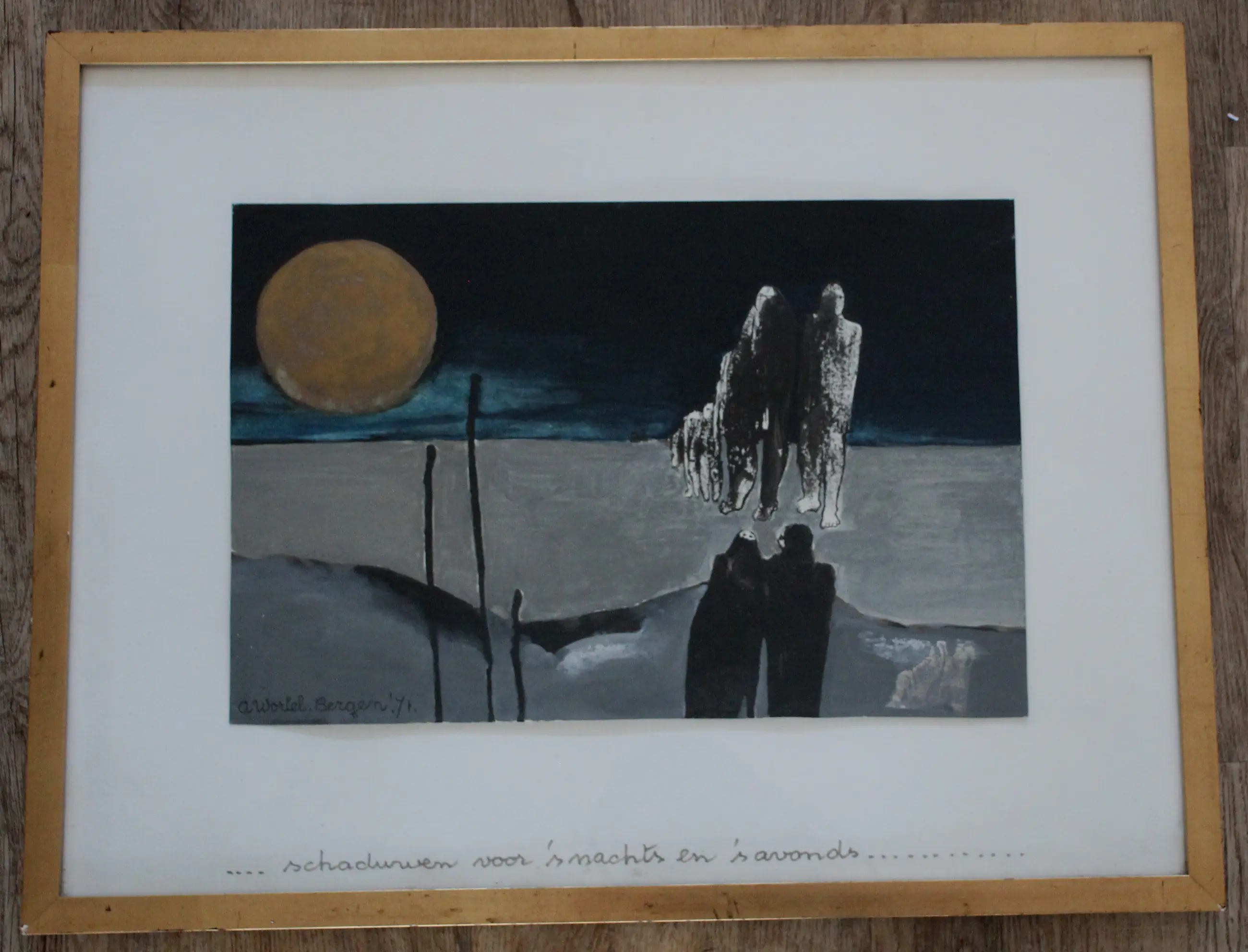 Gemengde techniek, ingelijst, van Ans Wortel. Titel: Schaduwen voor 's-nachts en 's-avonds. Jaar: 1971. Afmetingen incl lijst: H52 x b68cm. Afmetingen voorstelling: H30 x b46cm. Het werk is links onderaan gesigneerd door de kunstenares. De authenticiteit van het aangeboden werk wordt volledig gegarandeerd. Een certificaat van echtheid kan, op aanvraag, worden gemaild.