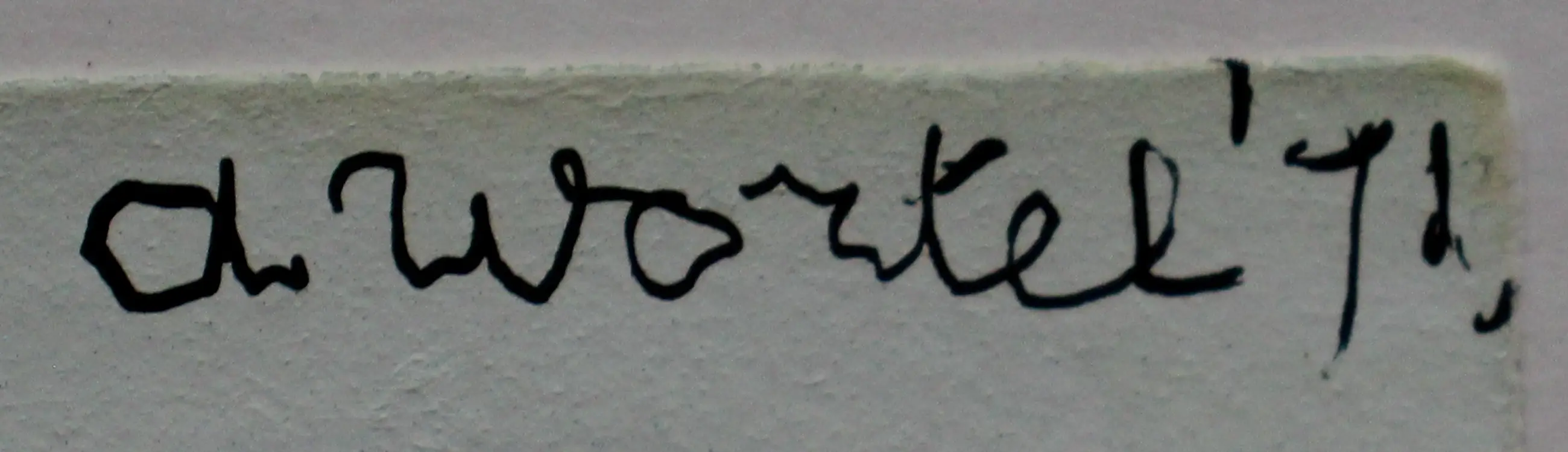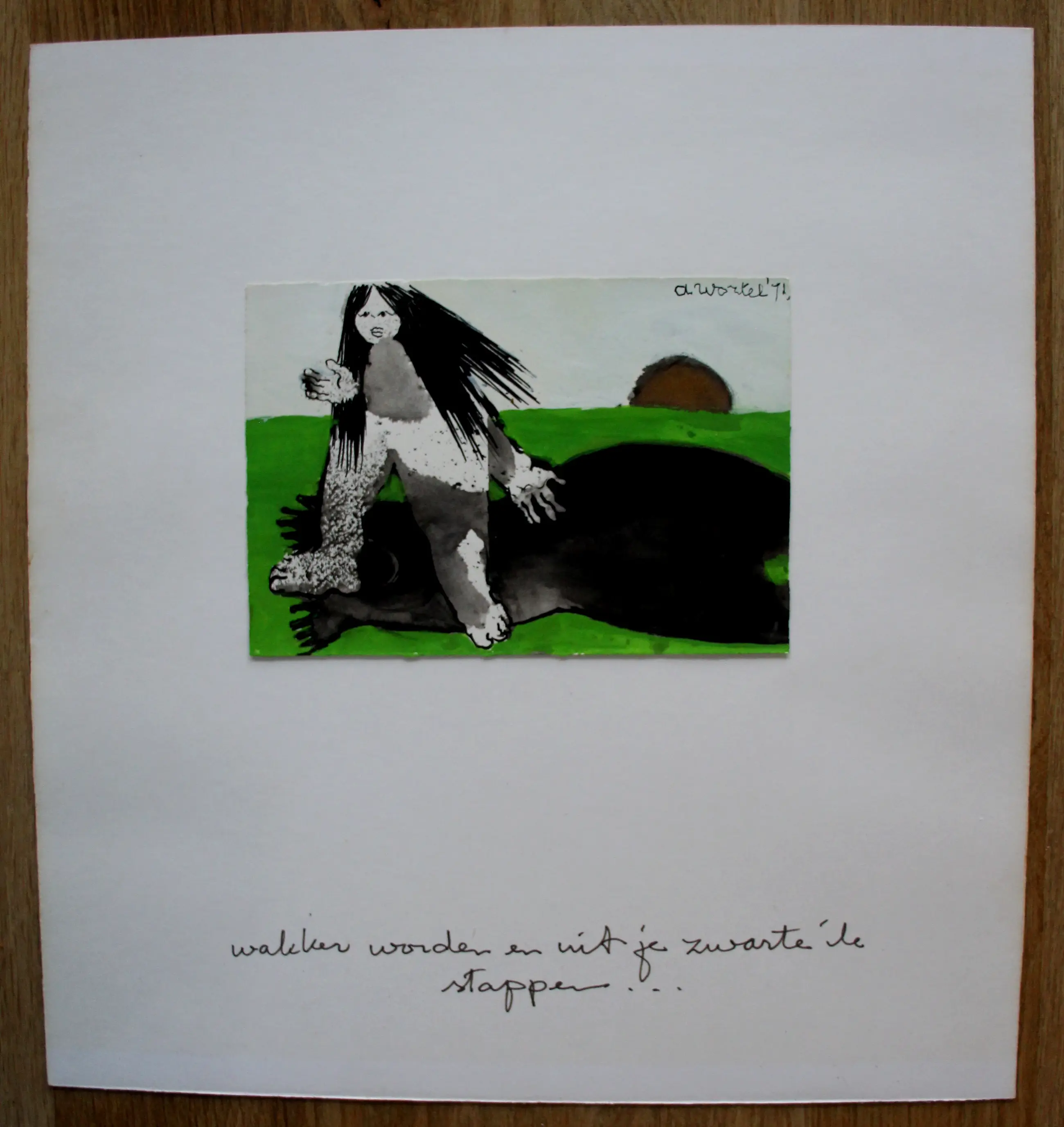 Gouache van Ans Wortel. Titel: "Wakker worden en uit je zwarte ik stappen"...Jaar: 1971. Afmetingen blad: H40.5 x b37.5cm. Afmetingen voorstelling: H14 x b20cm. Het werk is rechts bovenaan gesigneerd "A Wortel". De authenticiteit van het aangeboden werk wordt volledig gegarandeerd. Een certificaat van echtheid kan, op aanvraag, worden gemaild.