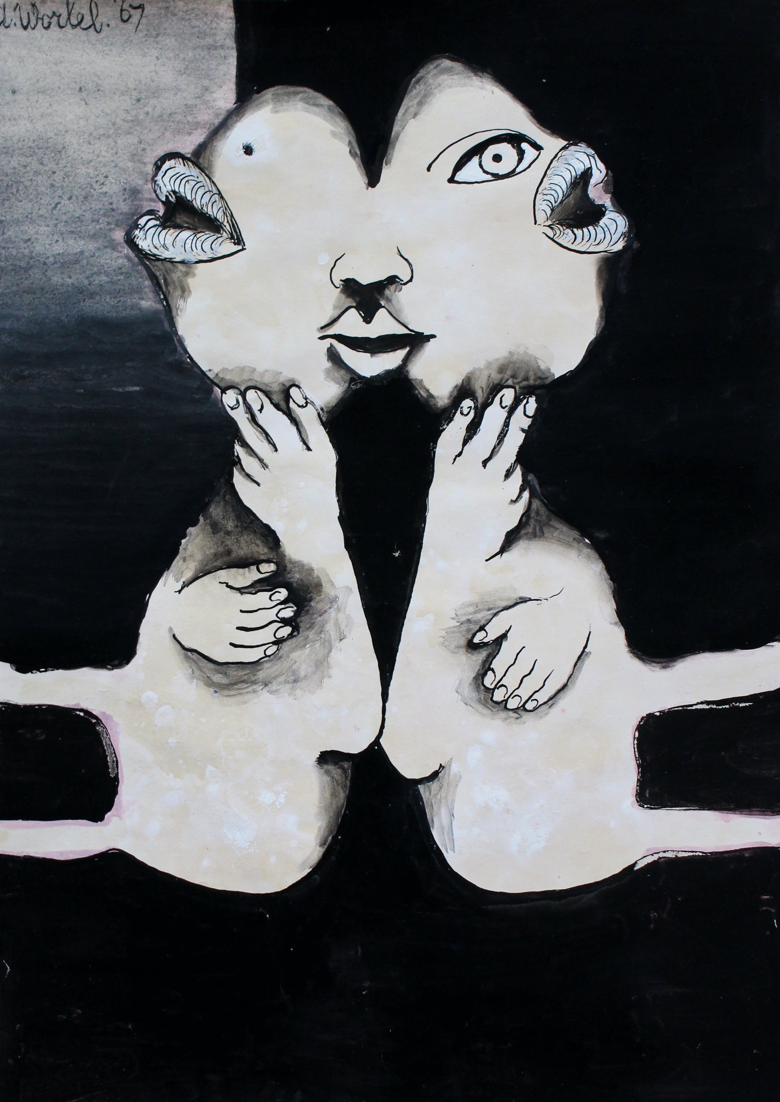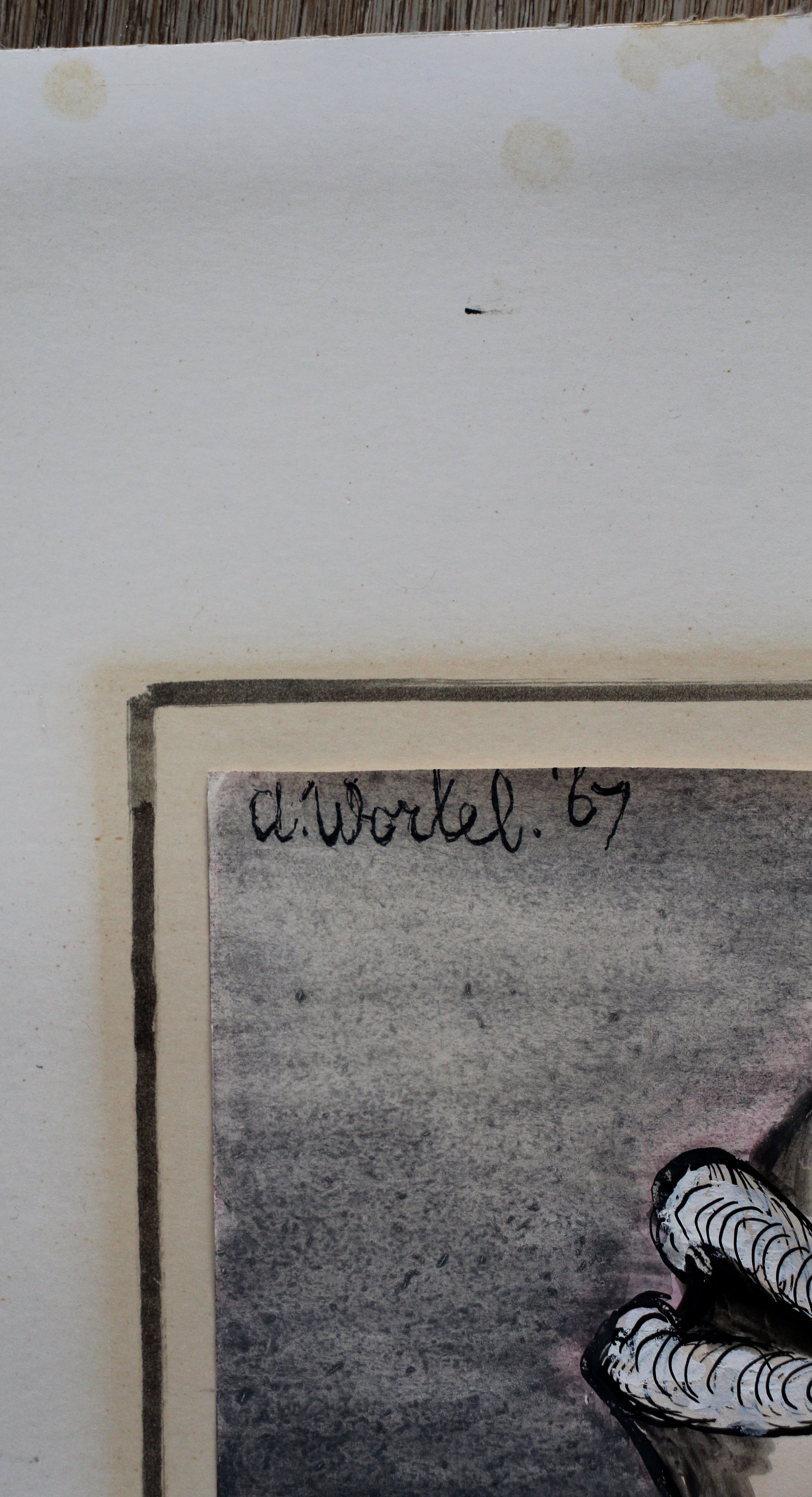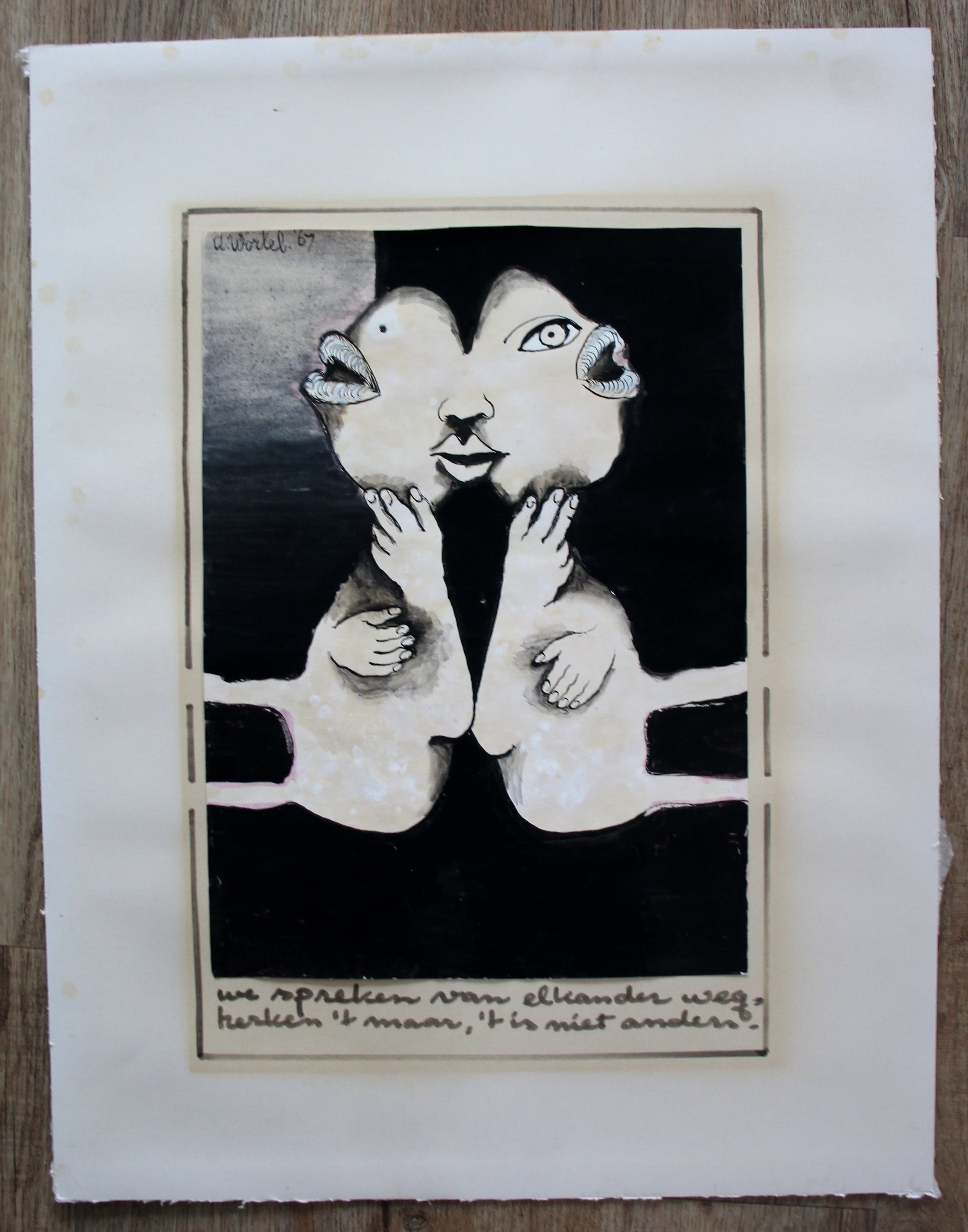 Gouache van Ans Wortel uit 1967. Titel: we spreken van elkander weg, herken 't maar, 't is niet anders. Afmetingen blad: H65 x b49.5cm. Afmetingen voorstelling: H41 x b30cm. Het werk is links bovenaan gesigneerd door de kunstenaar. De authenticiteit van het aangeboden werk wordt volledig gegarandeerd.