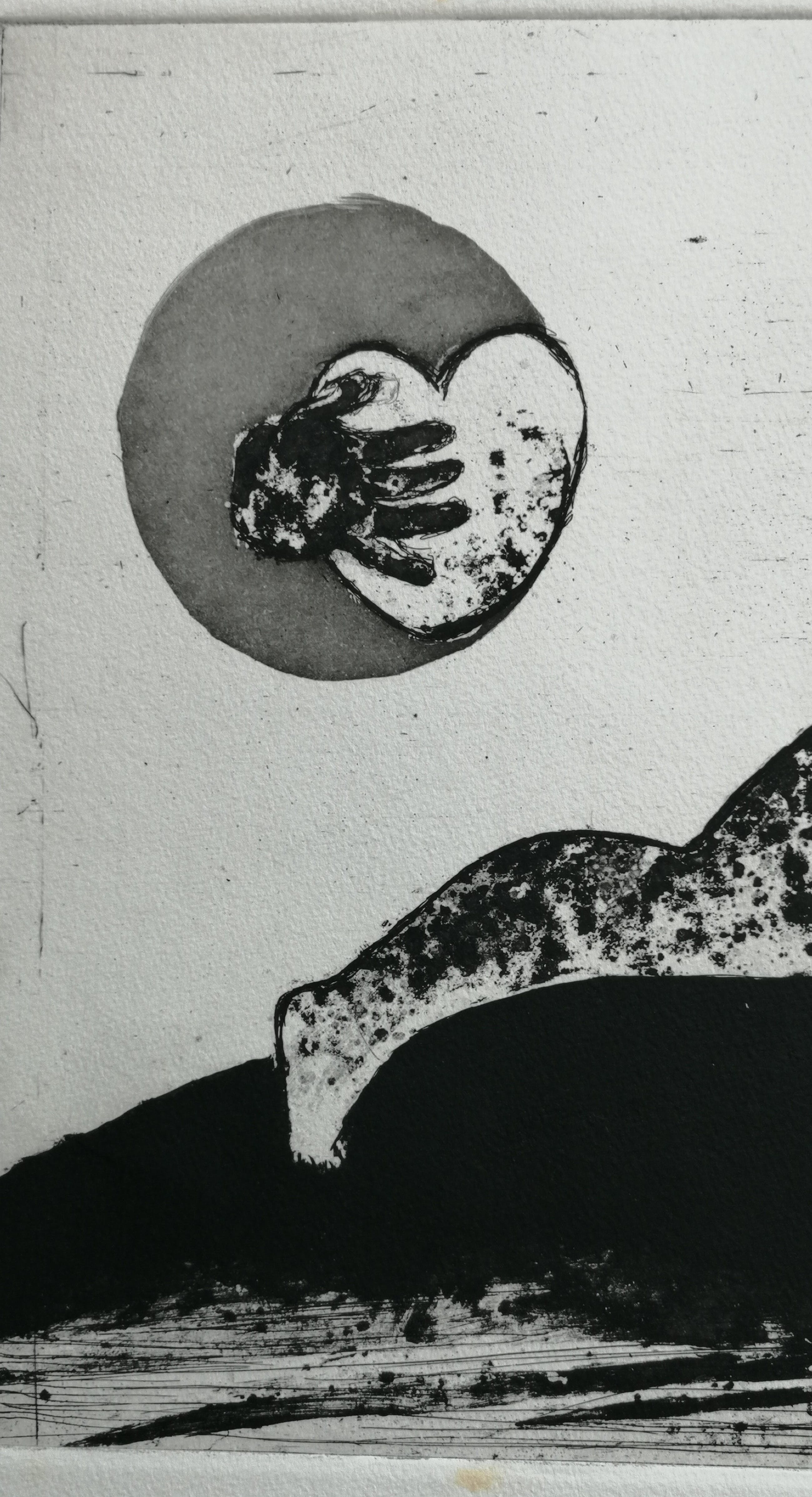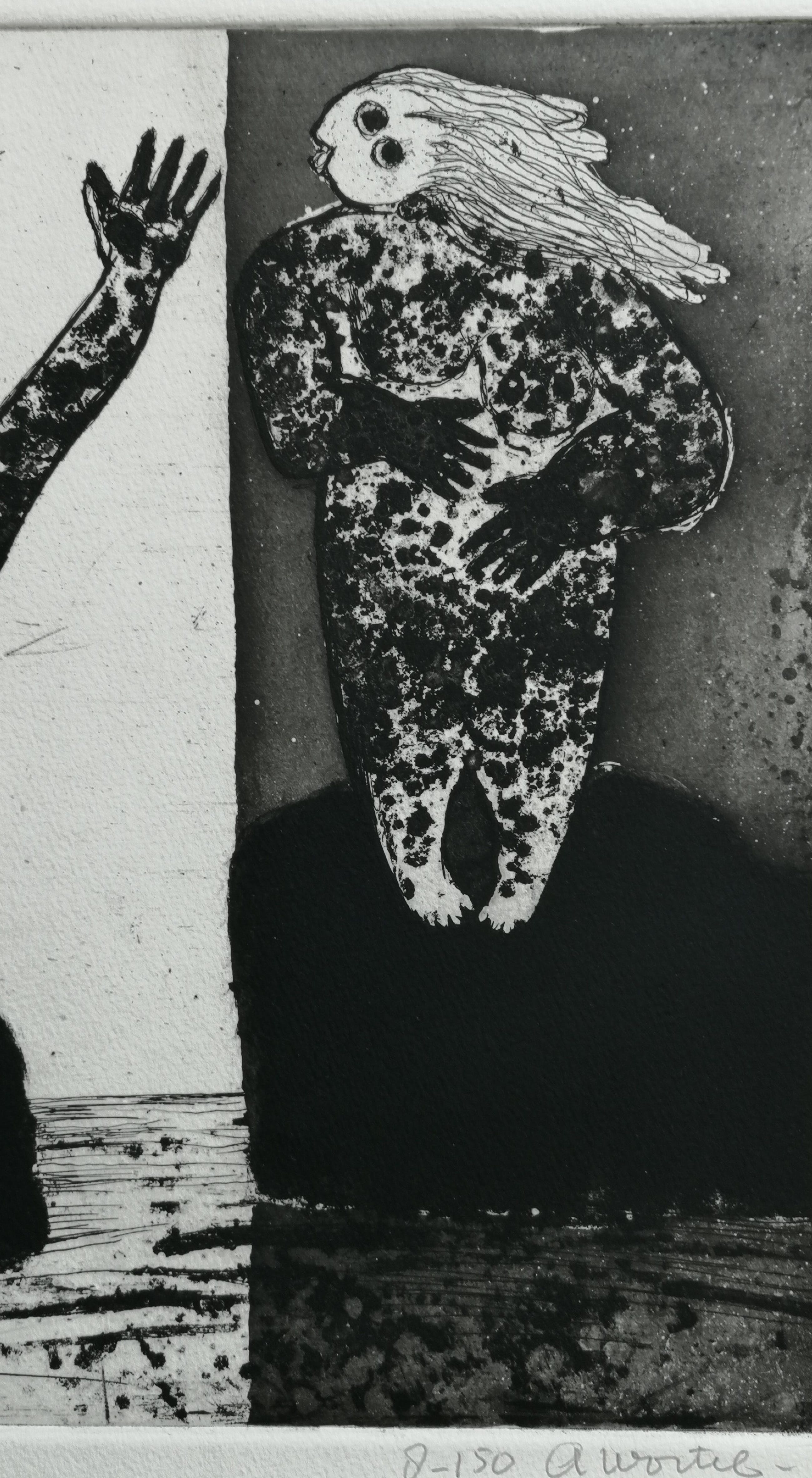 Ets getiteld "ik houd m'n hart vast voor 't land waar de knechten de baas zijn.....". Potlood gesigneerd en genummerd 8-150 rechtsonder. Beeldmaat 24,5x39 cm. Bladmaat 65x50 cm. Losbladig.