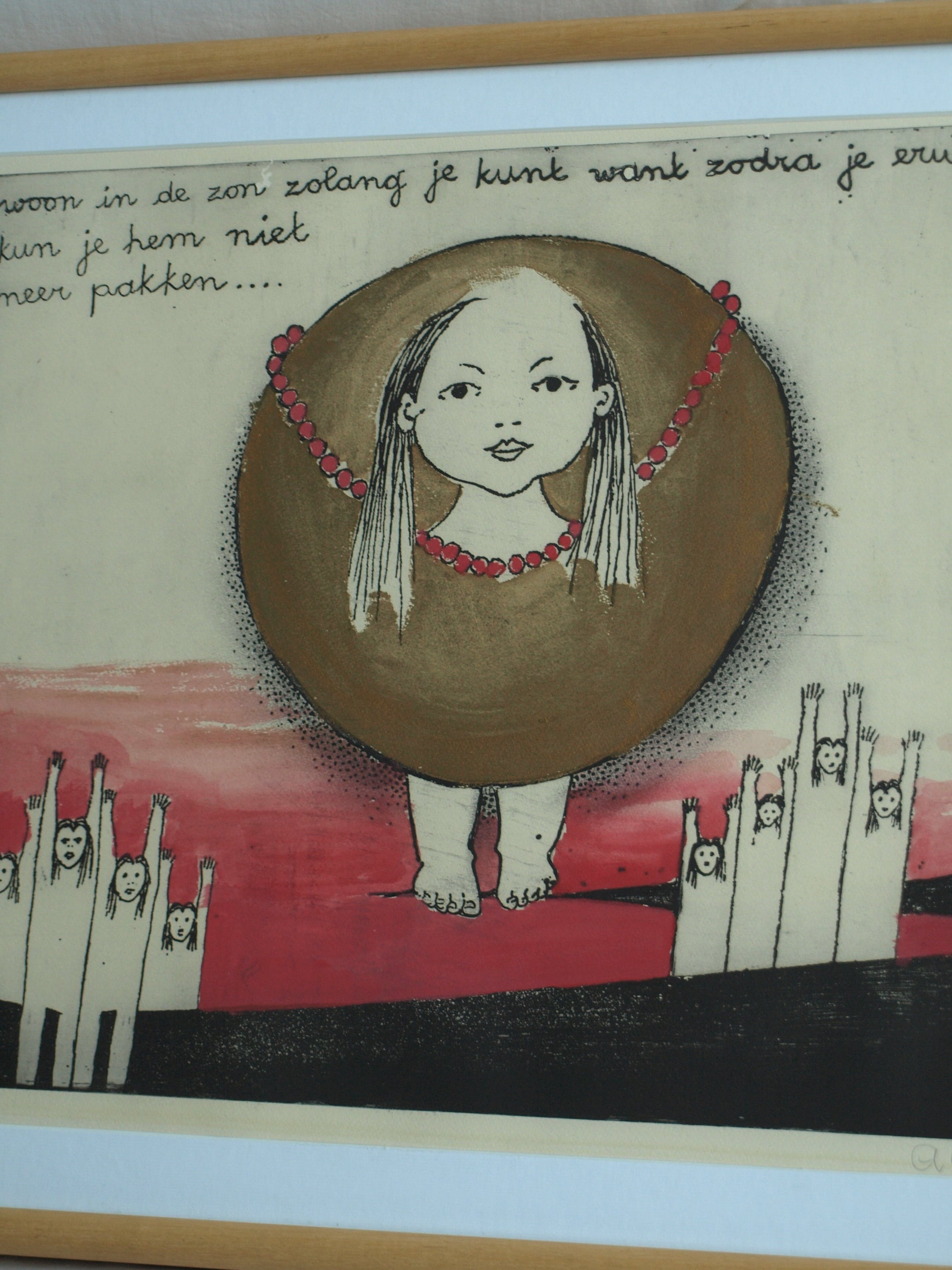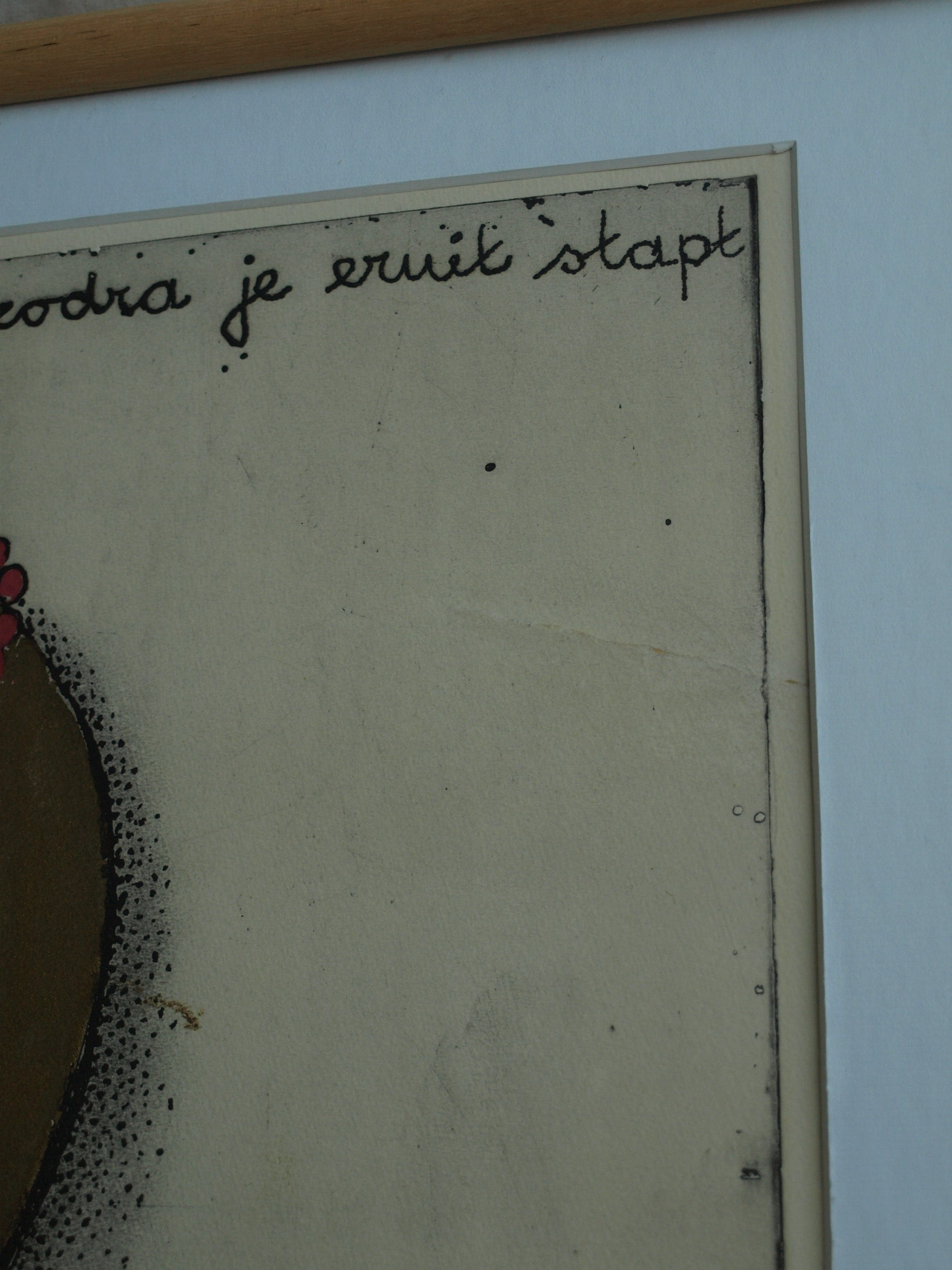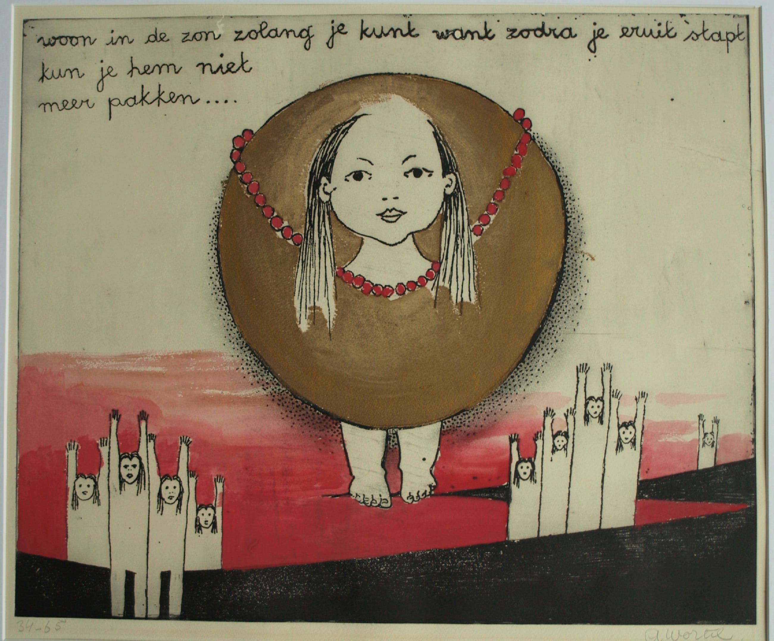 Een grote ingelijste en met de hand ingekleurde ets uit ca 1975 van de Nederlandse kunstenares Ans Wortel (1929-1996).