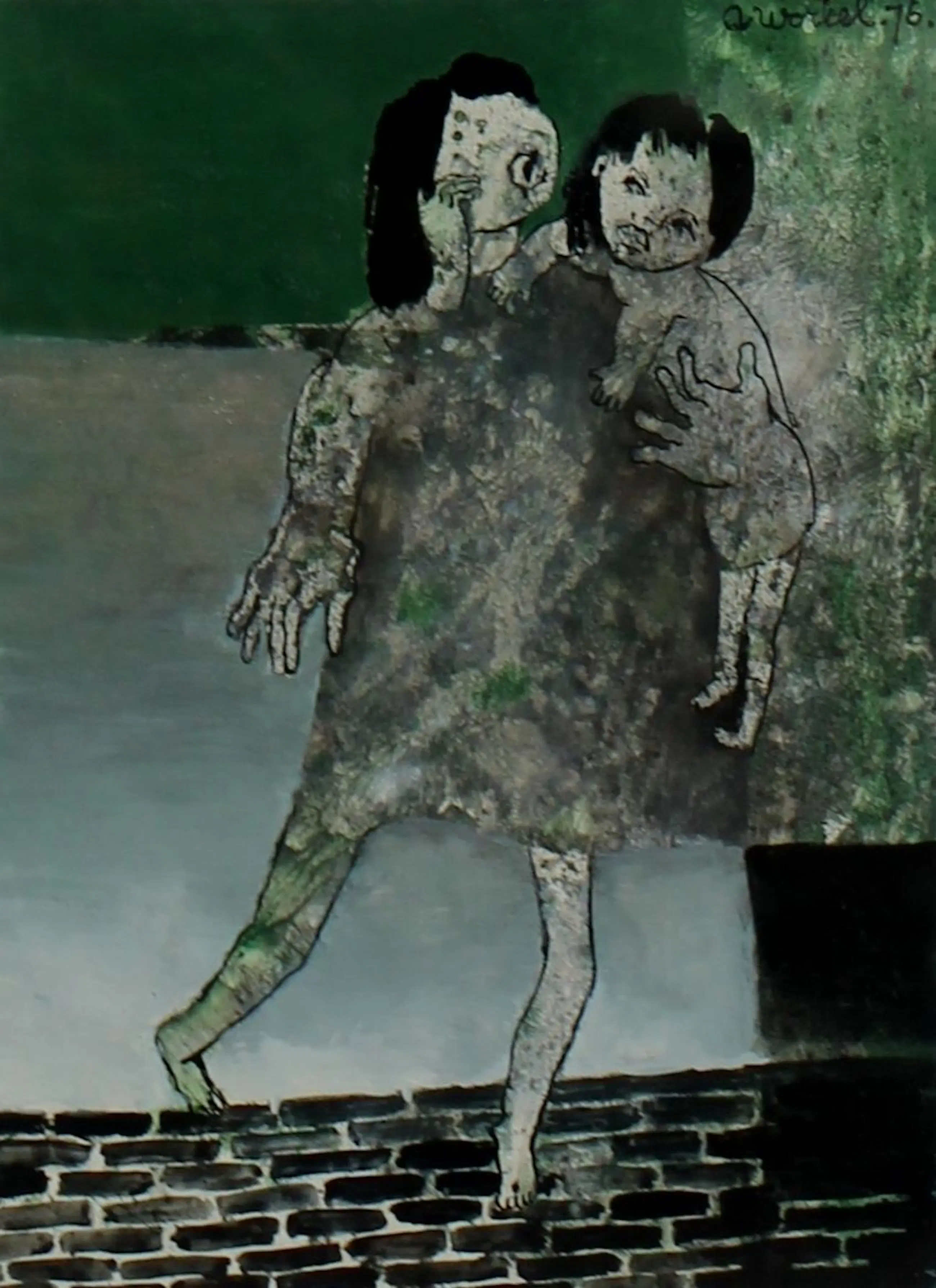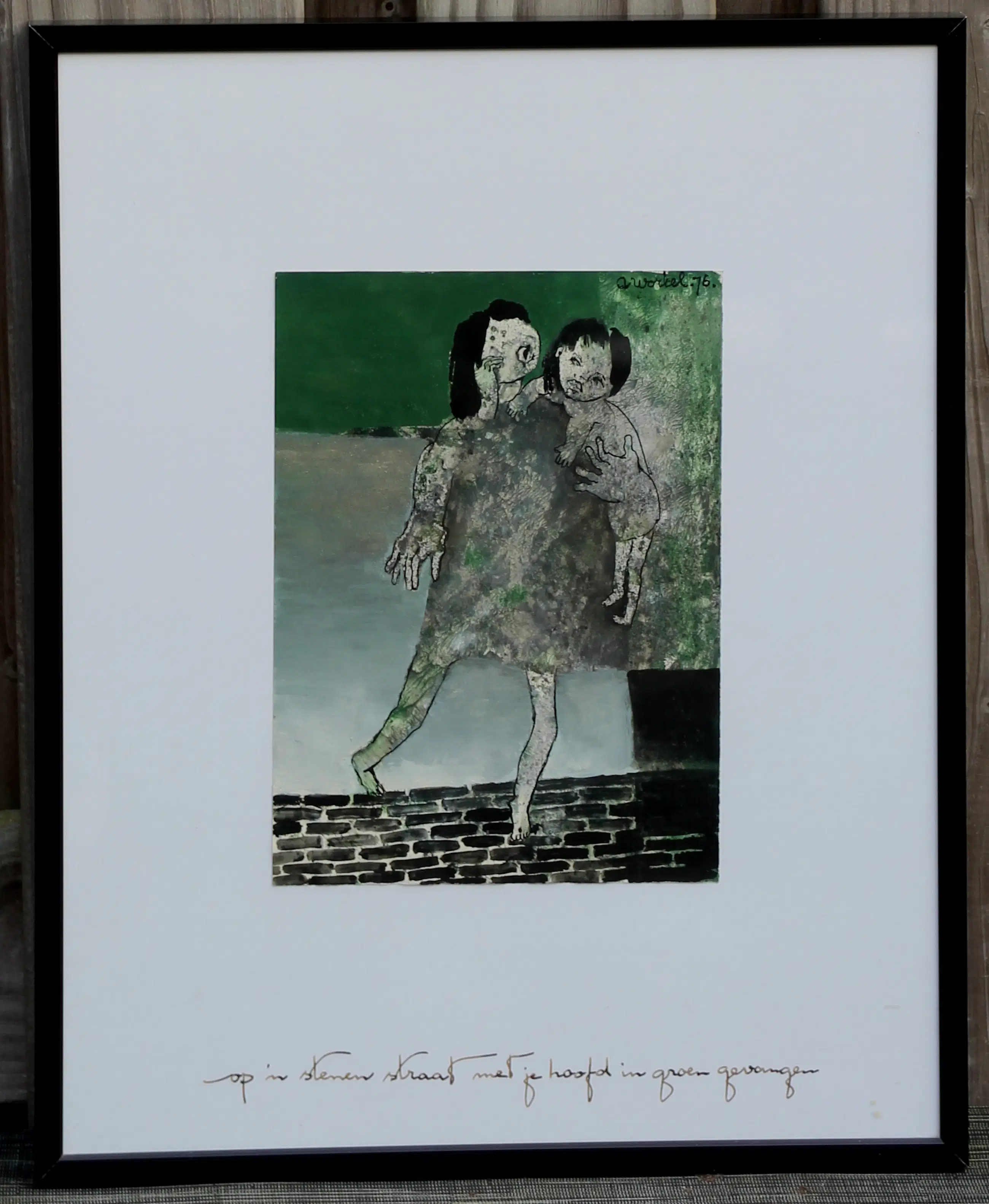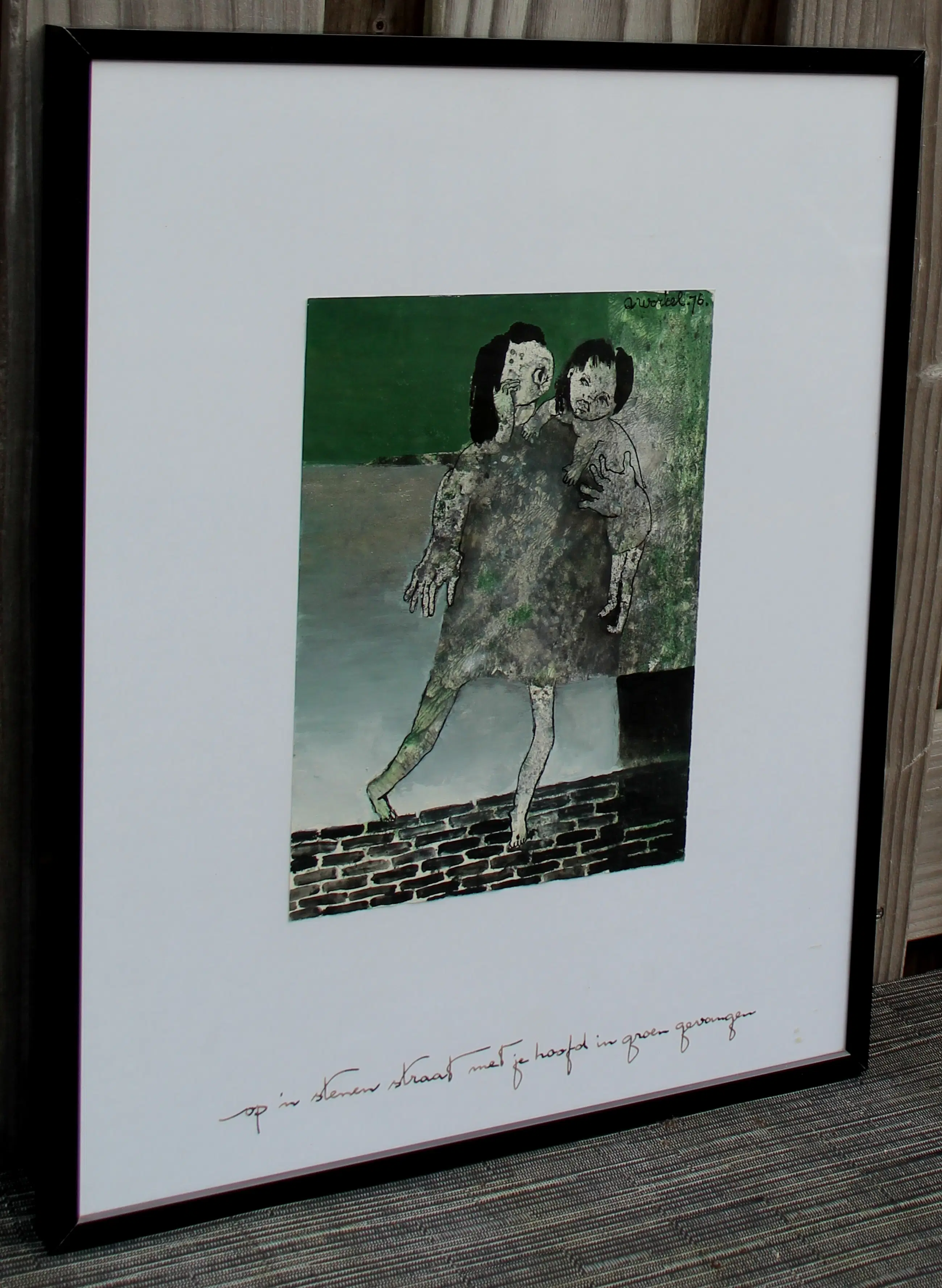 Ingelijste gemengde techniek van Ans Wortel. Titel: "Op 'm stenenstraat met je hoofd in groen gevangen". Jaar: 1976. Afmetingen incl lijst: H51 x b41.5cm. Afmetingen voorstelling: H28 x B20cm.