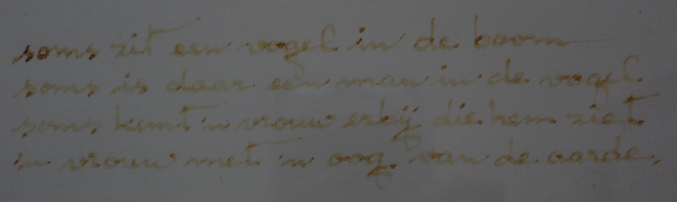 Het werk gaat meestal vergezeld van handgeschreven titels of teksten van poëtische aard.