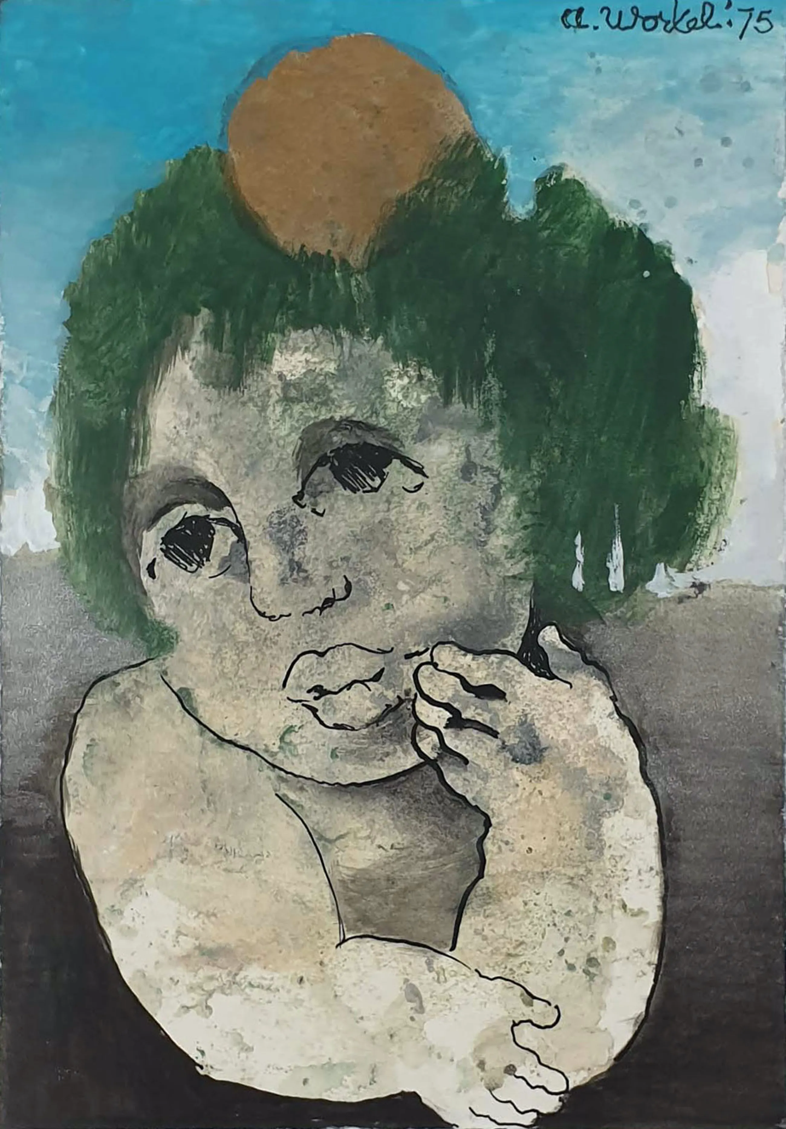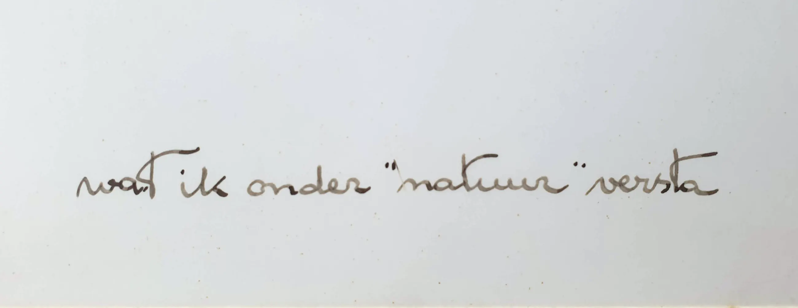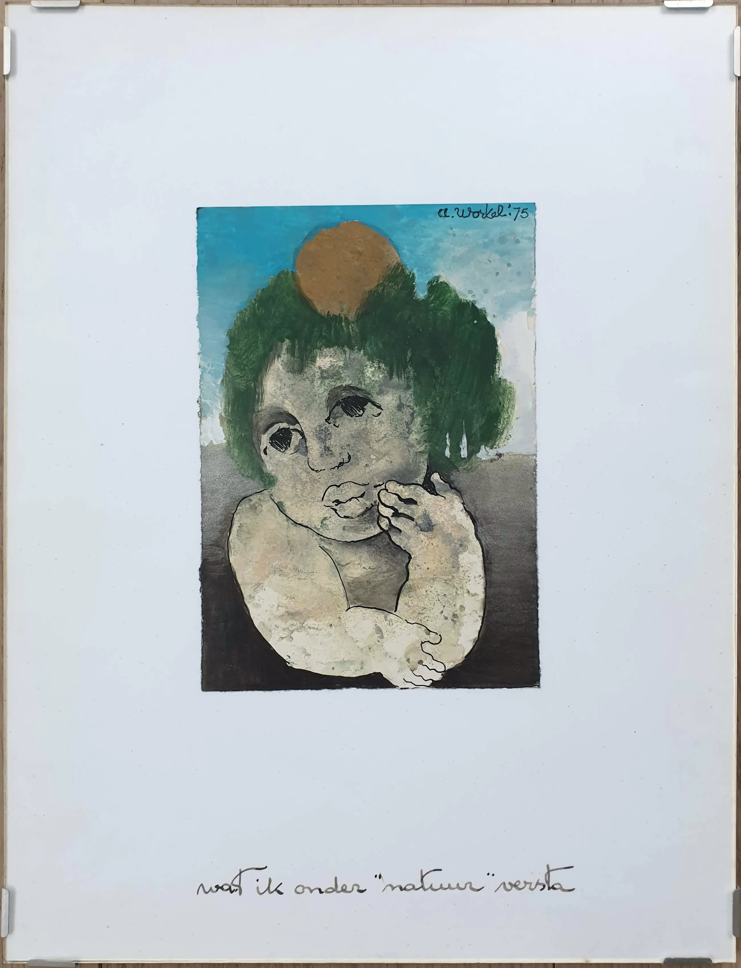 Gemengde techniek: Gouache, inkt van Ans Wortel met de titel: 'Wat ik onder "natuur" versta' uit 1975. Het werk is rechtsboven met de hand gesigneerd door de kunstenaar.