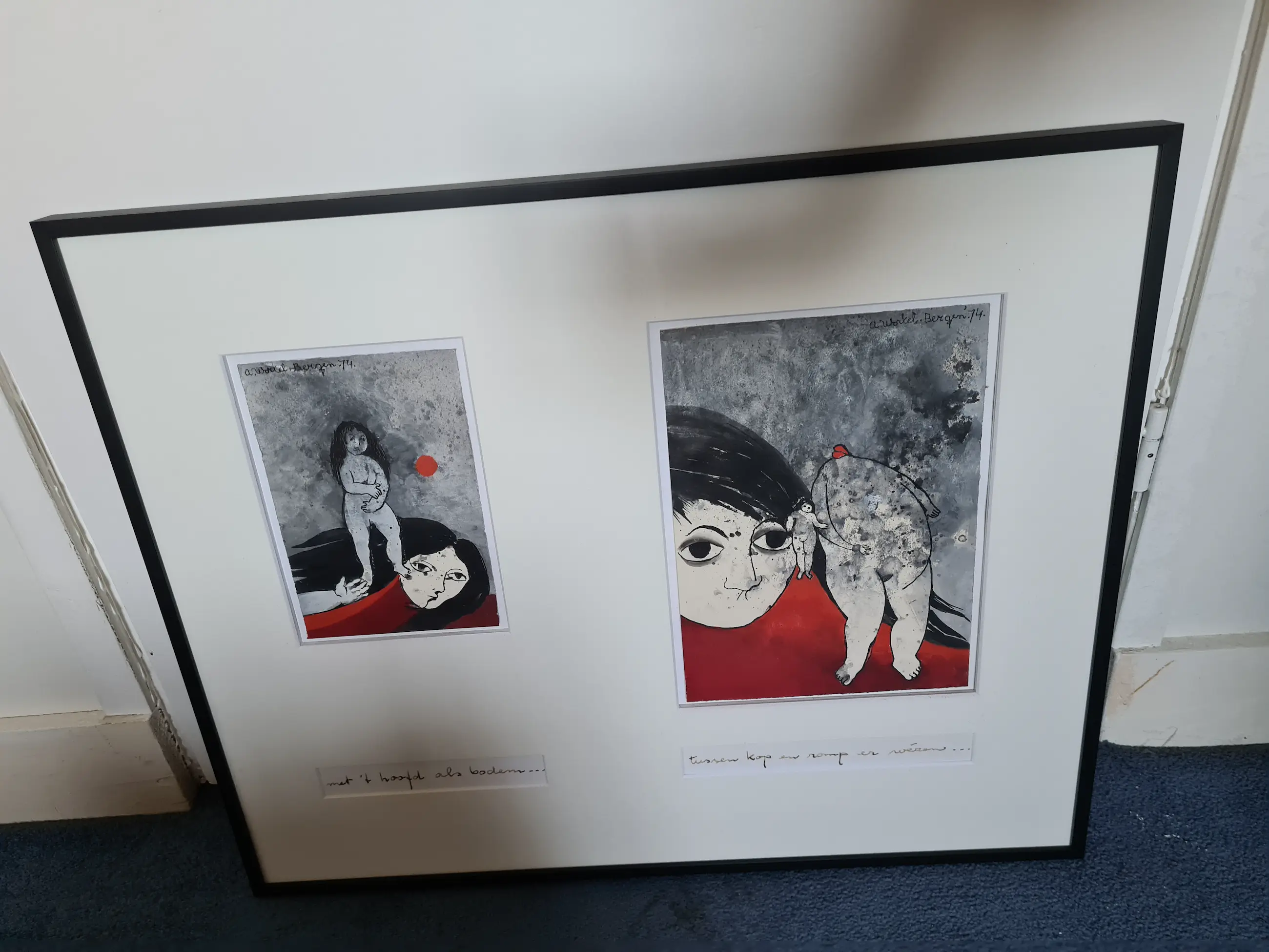 1ste gouache is 20 x 14 cm. titel: "met 't hoofd als bodem..."