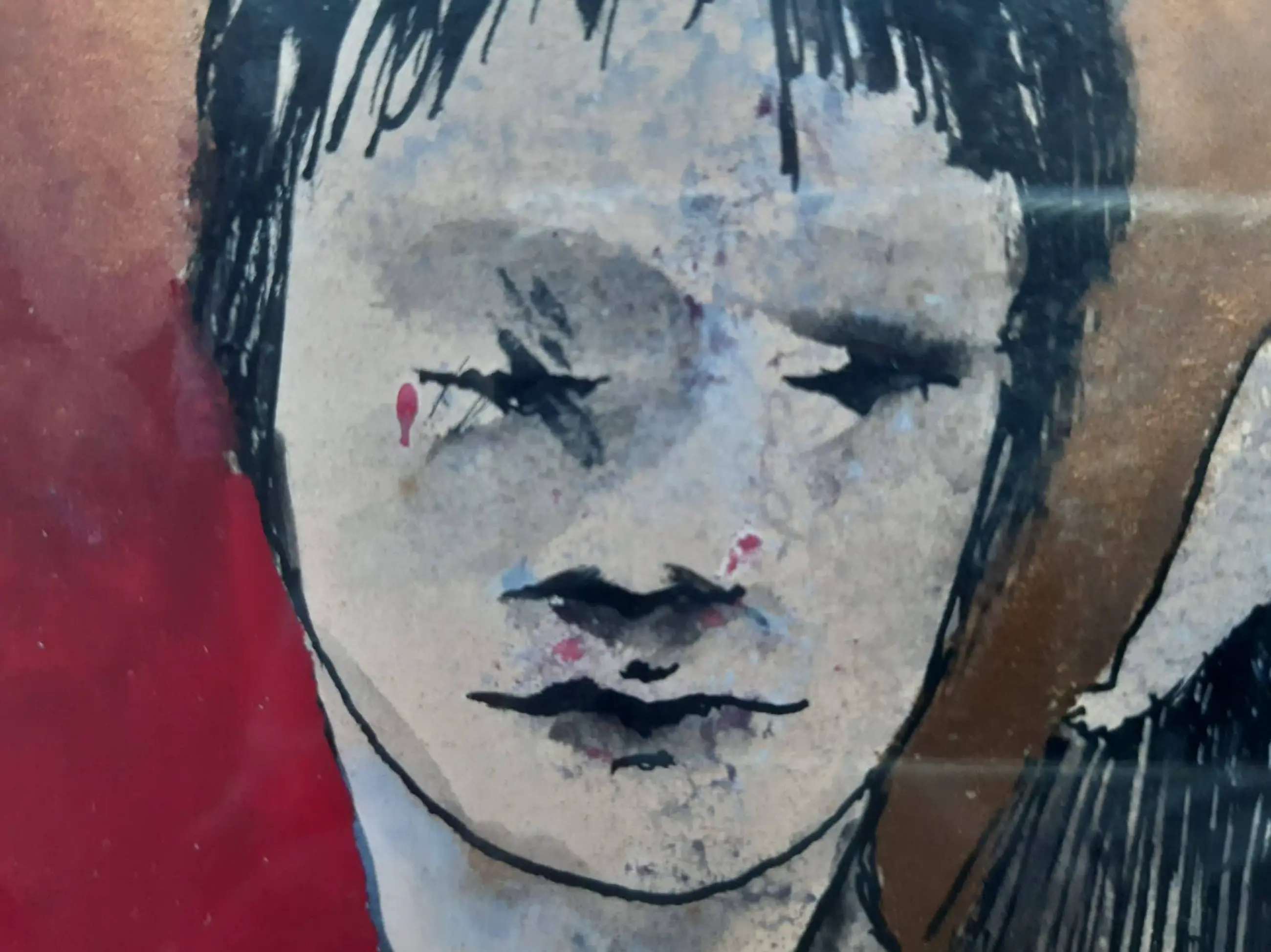 Gouache van een stel waarbij de vrouw kopzorgen over de kinderen of andere vrouwen lijkt te hebben. De man lijkt er ook niet heelhuids van af te komen.