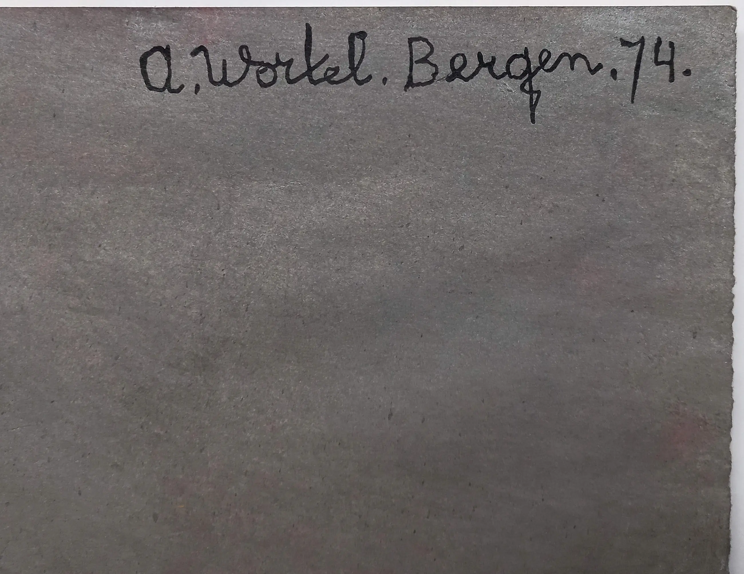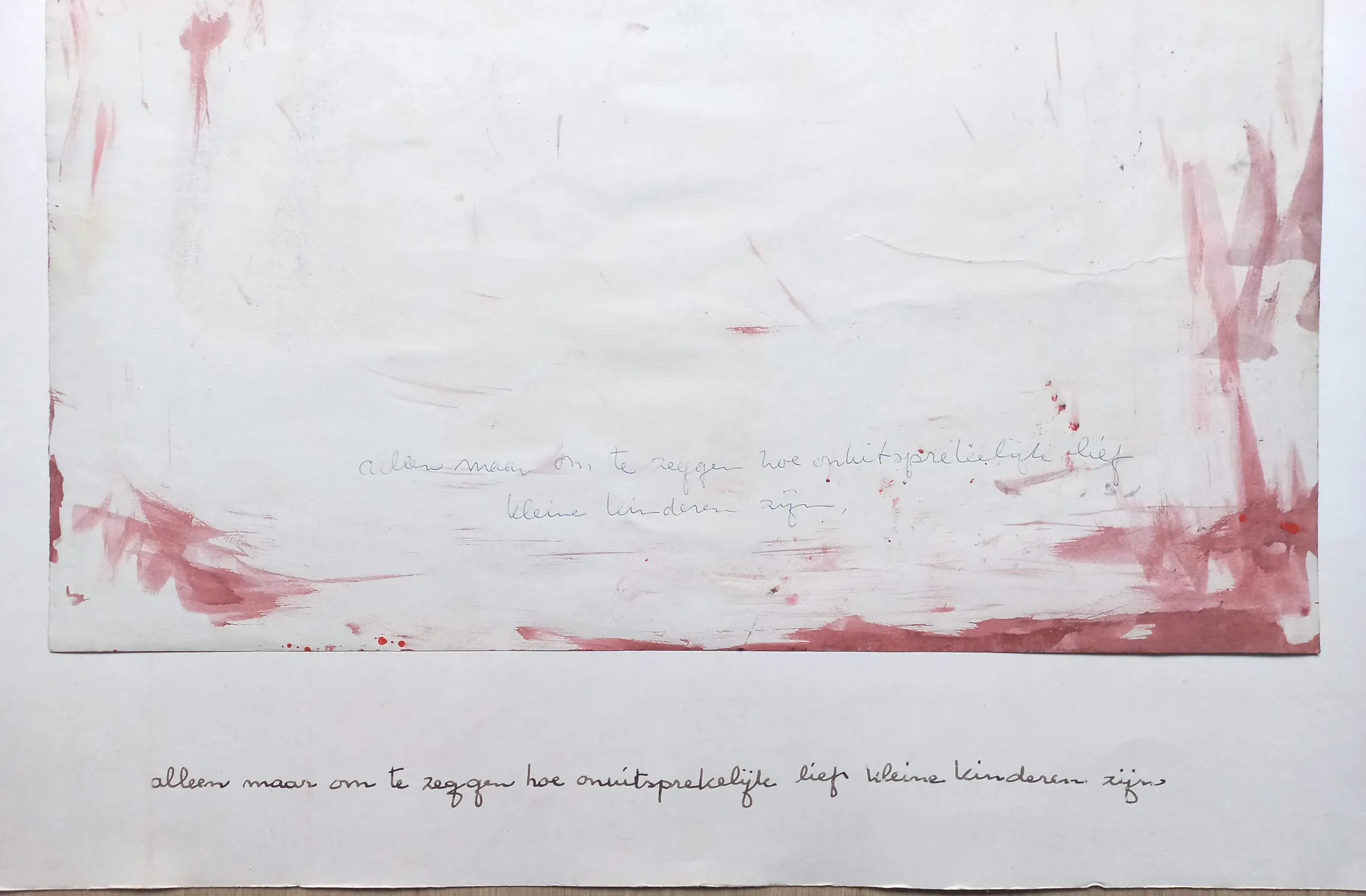 Prachtig, uiterst herkenbaar werk van Ans Wortel uit 1974. Gouache op papier, gesigneerd en gedateerd (‘74) rechtsboven met op de achterkant van het blad de volledige titel “alleen maar om te zeggen hoe onuitsprekelijk lief kleine kinderen zijn”. Los op het originele onderblad met onderaan nogmaals de volledige titel. In goede conditie.
