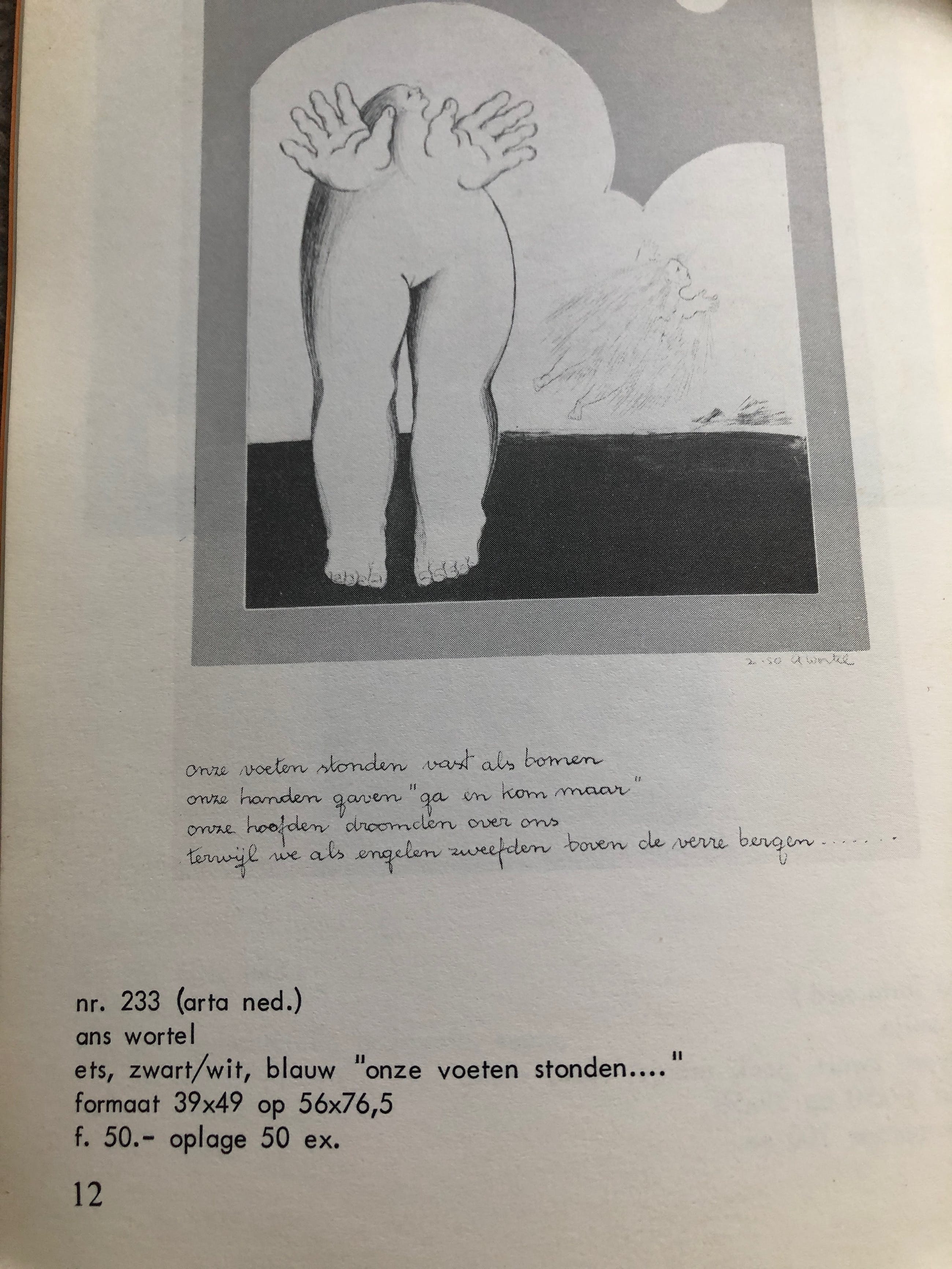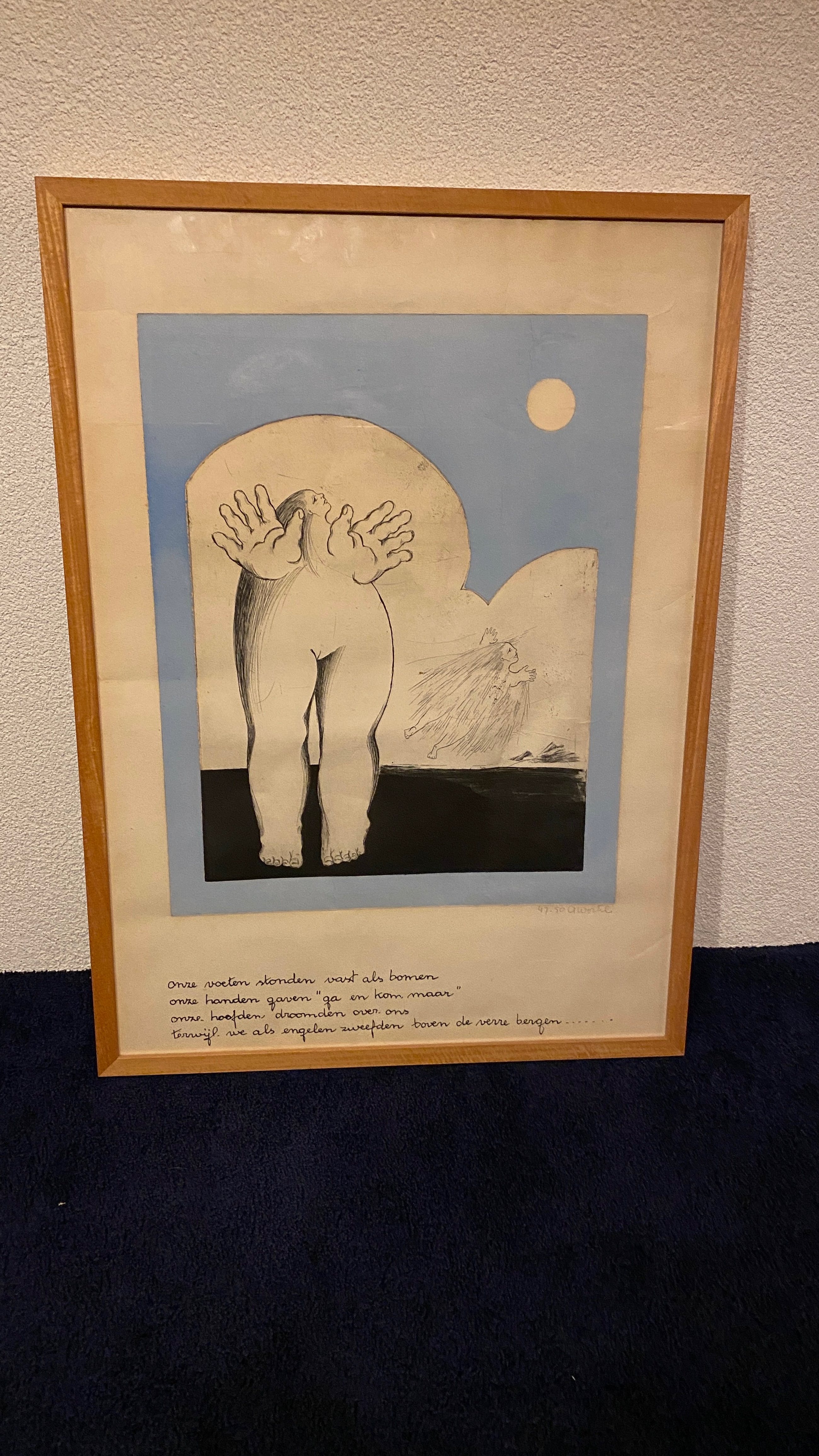Ets, zwart/wit, blauw Met tekst eronder oplage 50 ex - exp. 47 van 50 gekocht via Arta nr 21 (Internationale vereniging van vrienden van de grafische kunst) catalogus bijgesloten. Graag ophalen omdat verzenden in lijst lastig is.