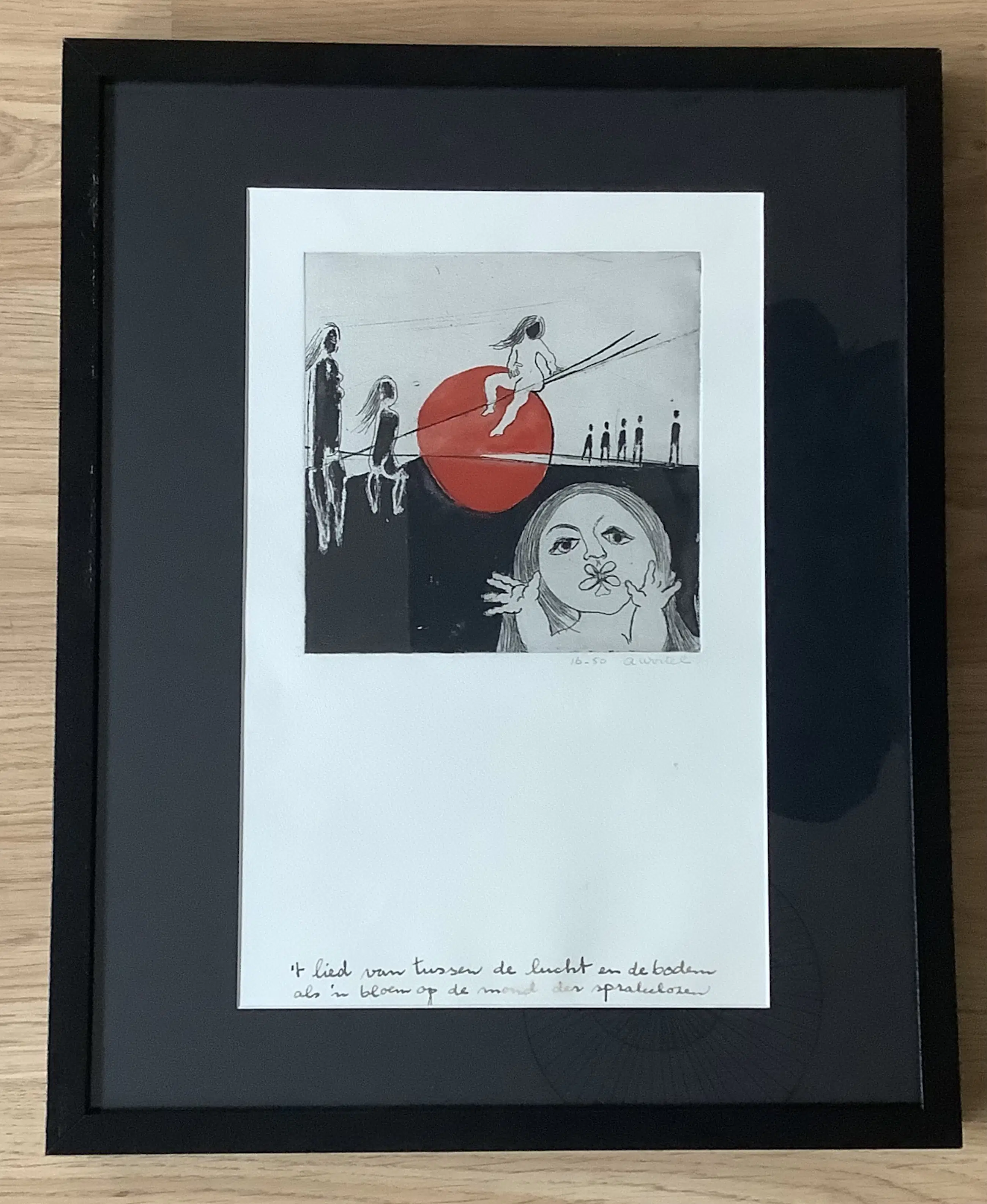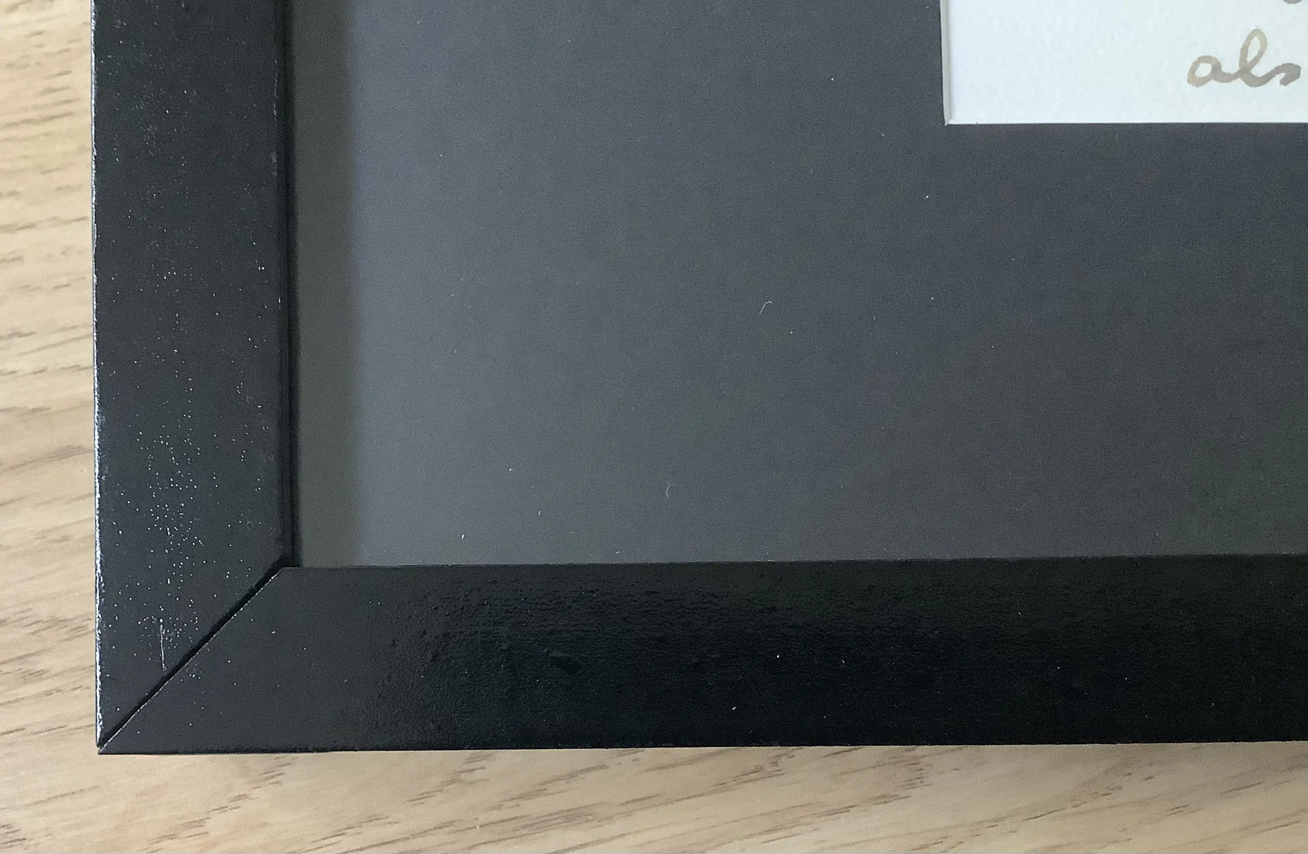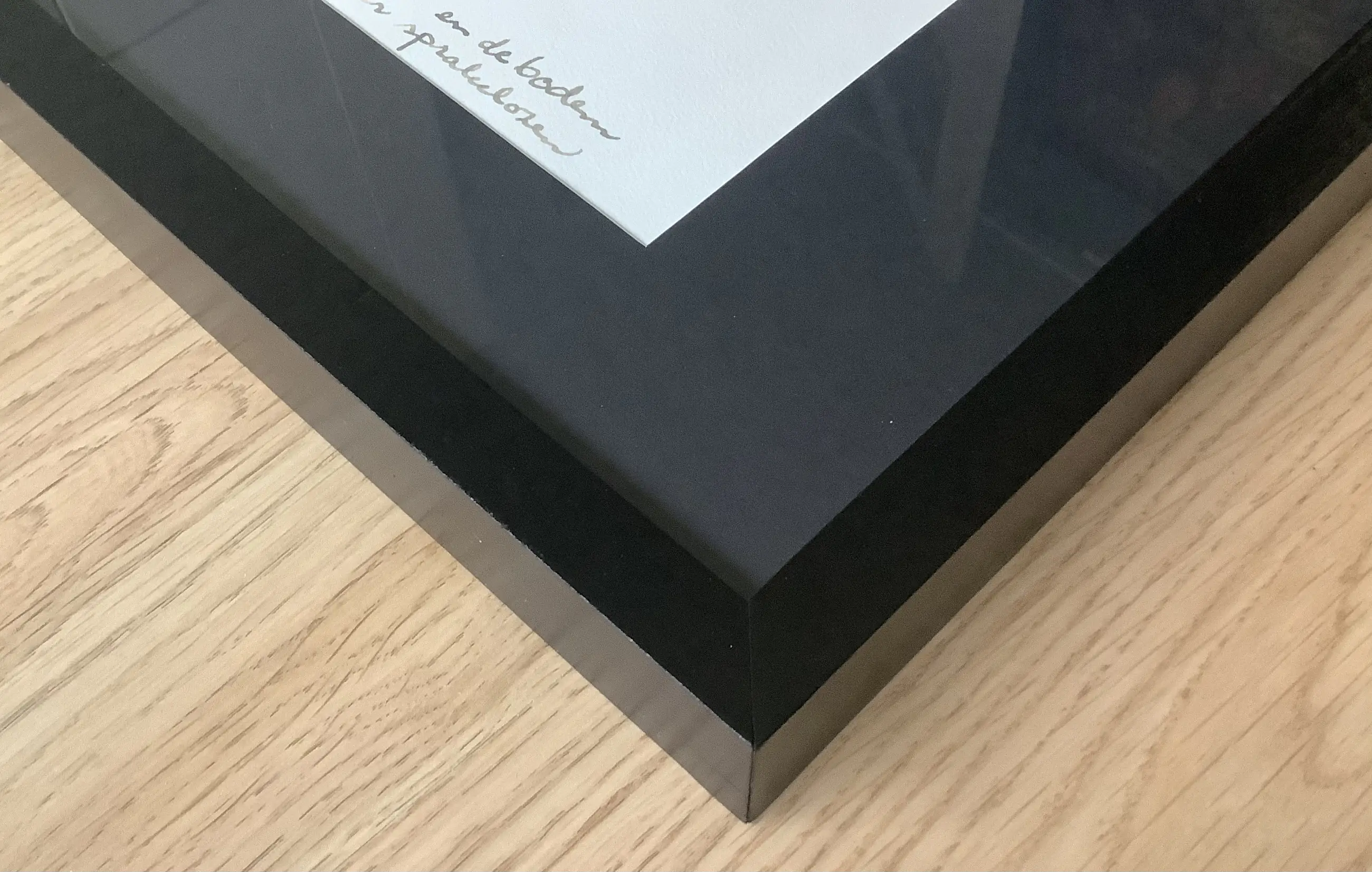 Ingelijst: Ja, in zwarte houten lijst, 2 cm breed en 3,5 cm hoog in een zwart passe partout. De lijst heeft een paar zeer kleine plekjes gebruikersschade, zie foto’s.