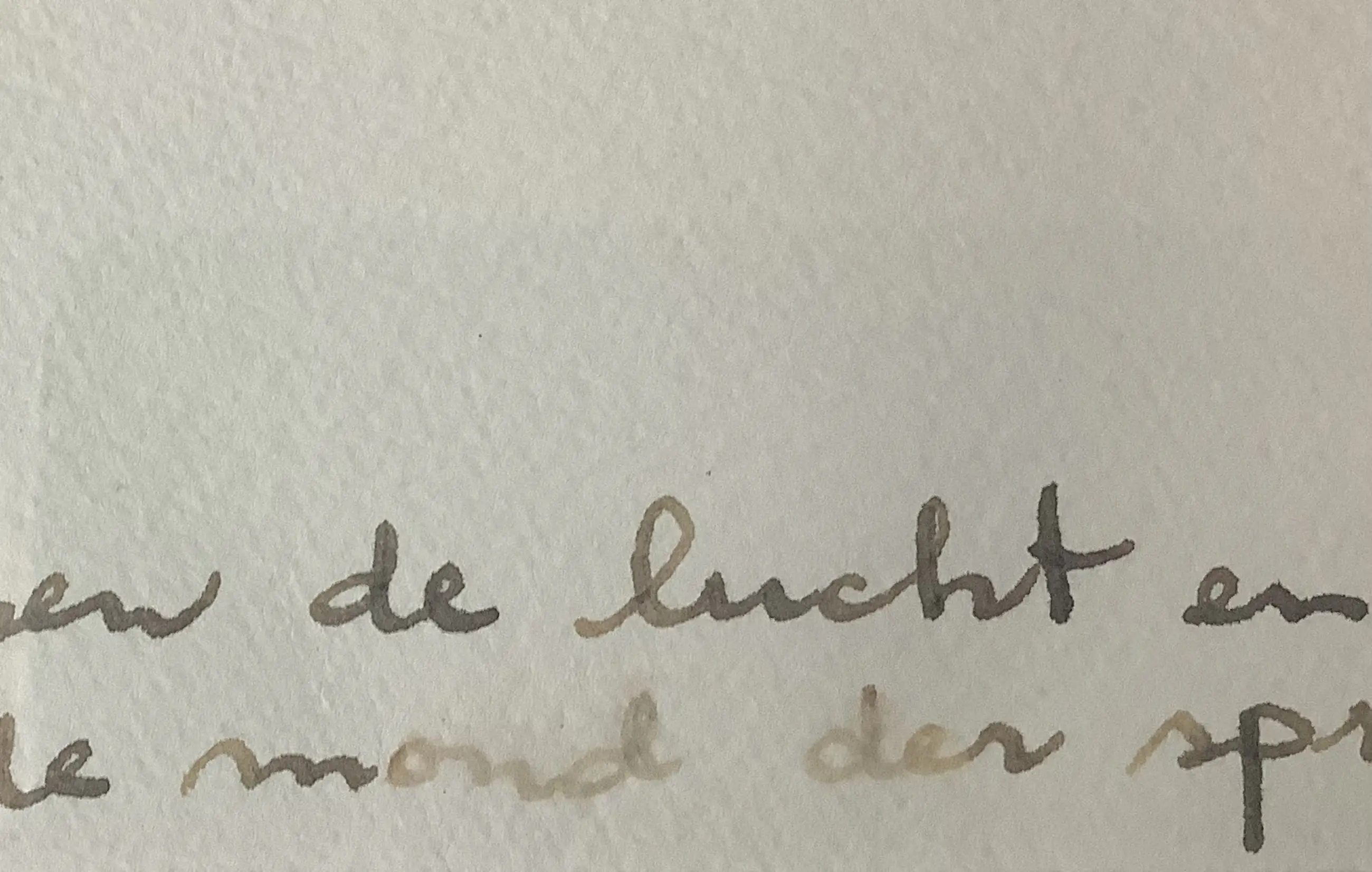 Het werk gaat meestal vergezeld van handgeschreven titels of teksten van poëtische aard.