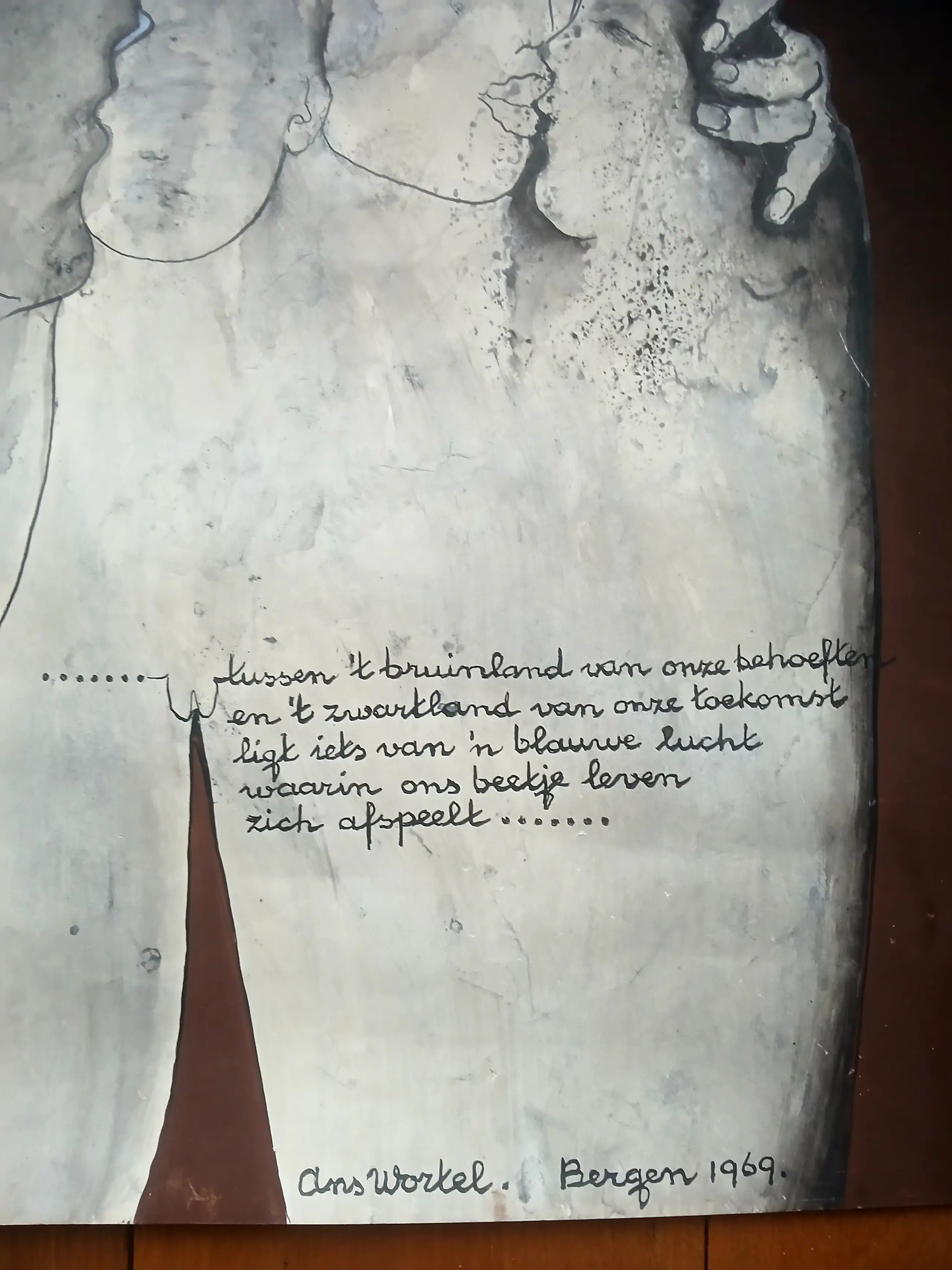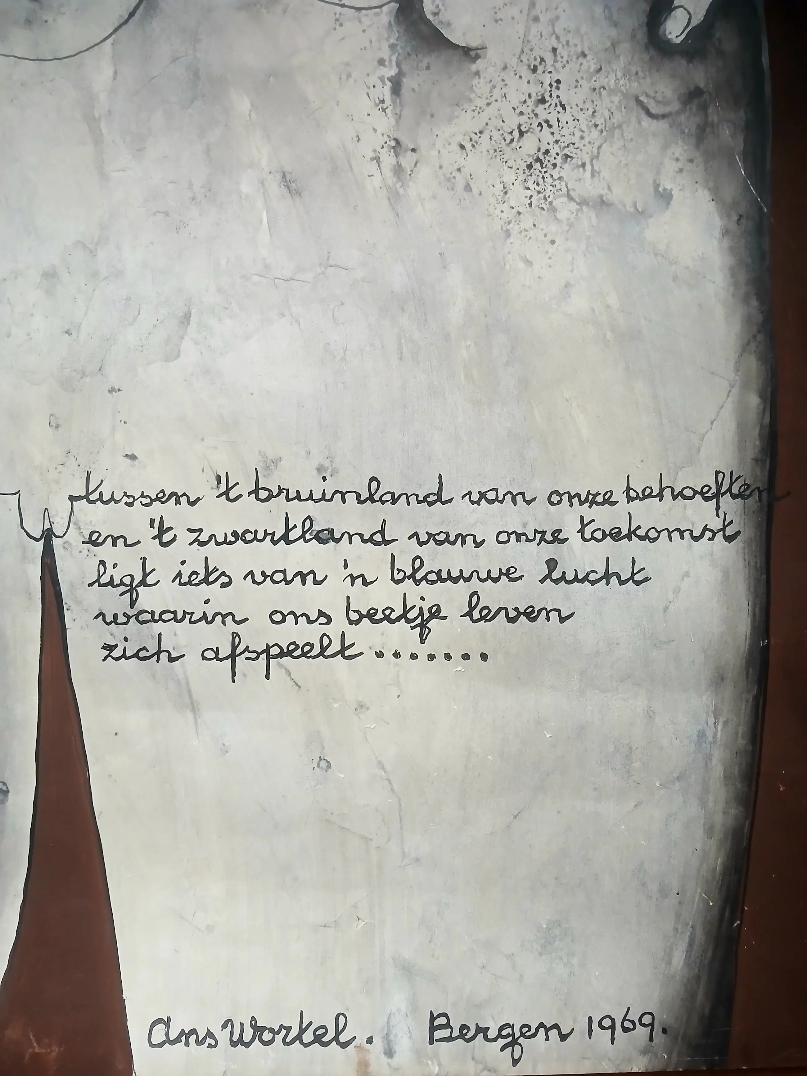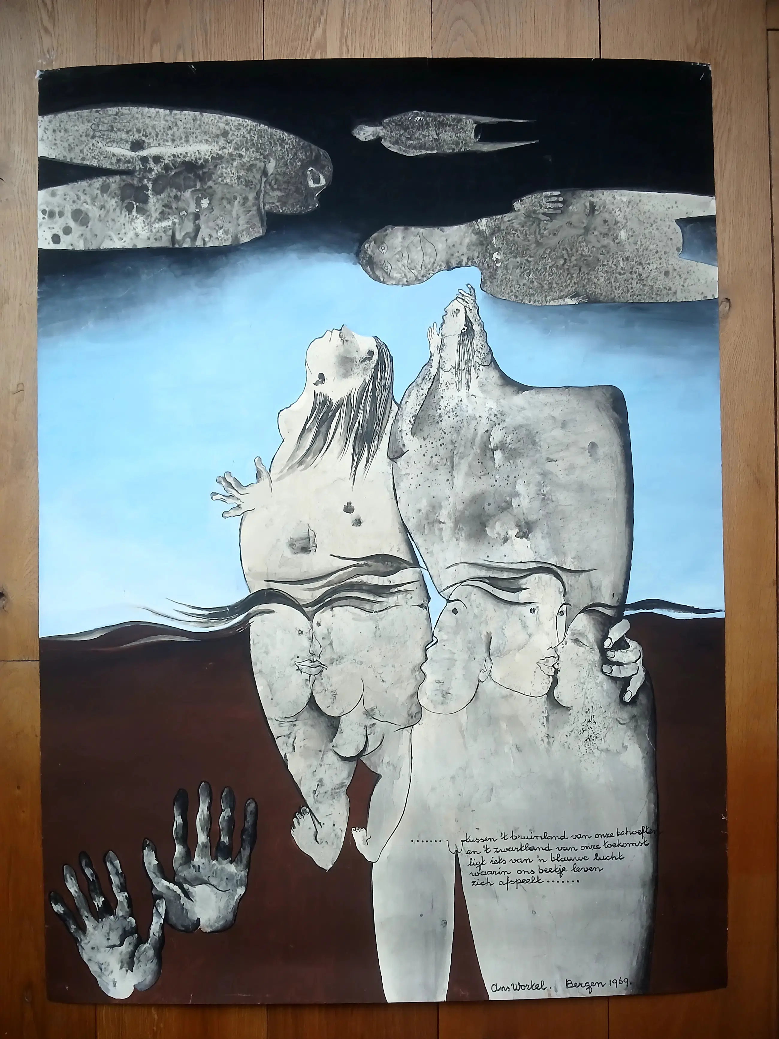Groot en oud week van de kunstenares Ans Wortel. In vrij goede staat. Gebruik van mooie passende kleuren heeft Ans hier ook weer een fraaie tekst genoteerd op het werk. Als u het laat zetten in een passende lijst met paspartout, zal dit werk van Ans Wortel straks misschien uw atelier, kantoor of woonkamer sieren. Het wordt in een stevige koker verzonden.