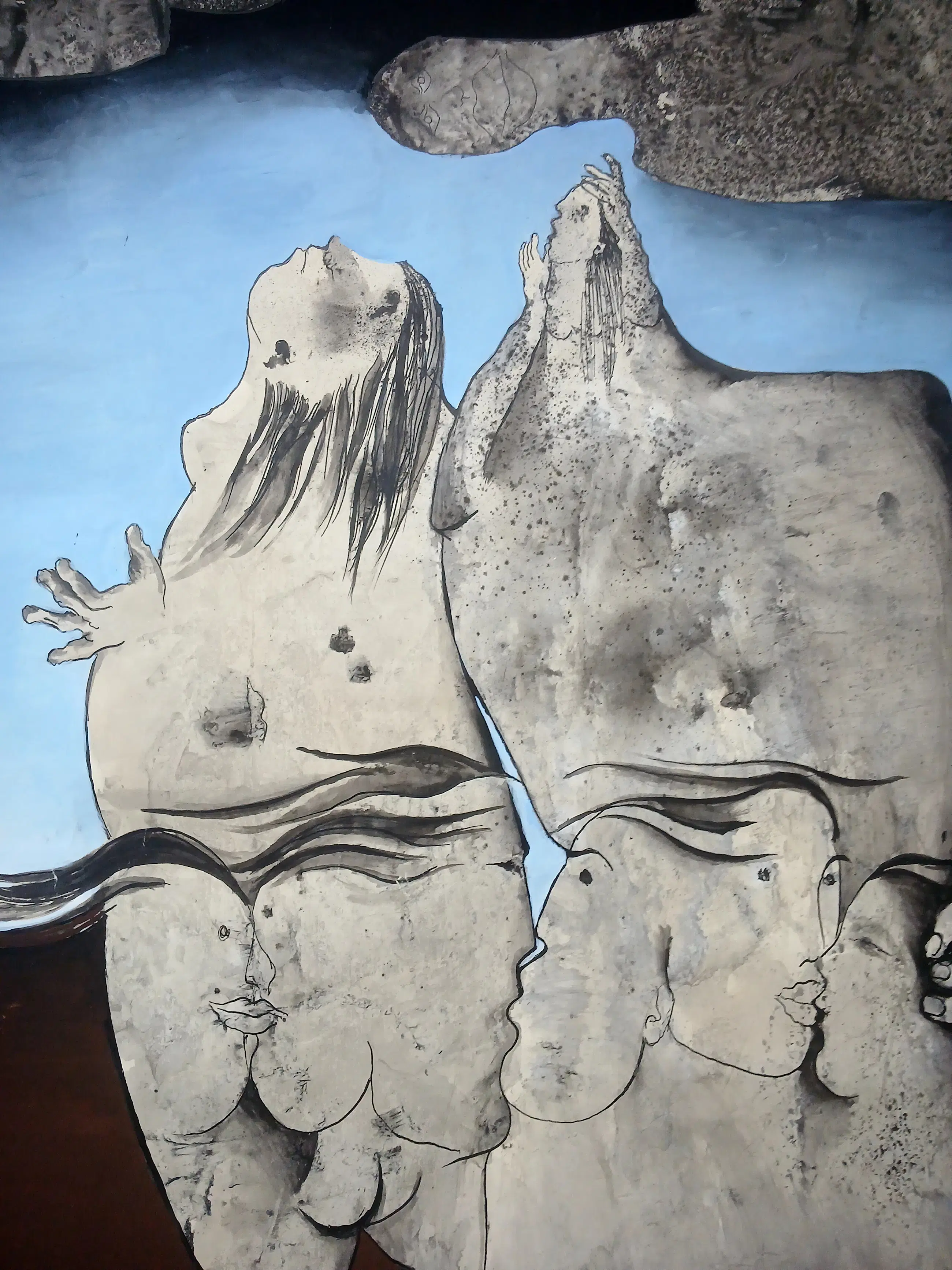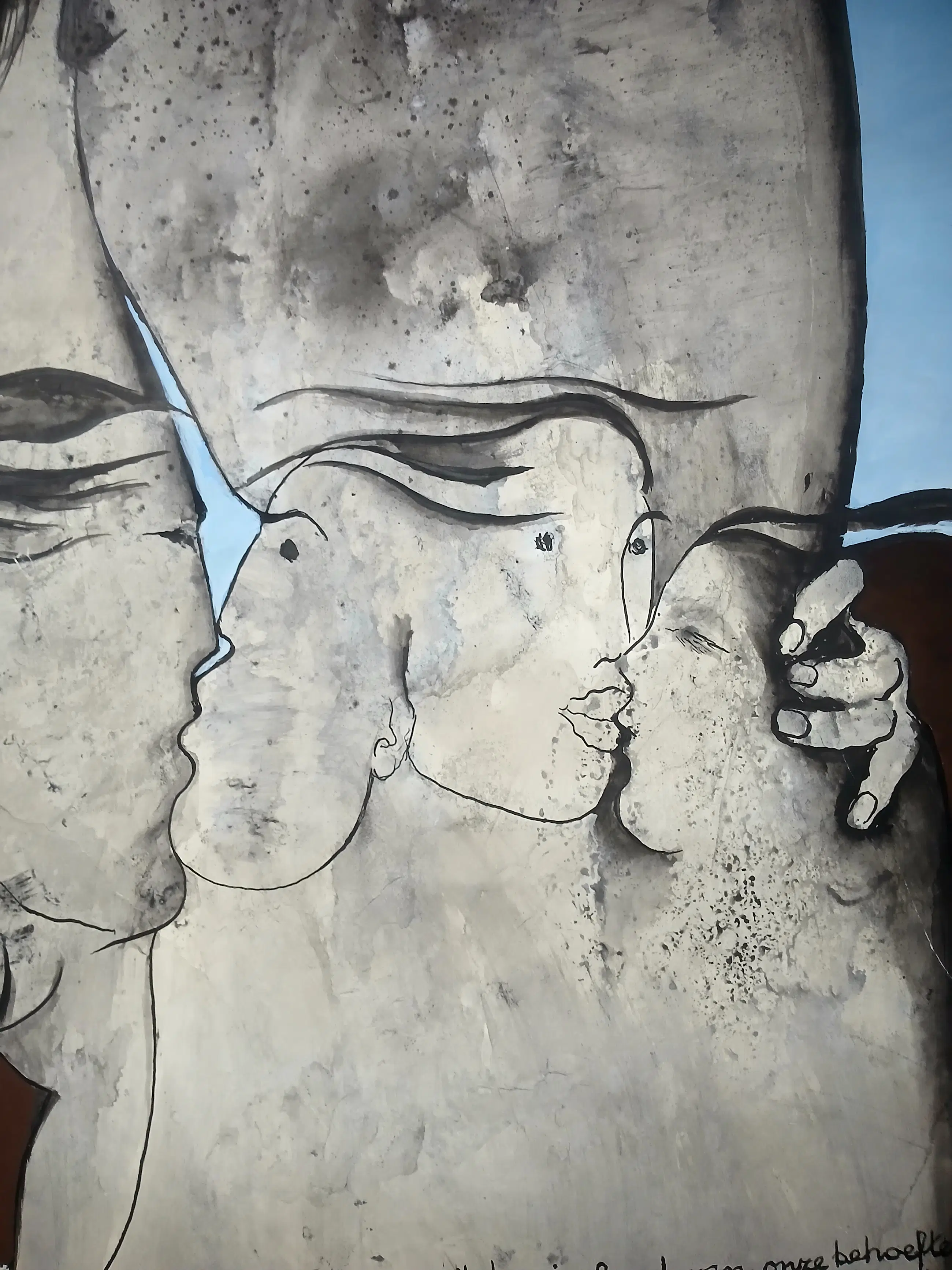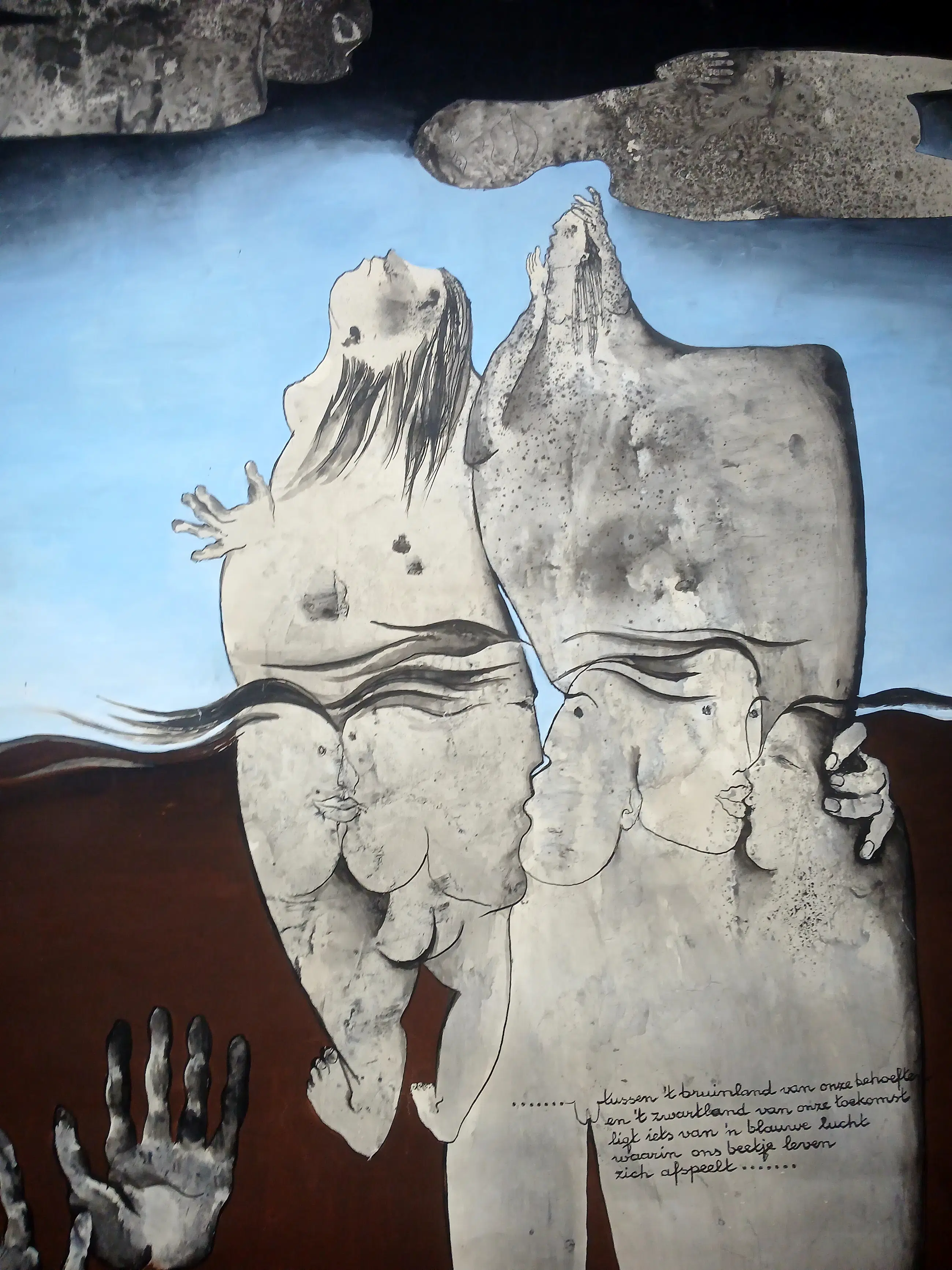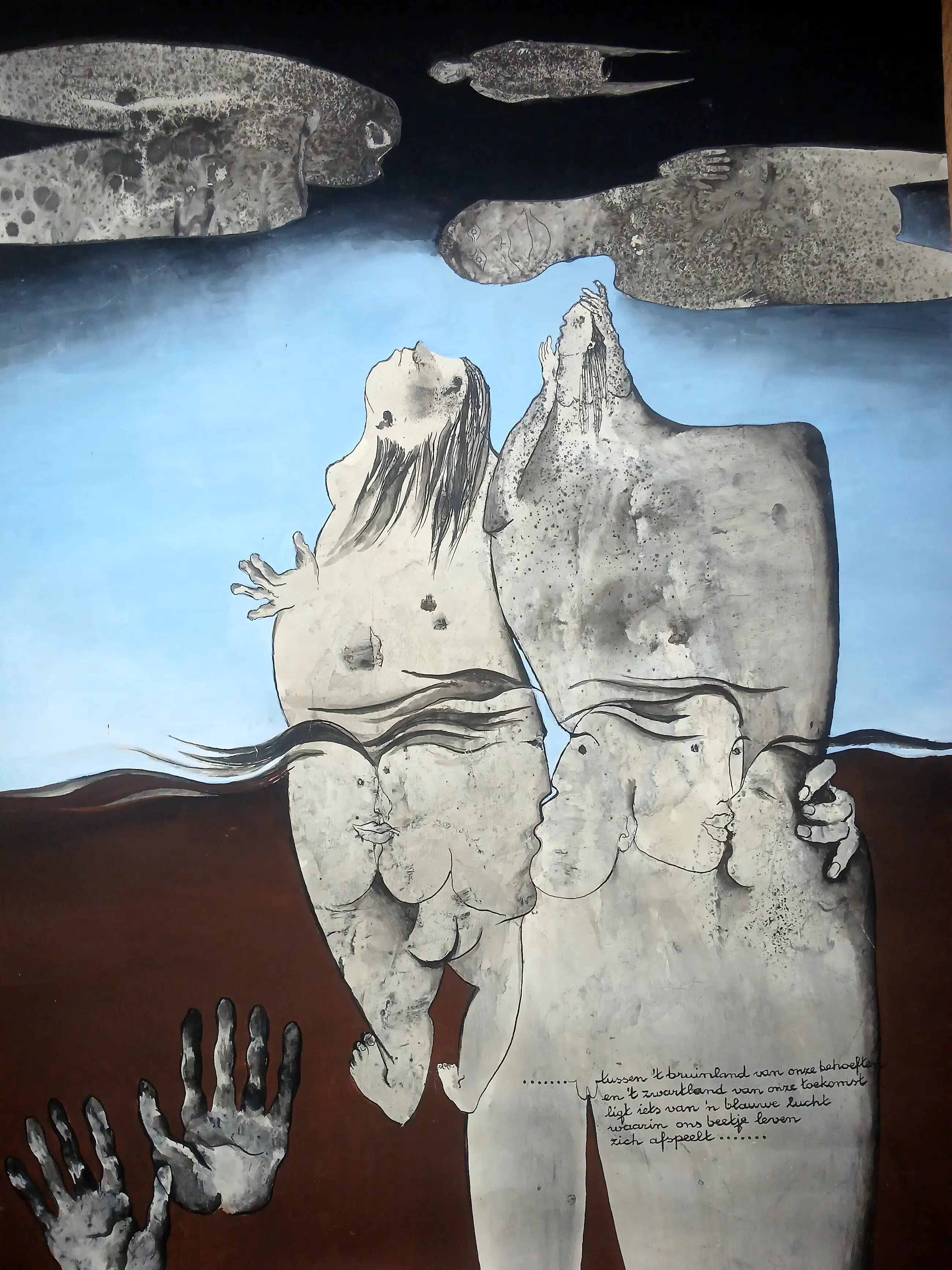 Groot en oud week van de kunstenares Ans Wortel. In vrij goede staat. Gebruik van mooie passende kleuren heeft Ans hier ook weer een fraaie tekst genoteerd op het werk. Als u het laat zetten in een passende lijst met paspartout, zal dit werk van Ans Wortel straks misschien uw atelier, kantoor of woonkamer sieren. Het wordt in een stevige koker verzonden.