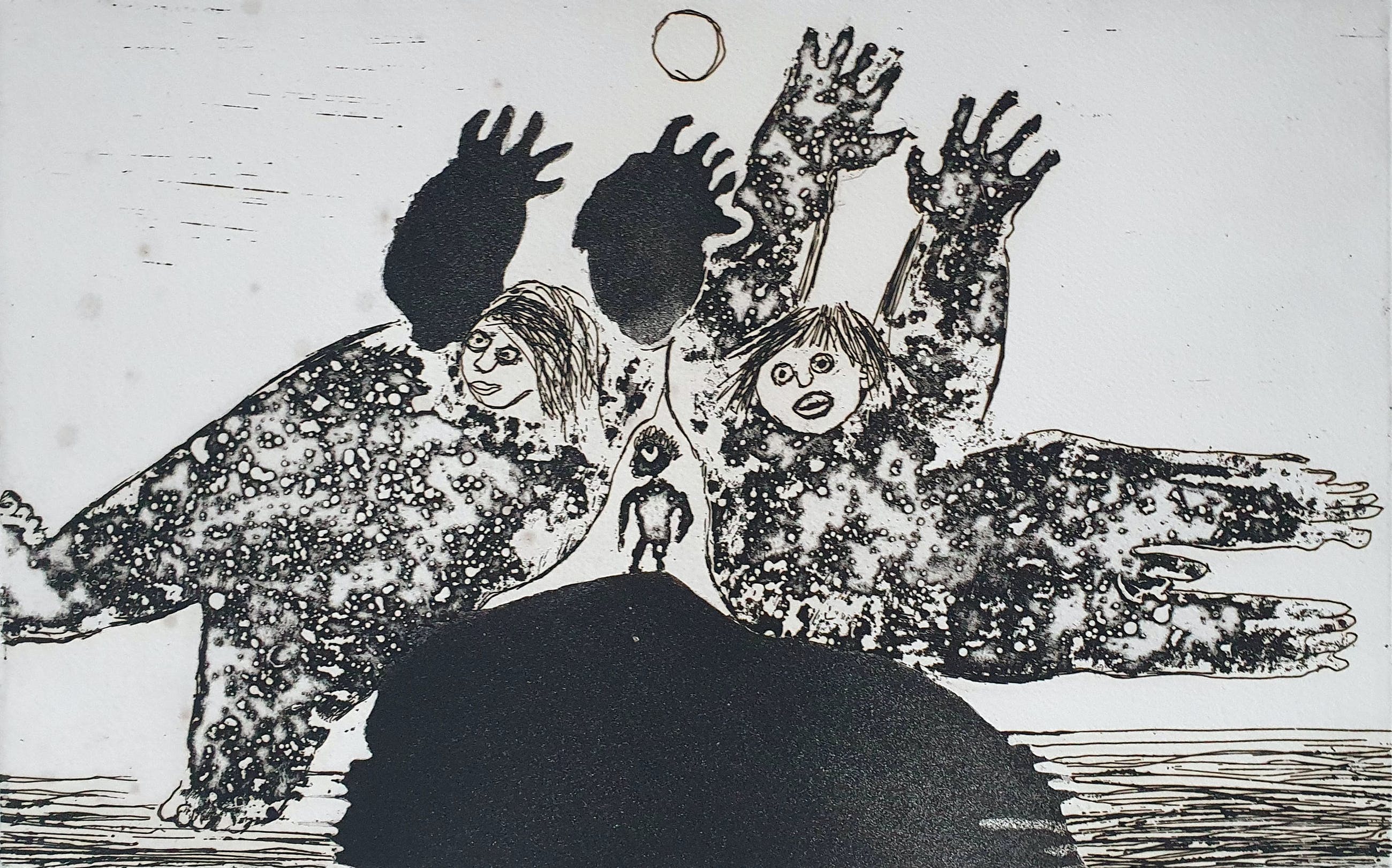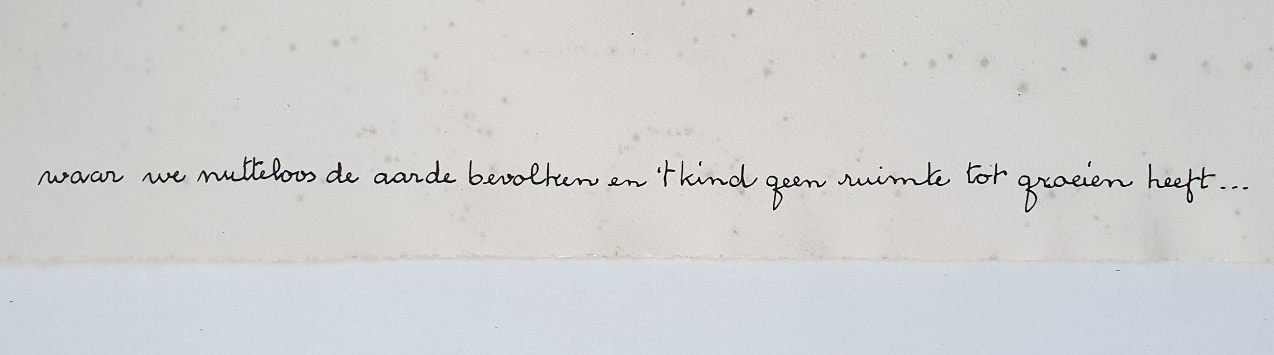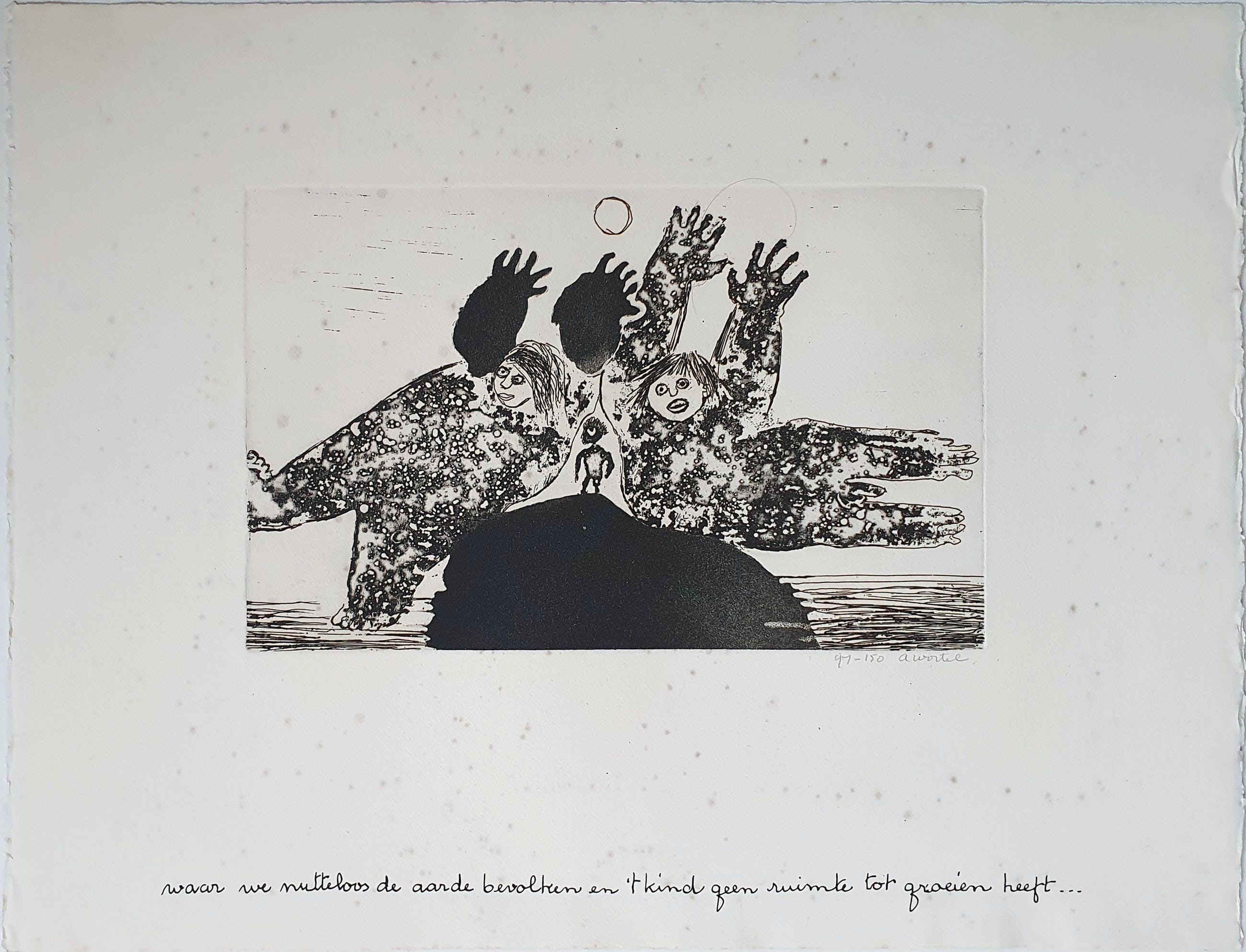 Ets van Ans Wortel met de titel: 'Waar we nutteloos de aarde bevolken' uit 1974. Het werk is rechtsonder met de hand gesigneerd door de kunstenaar.