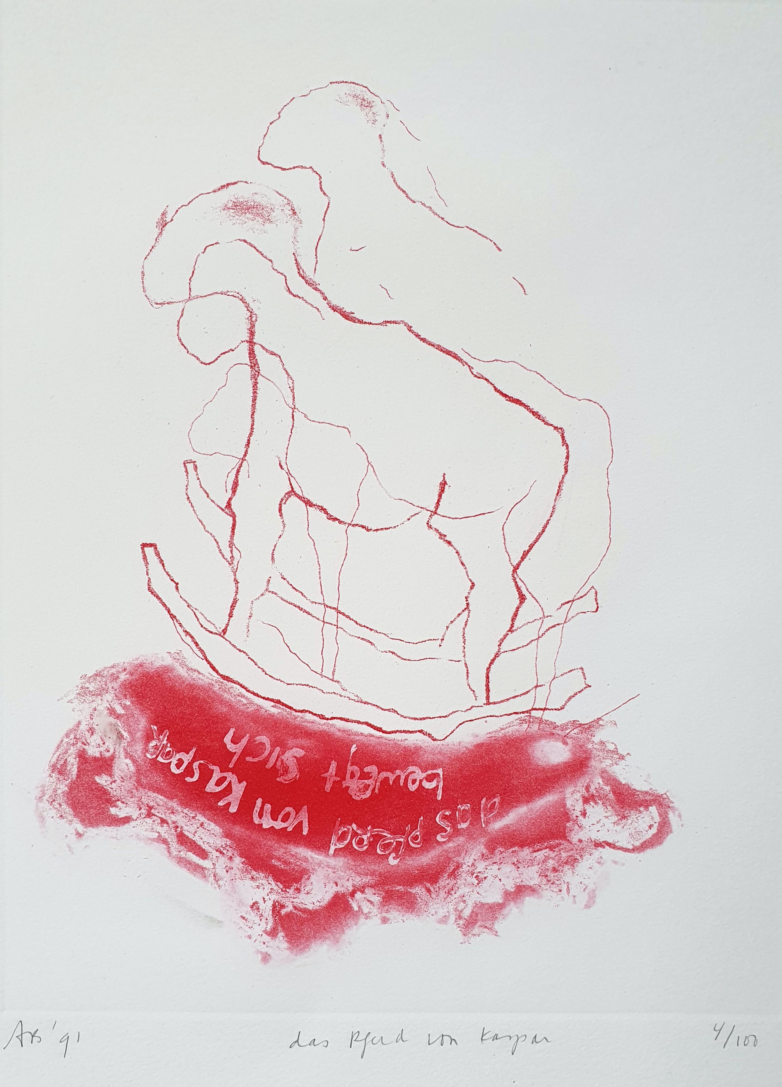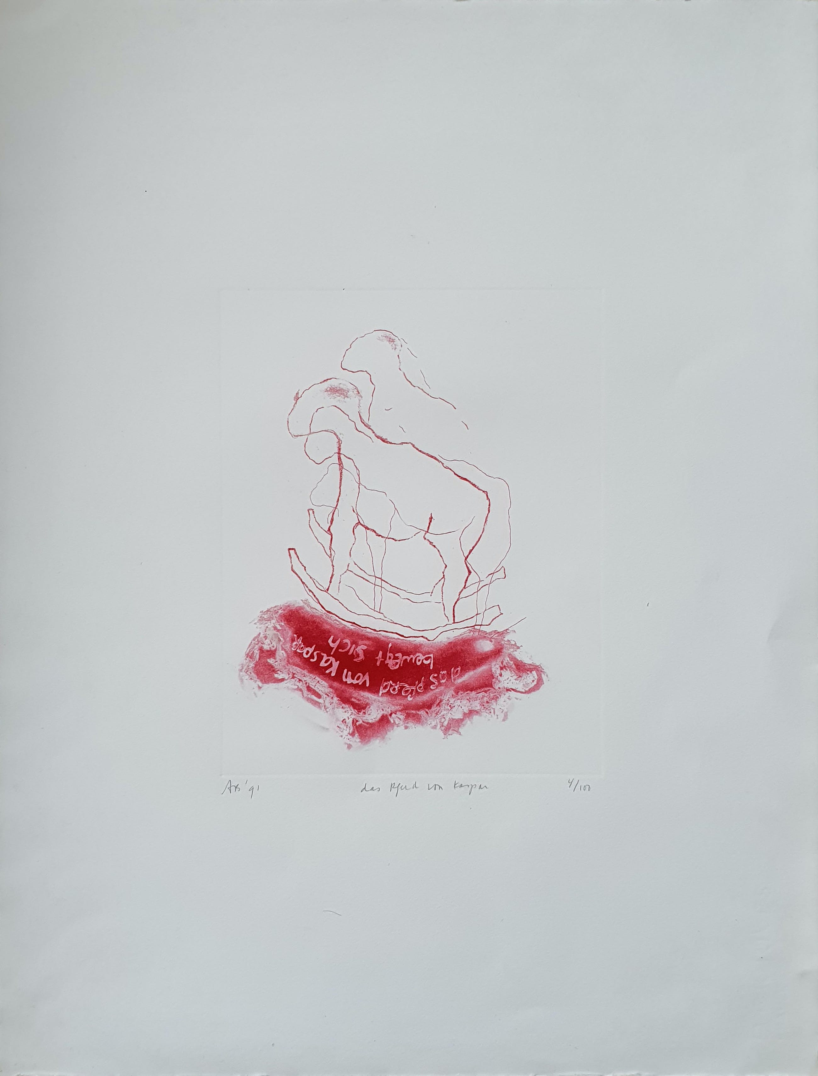Ets uit 1991 van Ansuya Blom met de titel: 'Das Pferd vom Kaspar'. Het werk is linksonder met de hand gesigneerd door de kunstenaar.