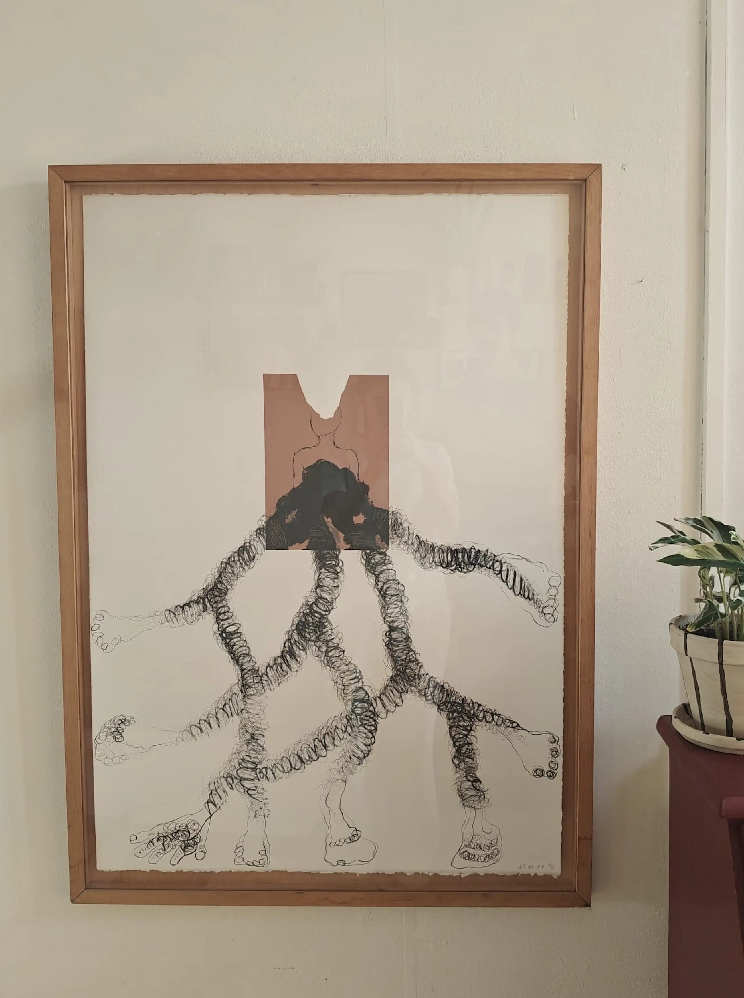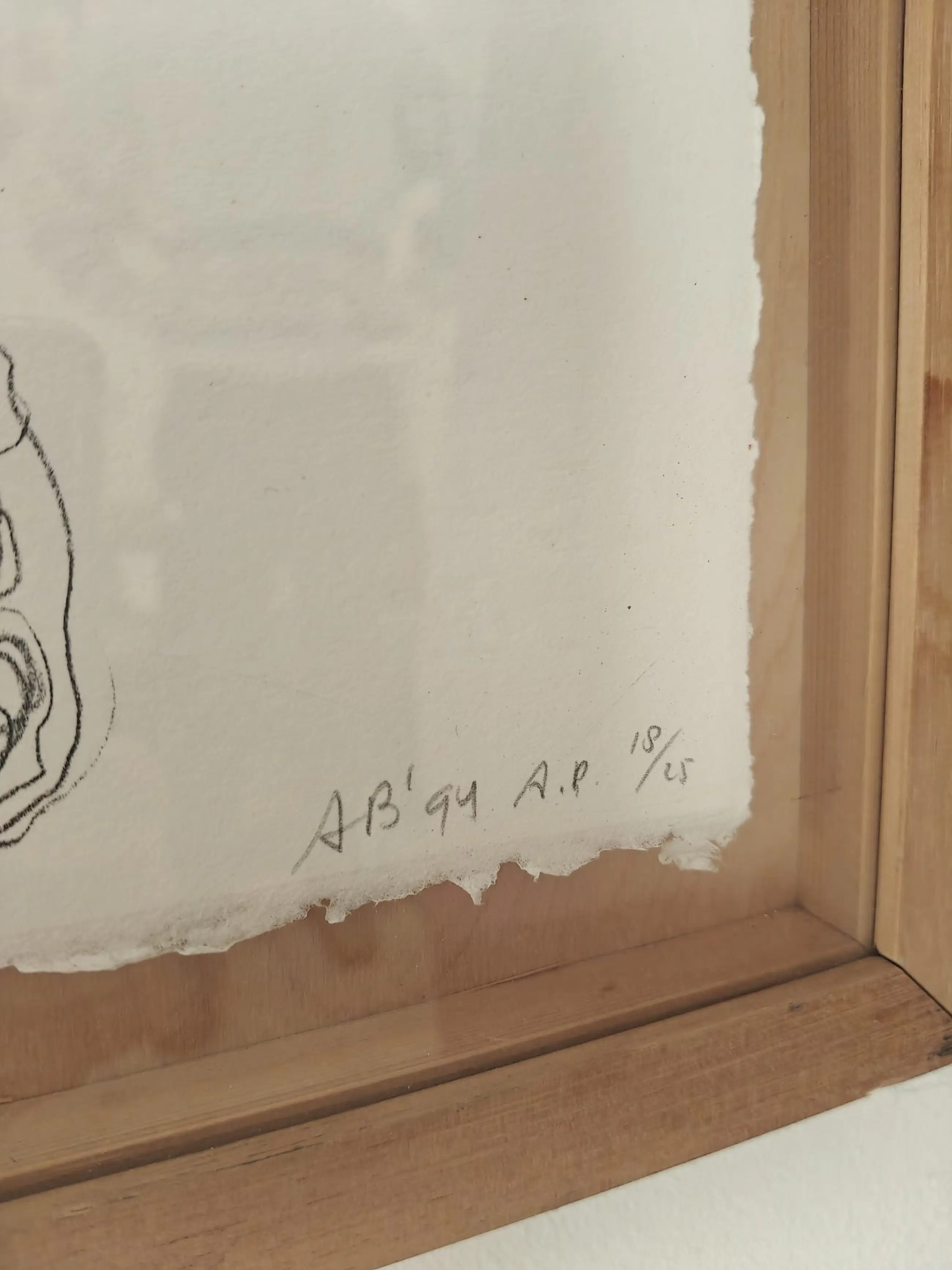 Zeefdruk van kunstenaar Ansuya Blom. Gedrukt door zeefdrukker Zeger Reijers. Ingelijst in houten lijst, licht beschadigd: zie foto’s.
