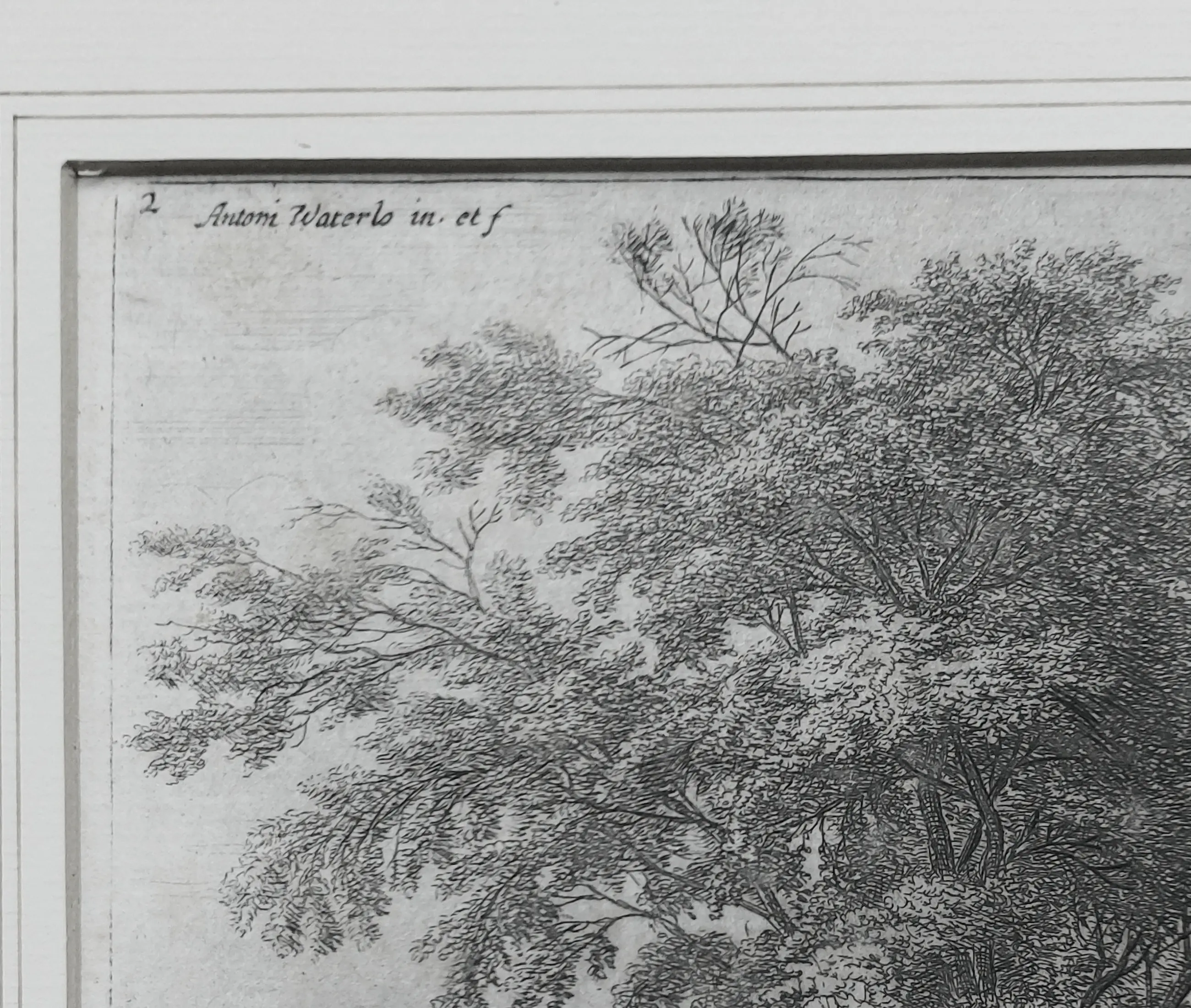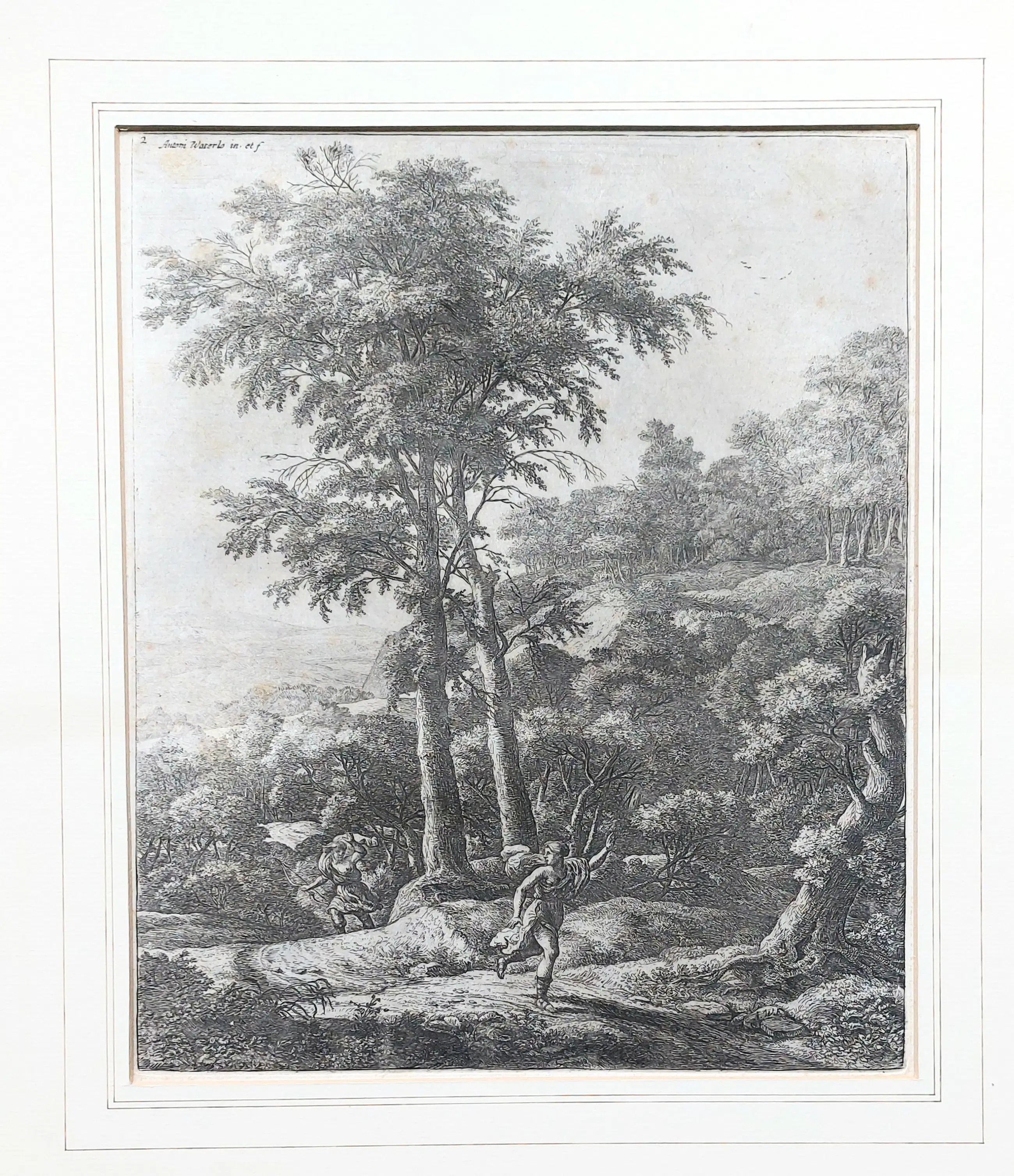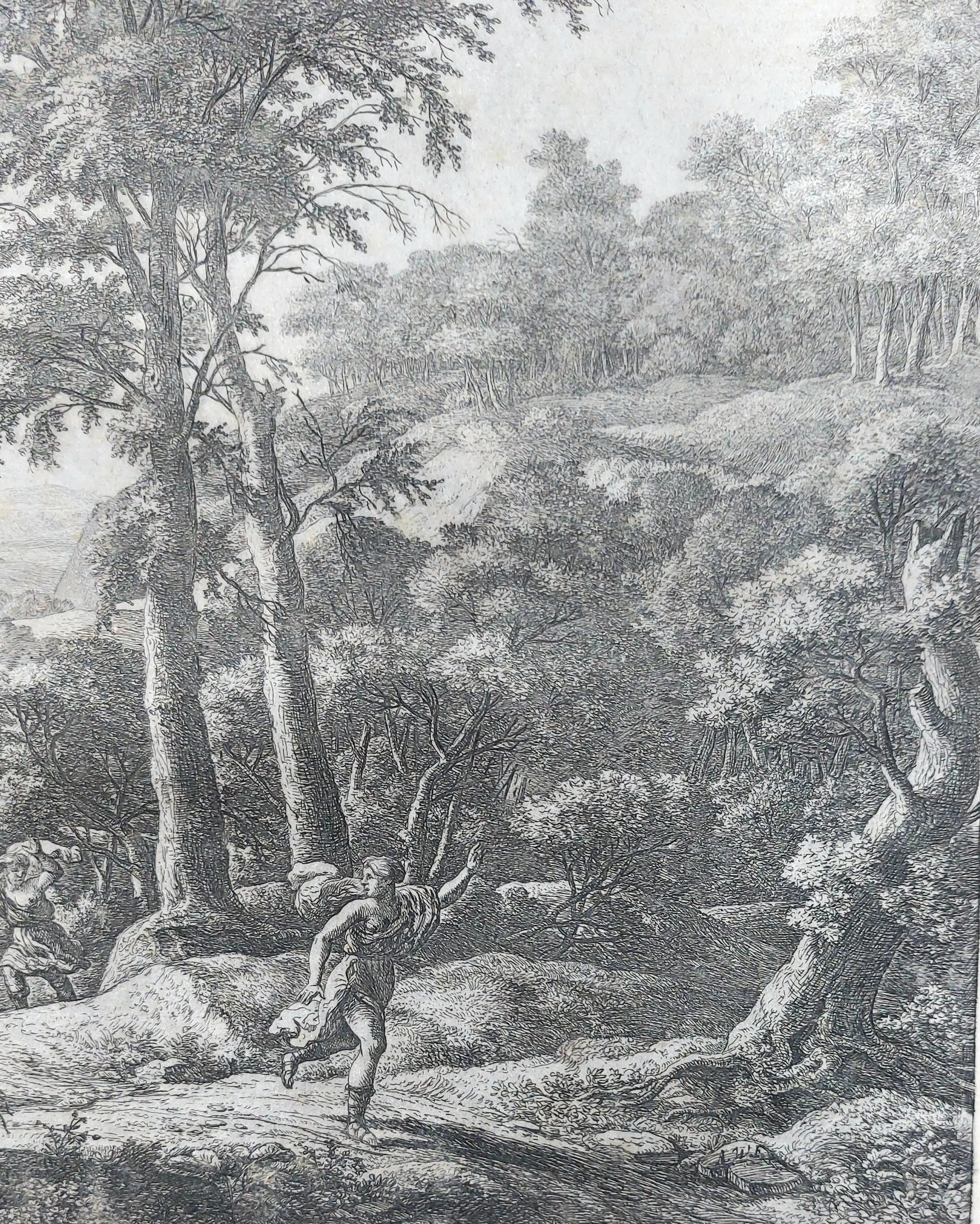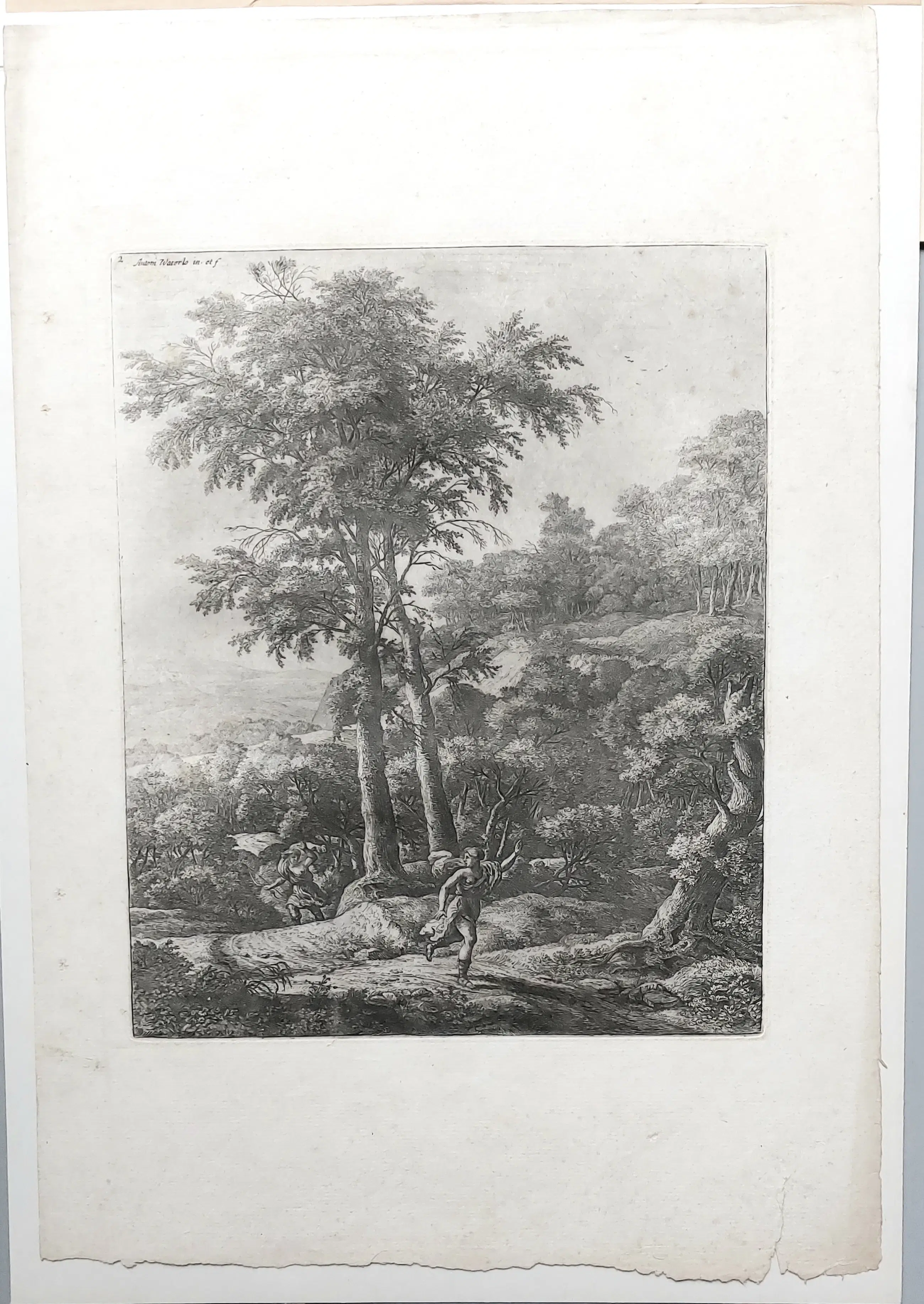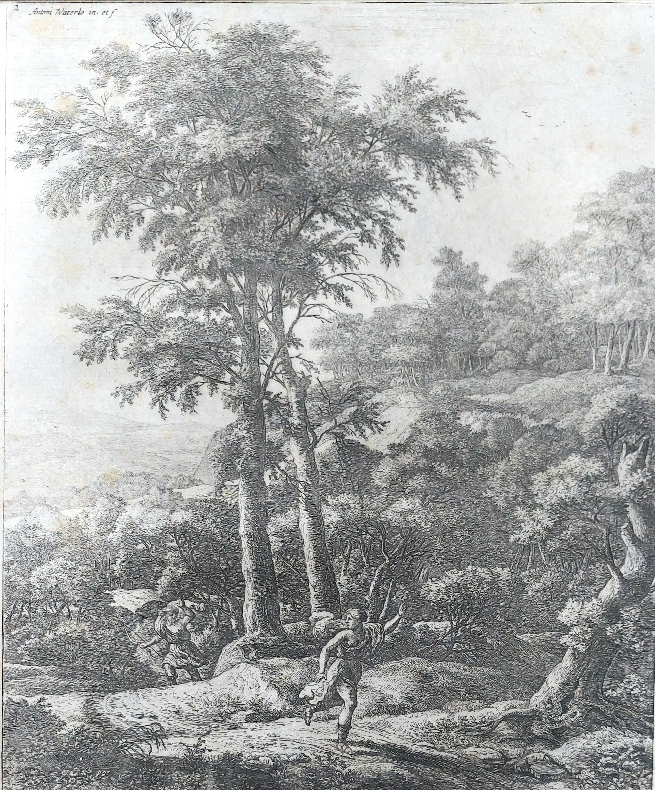 Fraaie ets van Anthonie Watreloo met afwisselend lichte en donkere boompartijen met een romantisch jachttafereel met jager en vluchtende dame (godin van de jacht Artemis ??)