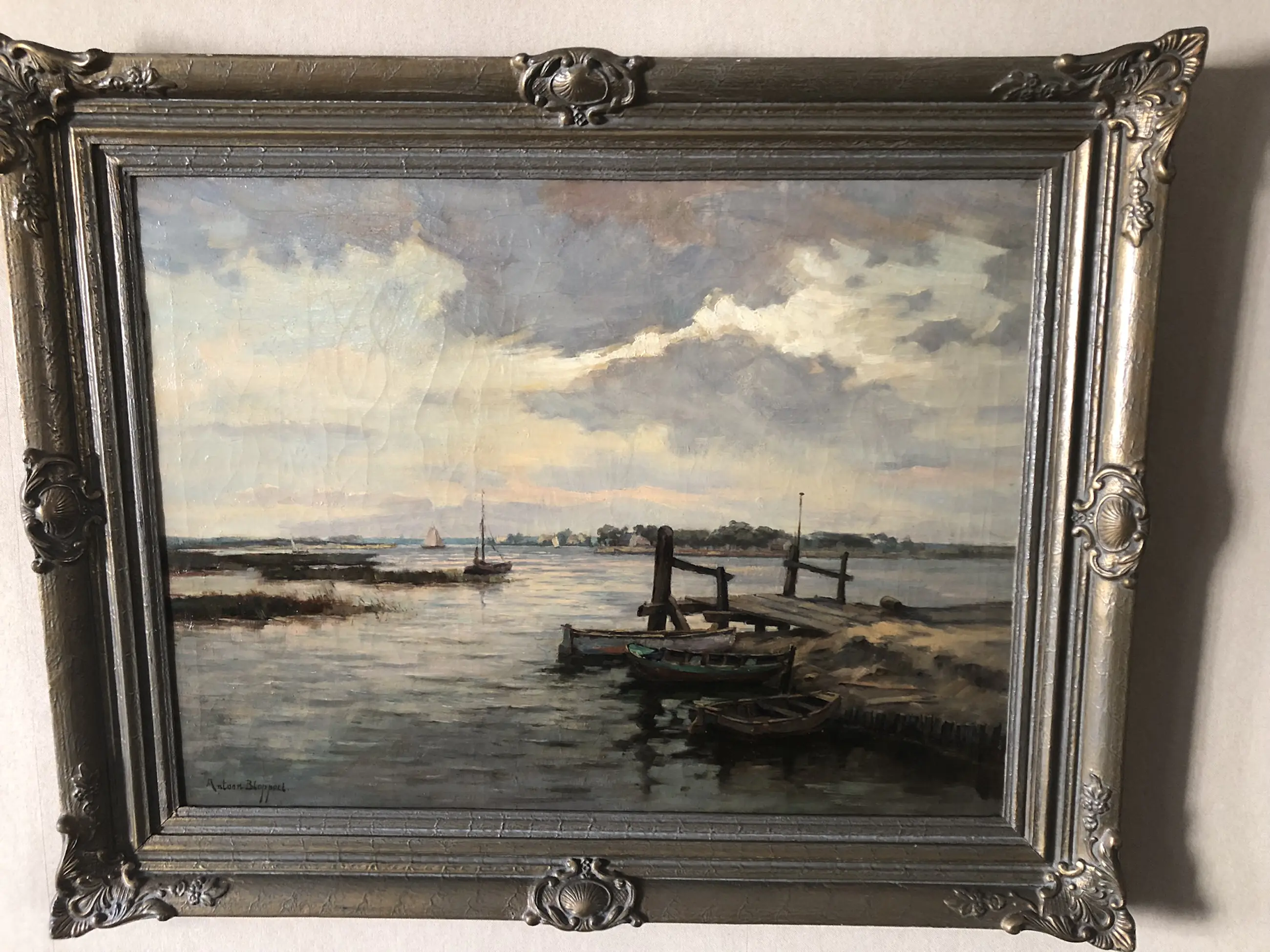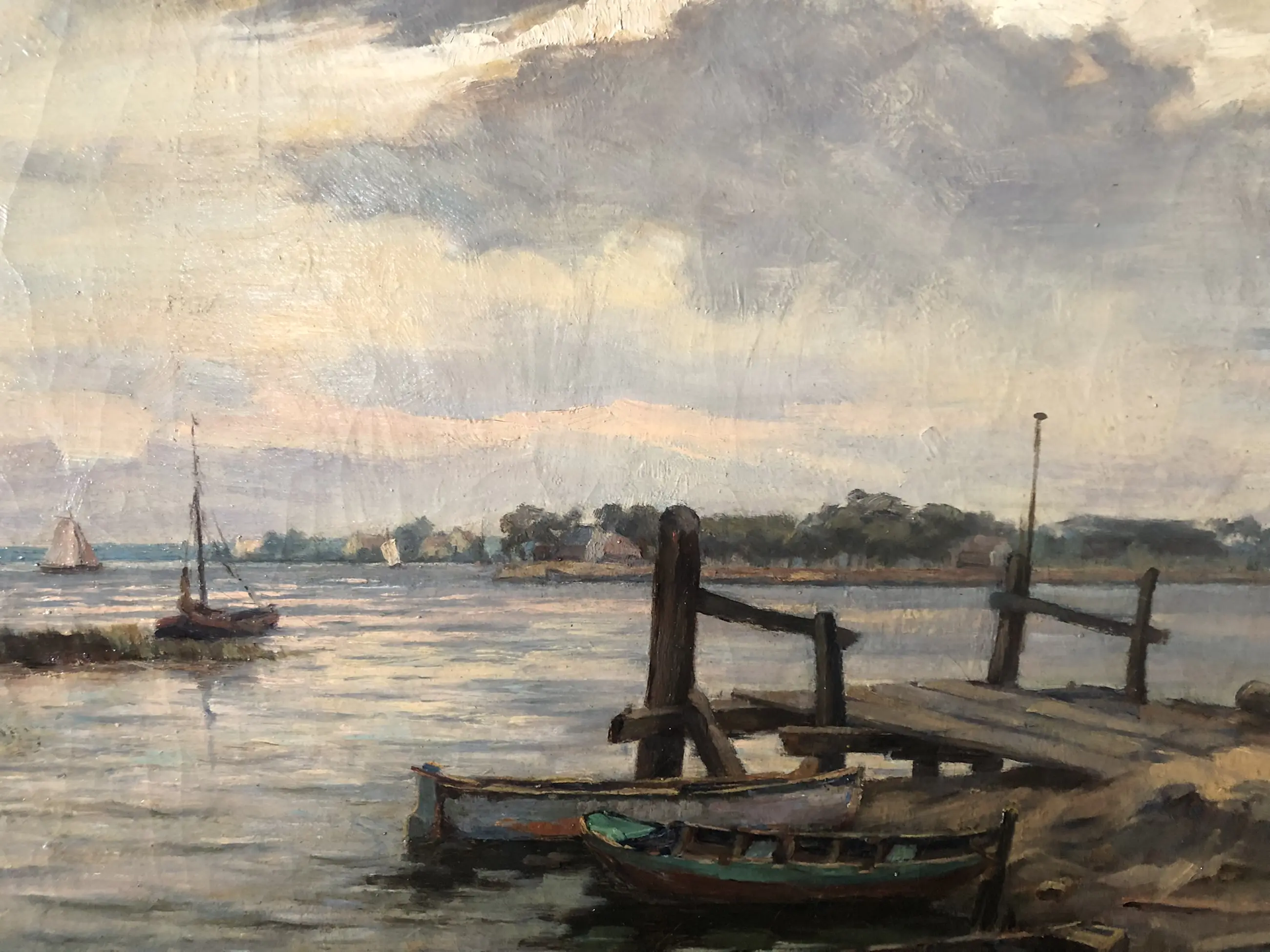 Prachtig vergezicht over een plas. Steiger en roeiboot op de voorgrond.Zeilschip in de verte geeft diepte. Mooie wolkenlucht. Schilderij heeft de tand des tijds craquelé en is ingelijst in een fraaie gestoken antieke lijst. Is gesigneerd onderaan links.